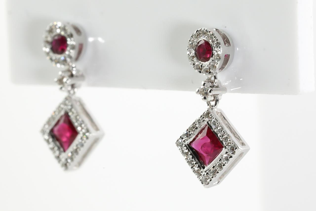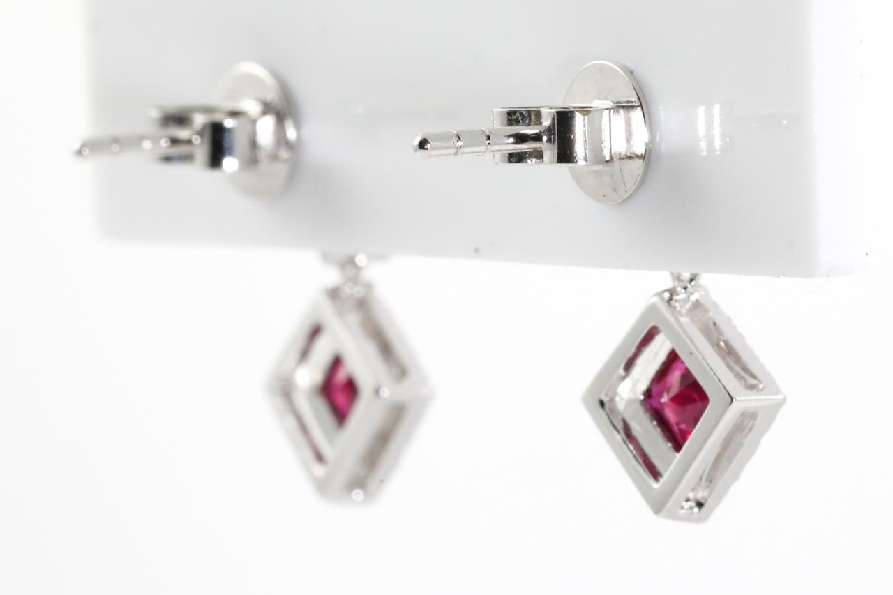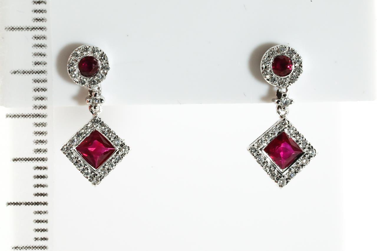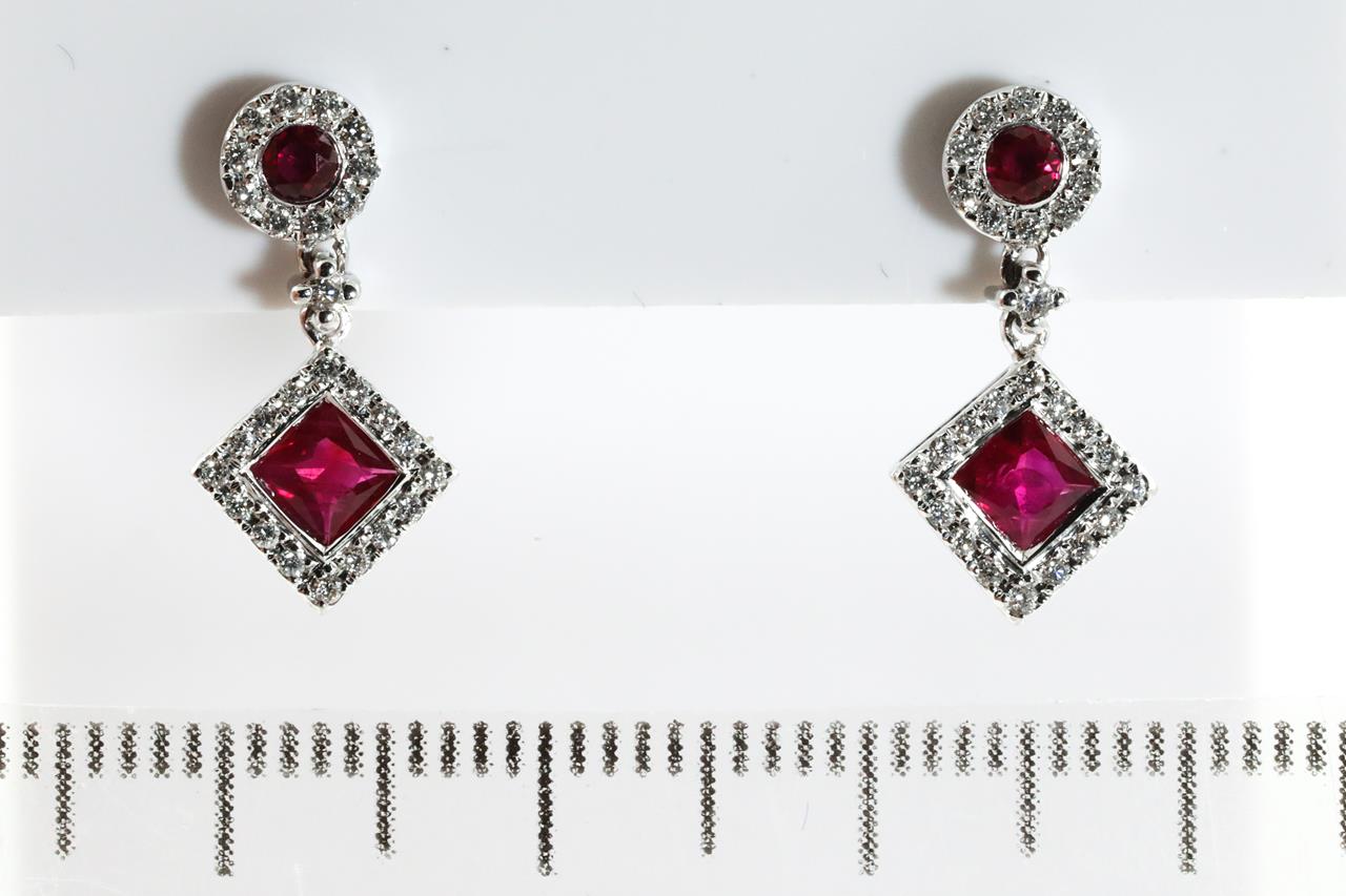 Ruby and Diamond Earrings with square and round Rubies totalling approximately 0.78cts and round Diamonds totalling approximately 0.50cts (Estimated grading: H SI-P1). 18ct white gold. Weight 2.8g. (Pre-owned)