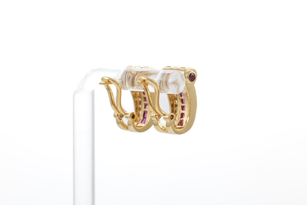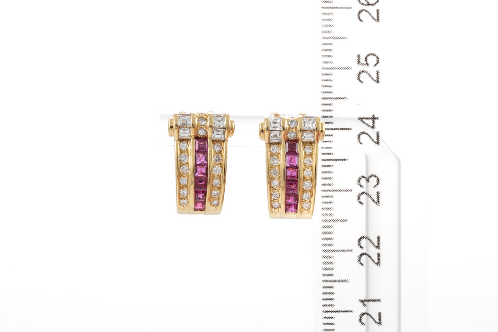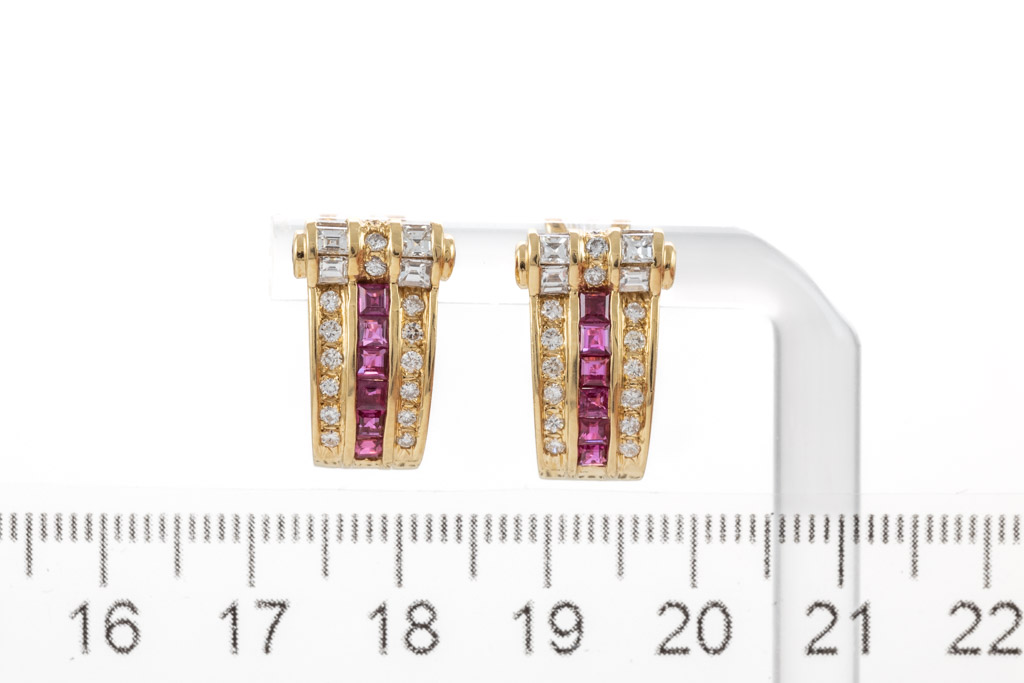Ruby and Diamond clip-on earrings (for pierced ears) with carre cut Rubies totalling 0.57cts and round & carre cut Diamonds totalling 0.62cts (Estimated grading: G SI). 18ct yellow gold. Weight: 9.1g. (Pre-owned)