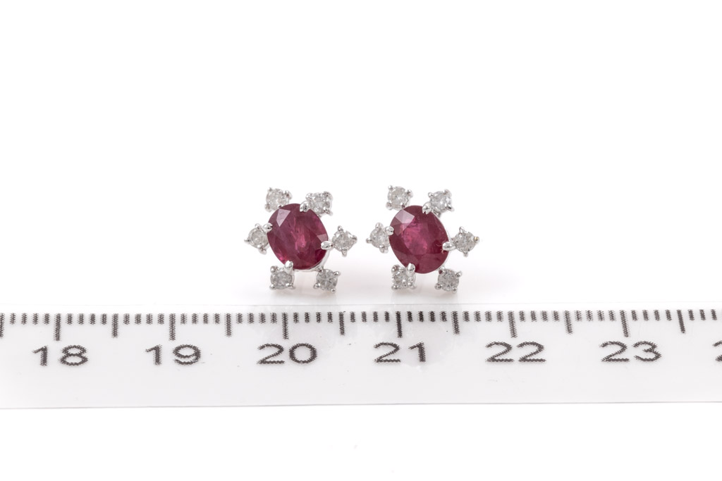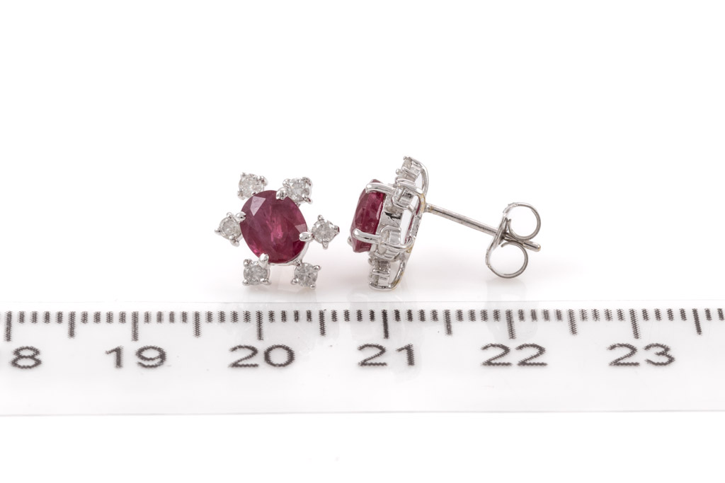 Ruby and Diamond earrings with oval shape Rubies totalling 2.08cts and round Diamonds totalling 0.34cts (Estimated grading: G P1). 18ct white gold. Weight: 2.1g. (Pre-owned)