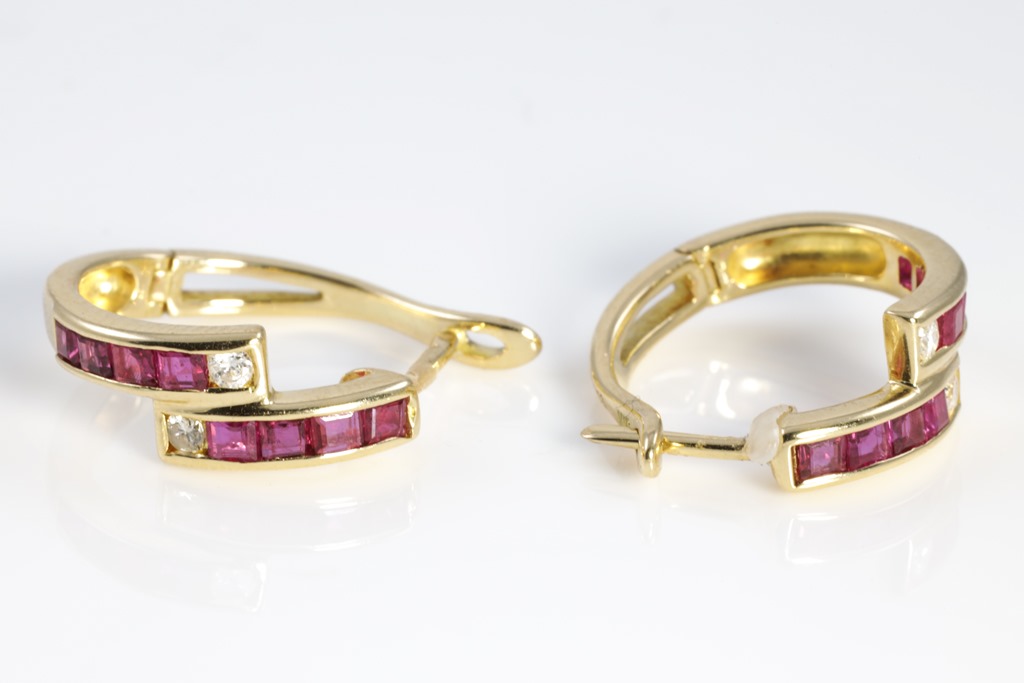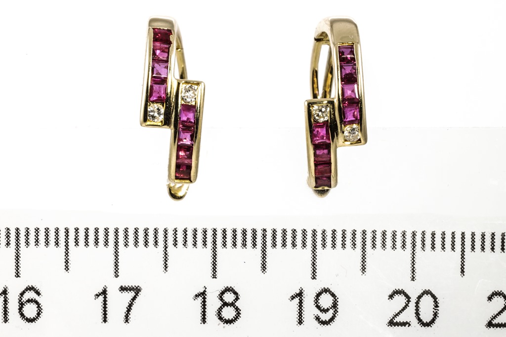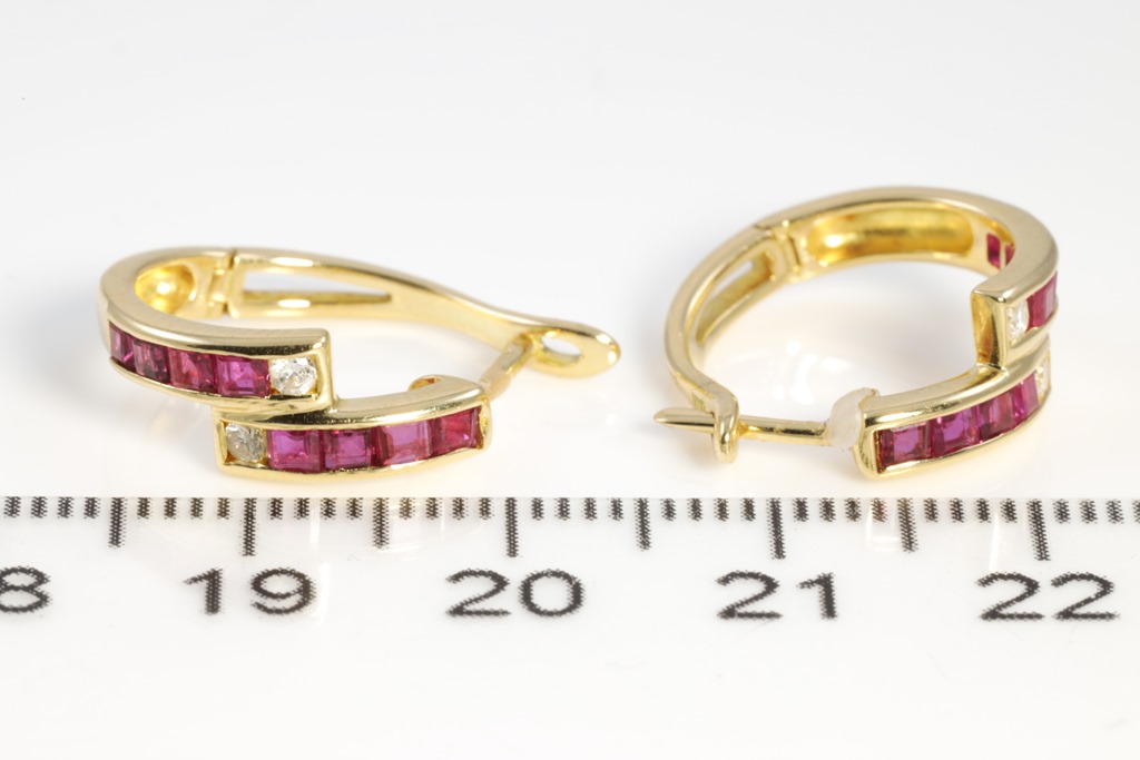 Ruby and Diamond leverback earrings with suare shape Rubies totalling 1.6cts and round Diamonds totalling 0.11cts. 18ct yellow gold. Weight: 4.3g. (Pre-owned)