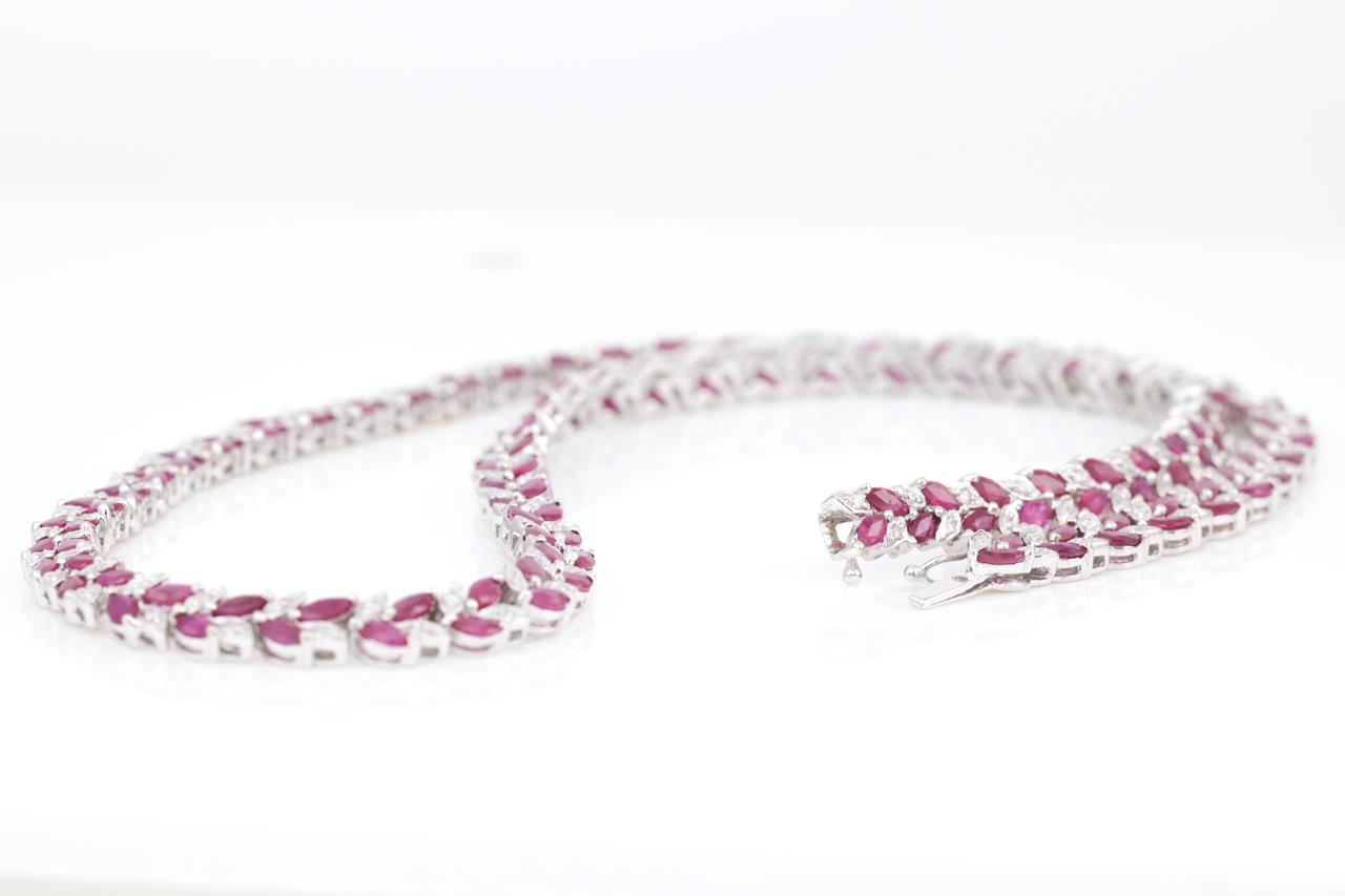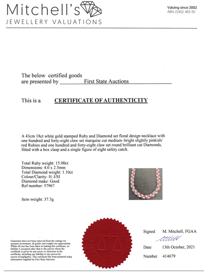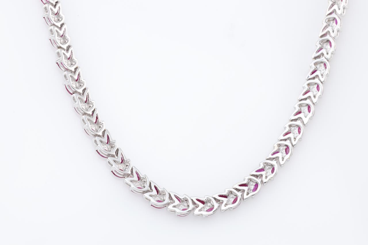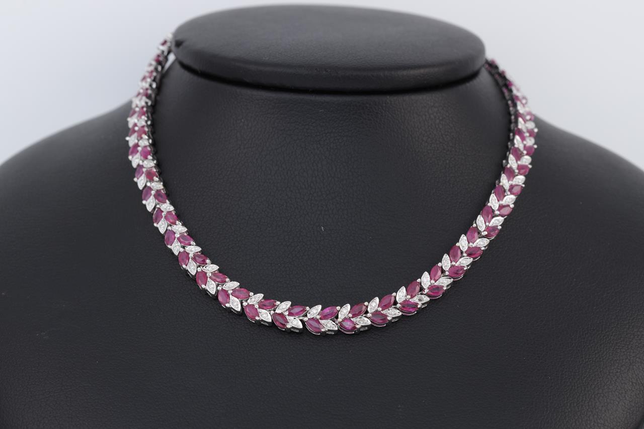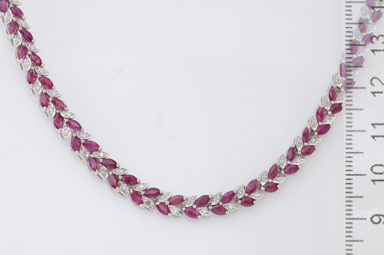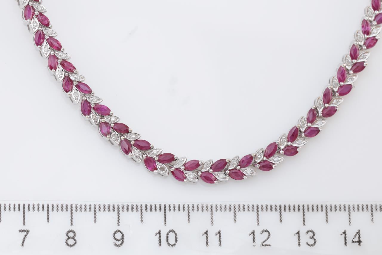 Ruby and Diamond necklace with marquise cut Rubies totalling 15.00cts and Diamonds totalling 1.10cts (Estimated grading: H-I SI). 18ct white gold. Length: 43cm. Weight: 37.3g. With certificate #414679. (Pre-owned)