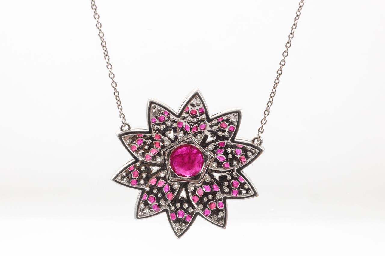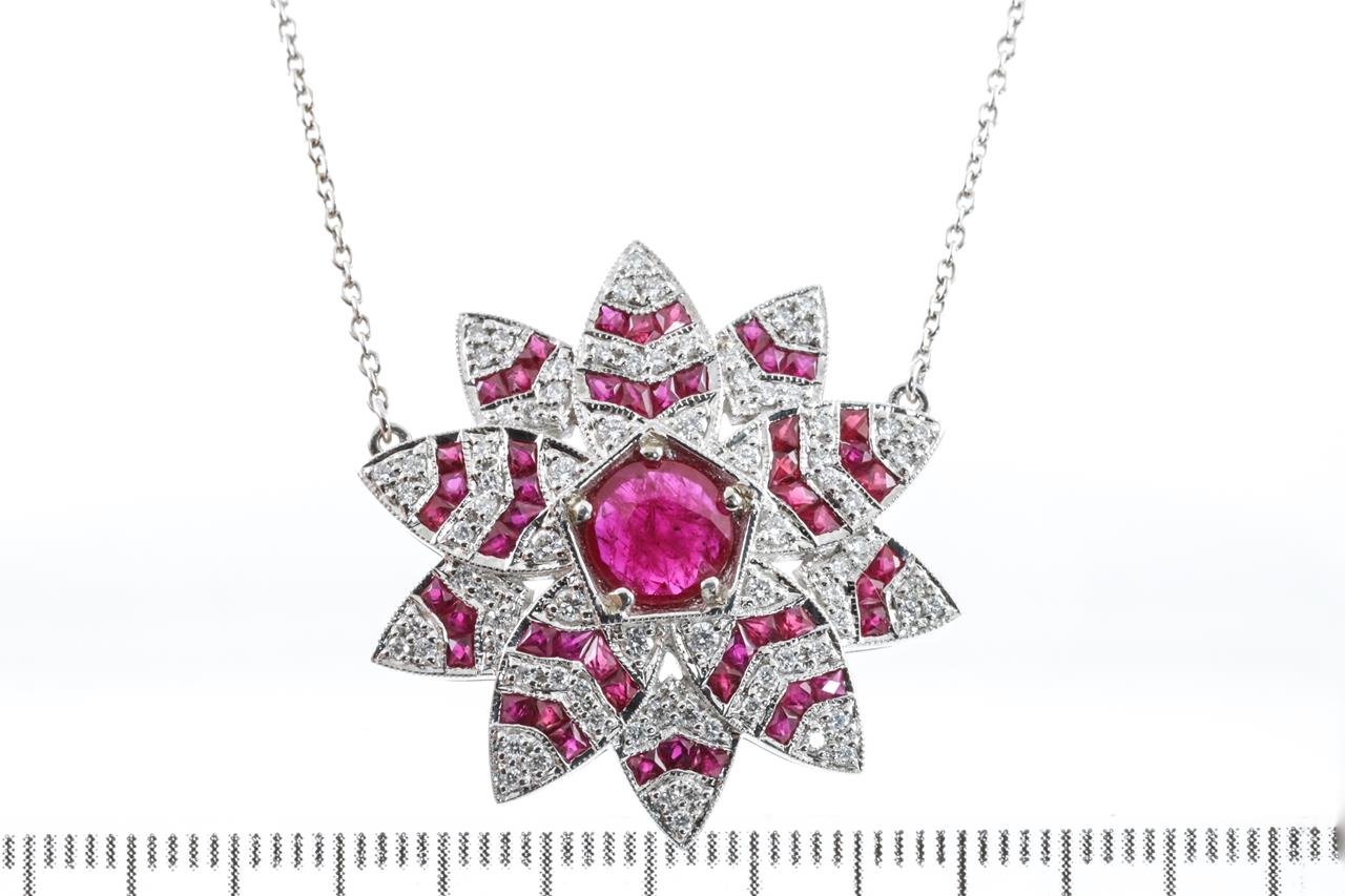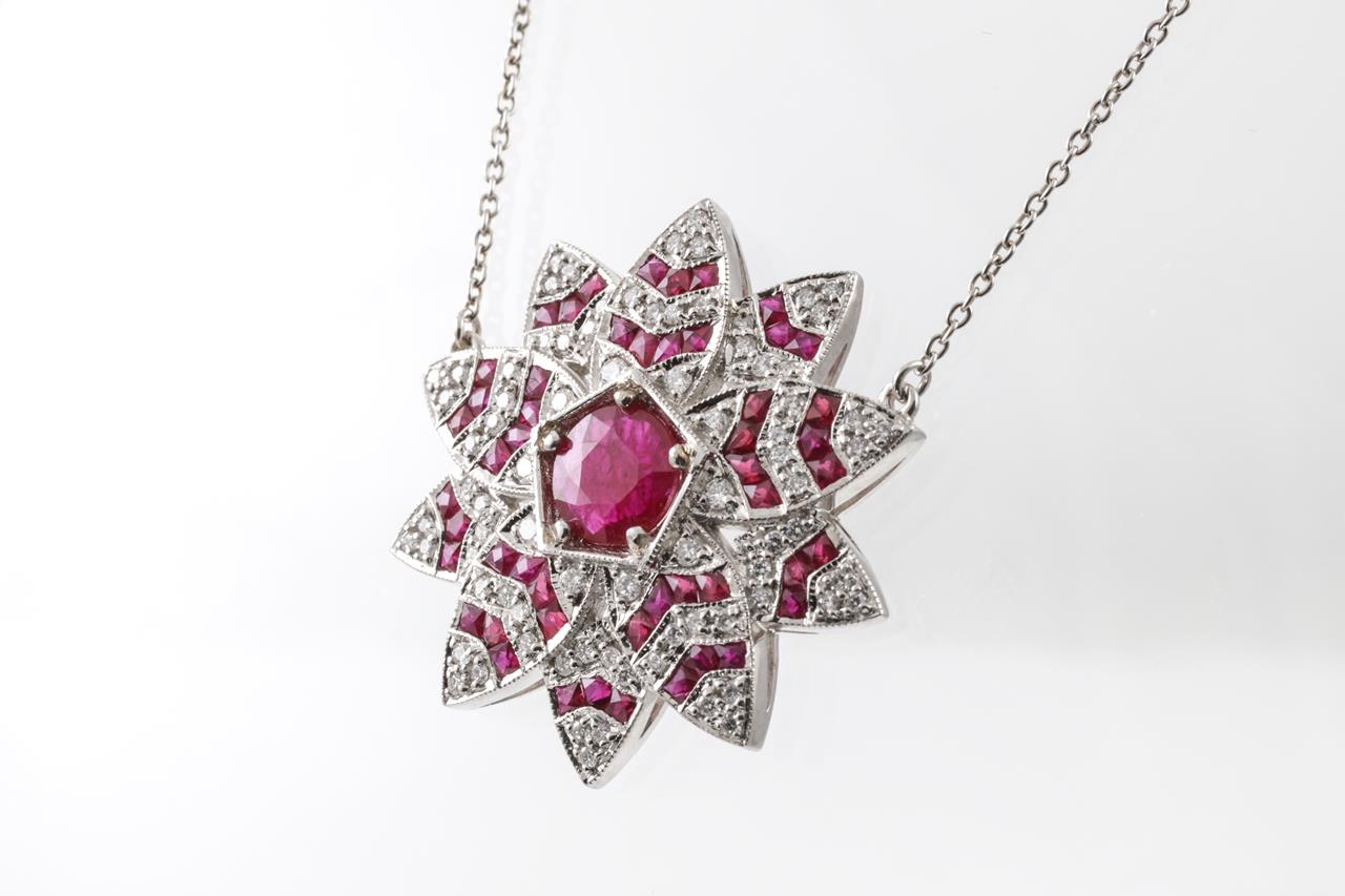 Lotus shaped necklace with centre round cut natural Burmese Ruby of 1.13ct (with GSL report #AA66044/2), fancy cut Rubies totalling approximately 2.05cts and round Diamonds totalling approximately 1.15cts (Estimated grading G-H SI). 18ct white gold. Weight 10.3g. Length 45cm. (As New)