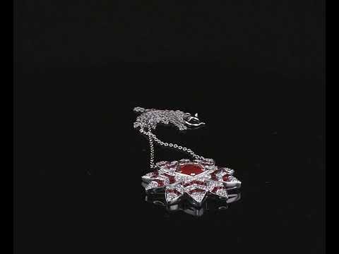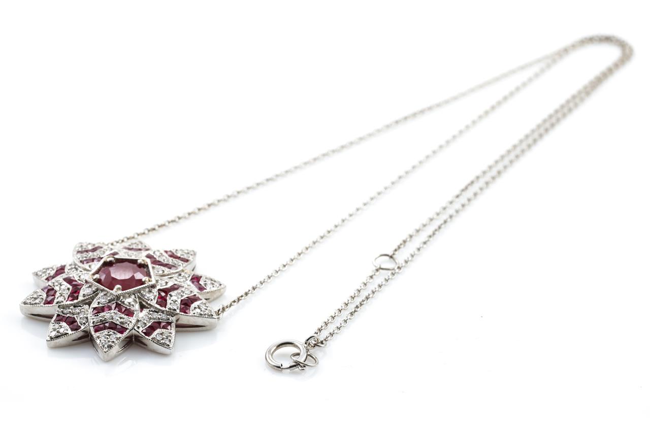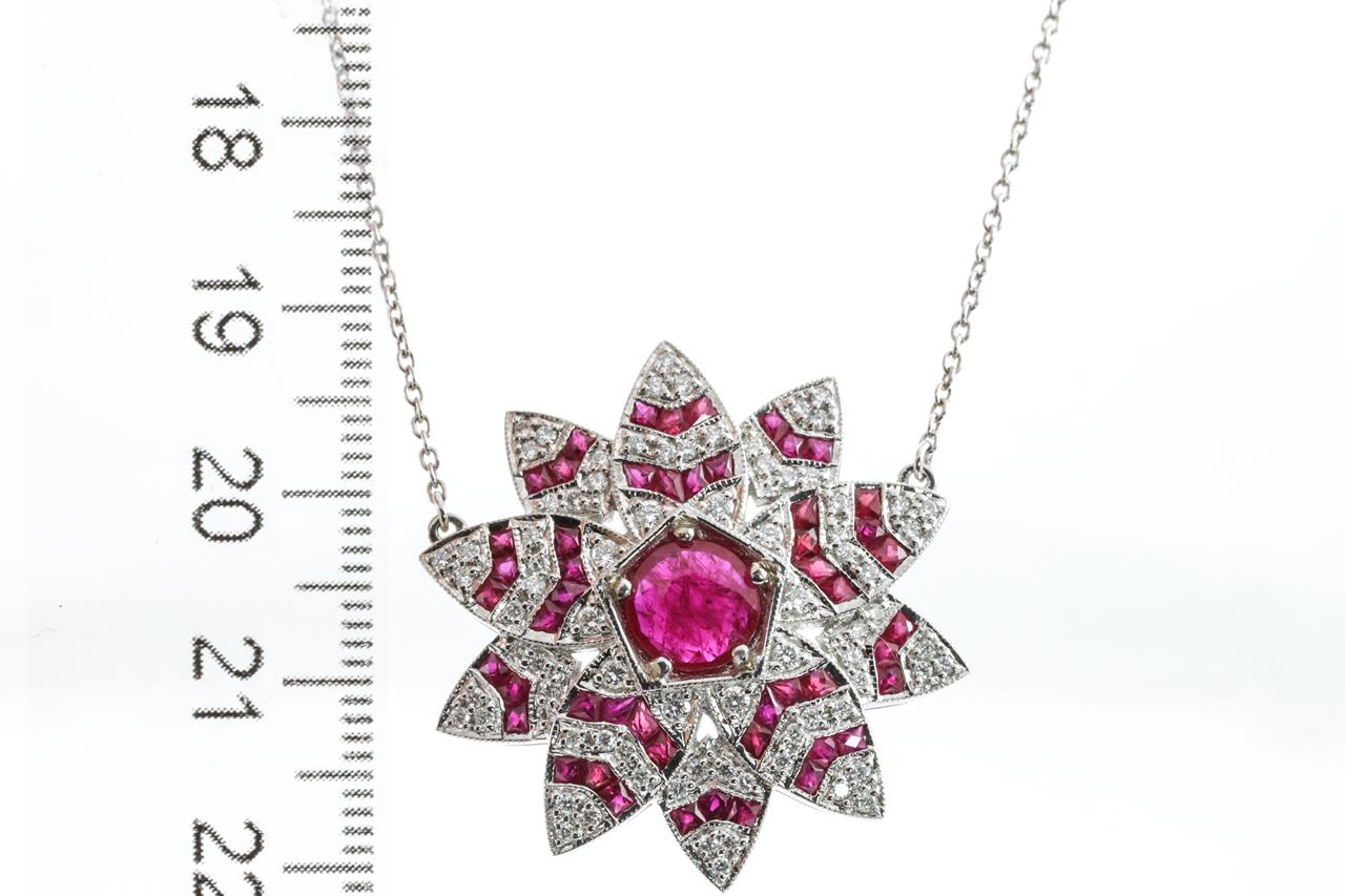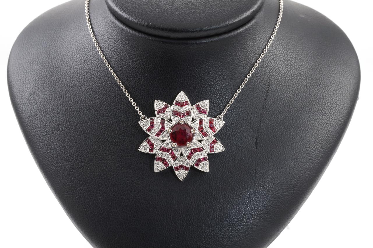 Lotus shaped necklace with centre round cut natural Burmese Ruby of 1.13ct (with GSL report #AA66044/2), fancy cut Rubies totalling approximately 2.05cts and round Diamonds totalling approximately 1.15cts (Estimated grading G-H SI). 18ct white gold. Weight 10.3g. Length 45cm. (As New)