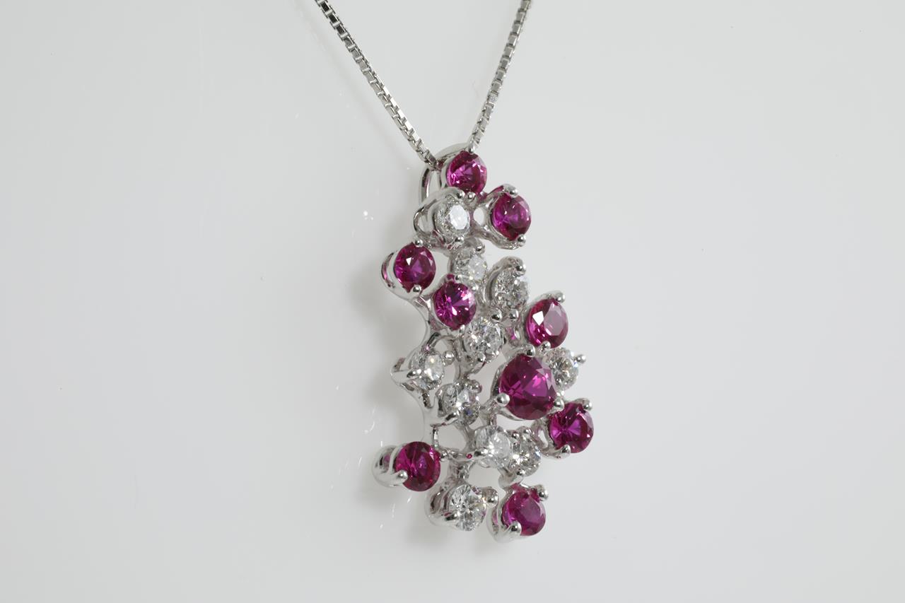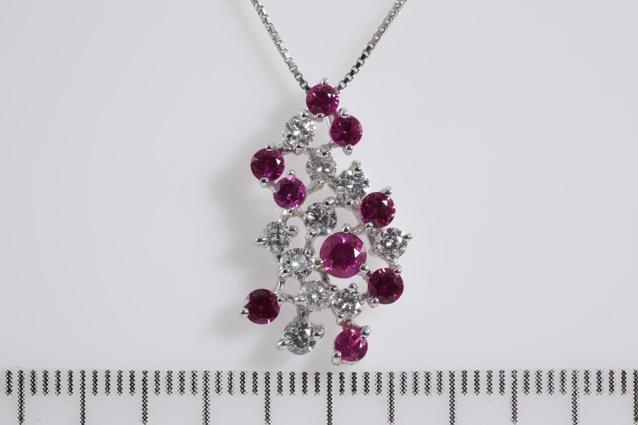 Ruby and Diamond pendant with round Rubies totalling 1.13cts and Diamonds totalling 0.70cts (Estimated grading: H-I SI). 18ct white gold with 45cm adjustable chain. (Pre-owned)