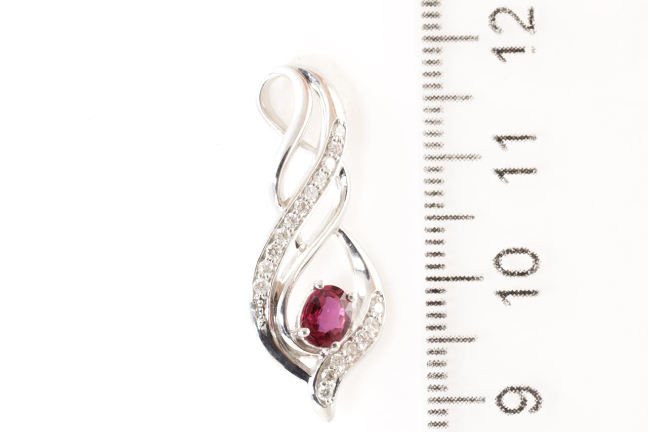 Ruby and Diamond pendant with oval cut central Ruby of 0.45ct and 18 round Diamonds totalling 0.20cts. 14ct white gold. No chain provided. Weight 2.2g. (As New)