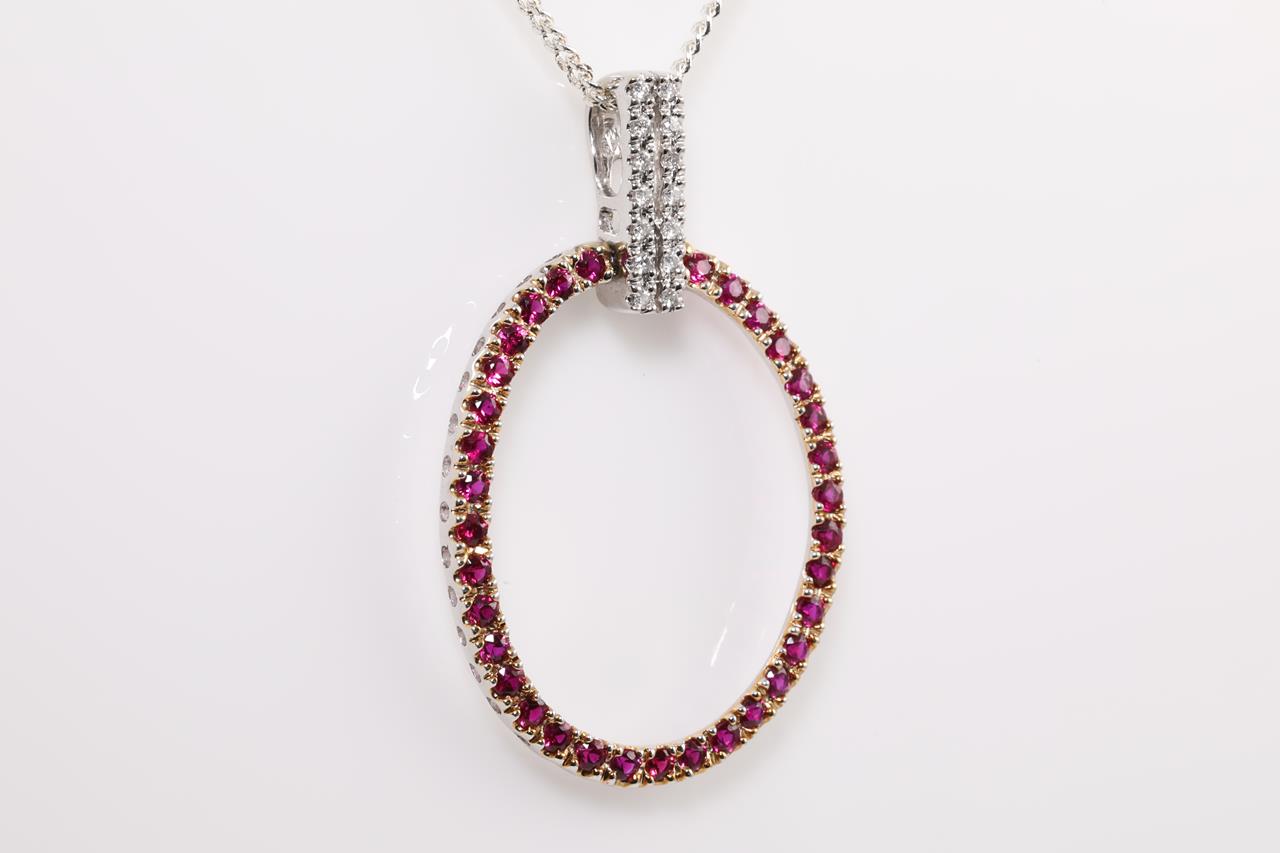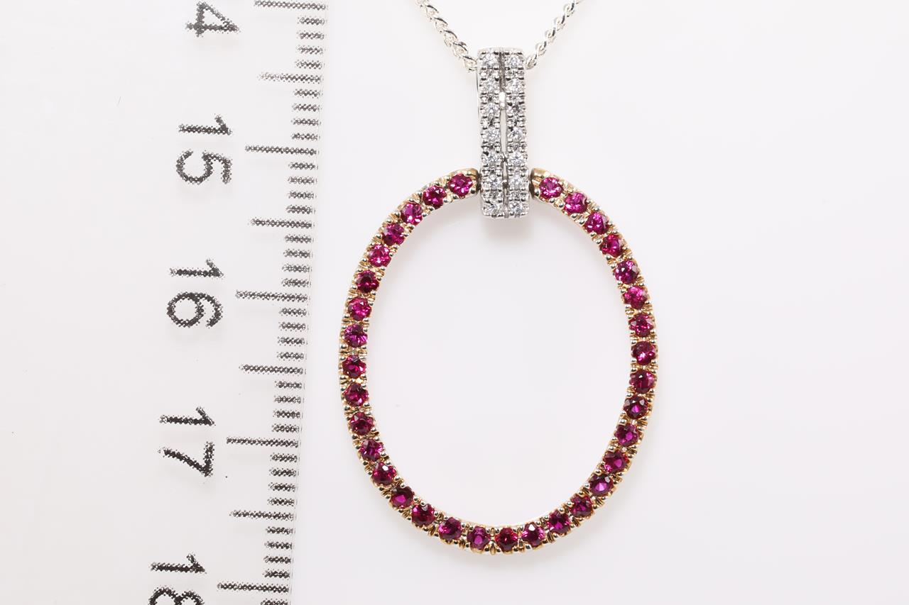Ruby and Diamond Pendant with round Rubies totalling approximately 0.71cts and round Diamonds totalling approximately 0.15cts. 18ct white and yellow gold. Pendant Weight 2.8g. With display chain (base metal). (As New)