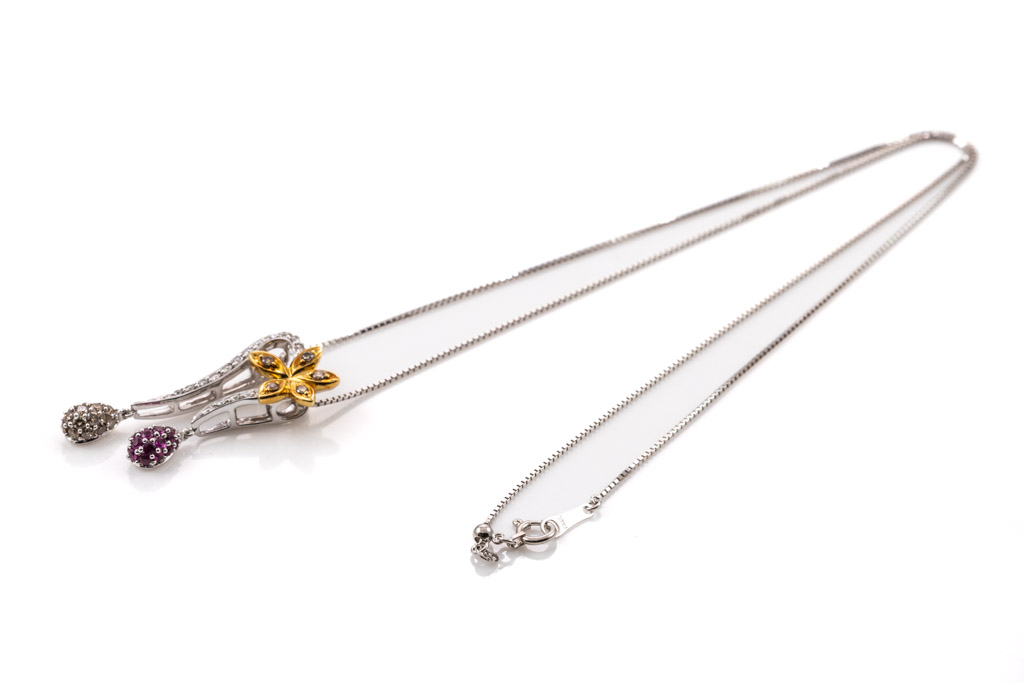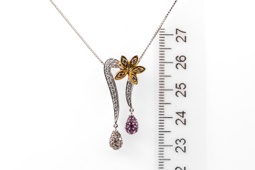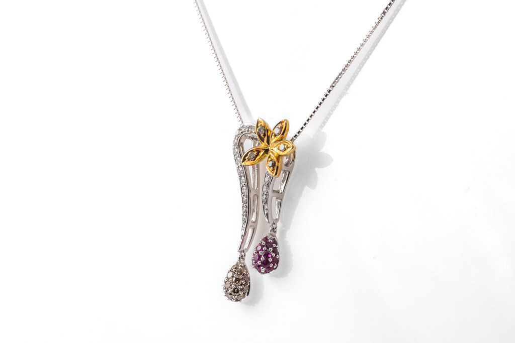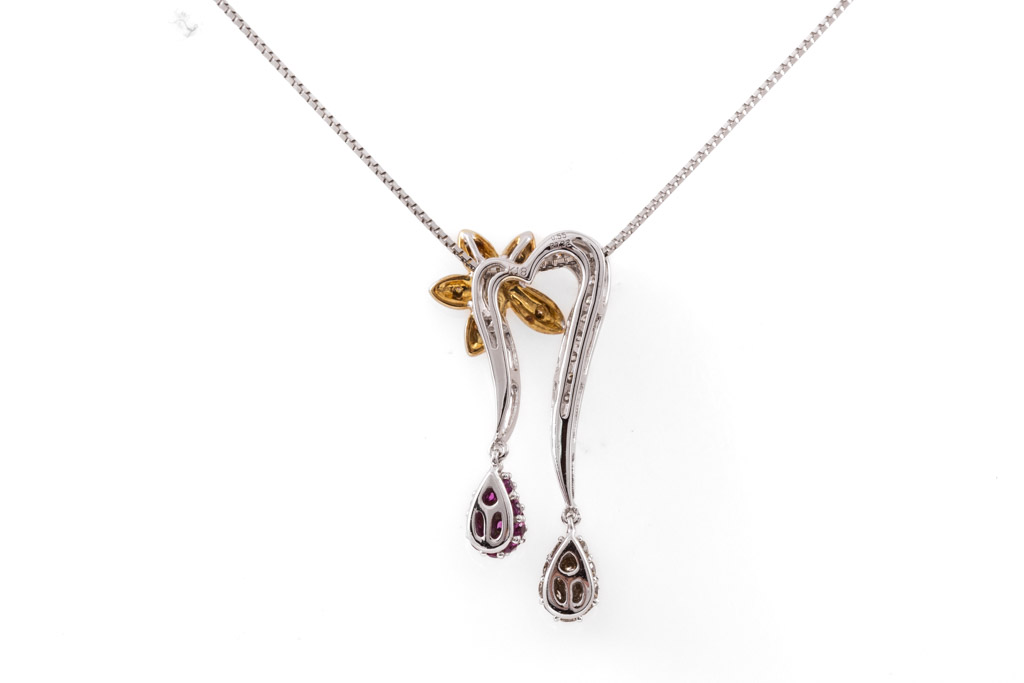 Ruby and Diamond pendant with Rubies totalling 0.32ct and round Diamonds totalling 0.55cts (Estimated grading: Champagne & G-H SI). 18ct yellow and white gold with 18ct whiite gold adjustable 44cm chain. Weight: 6.8g. (Pre-owned)