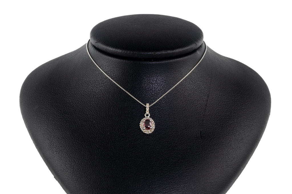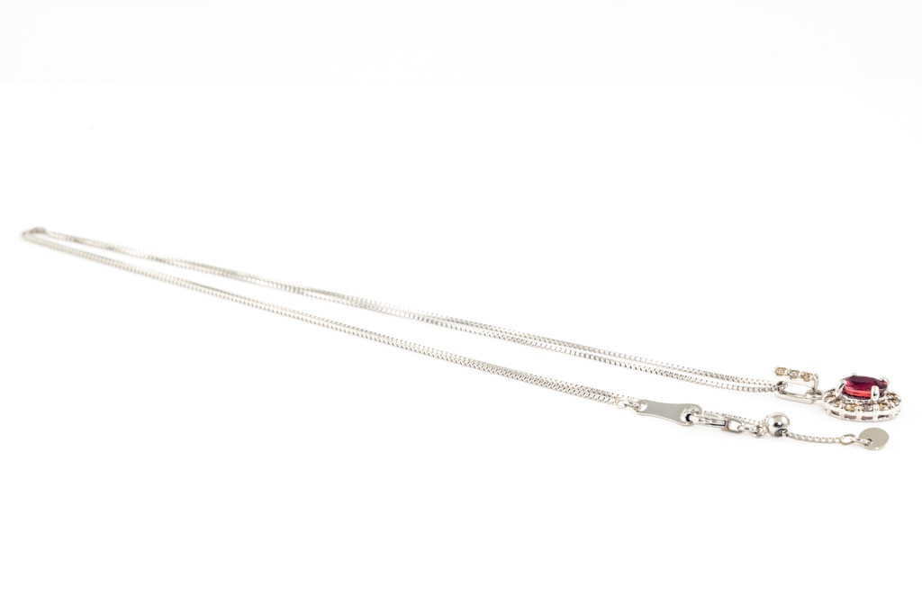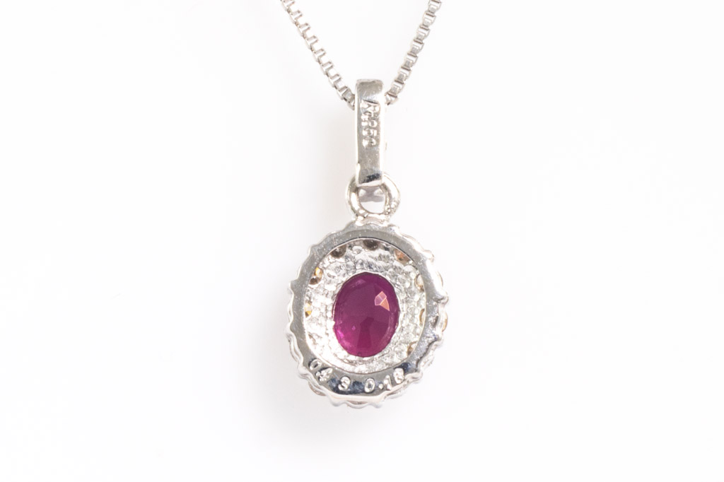 Ruby and Diamond pendant with oval shape Ruby of 0.43ct and round Diamonds totalling 0.18cts. Platinum with platinum adjustable 44cm chain. Weight: 2.5g. (Pre-owned)
