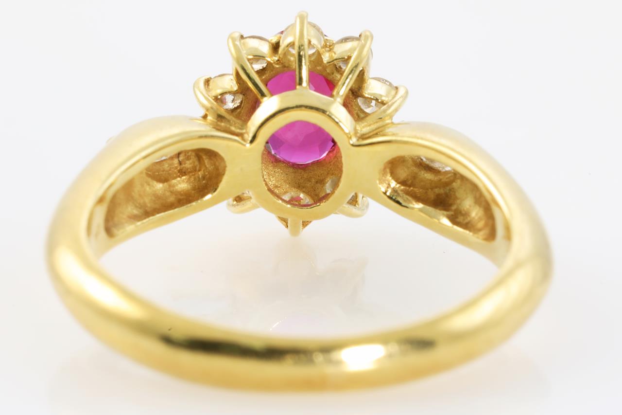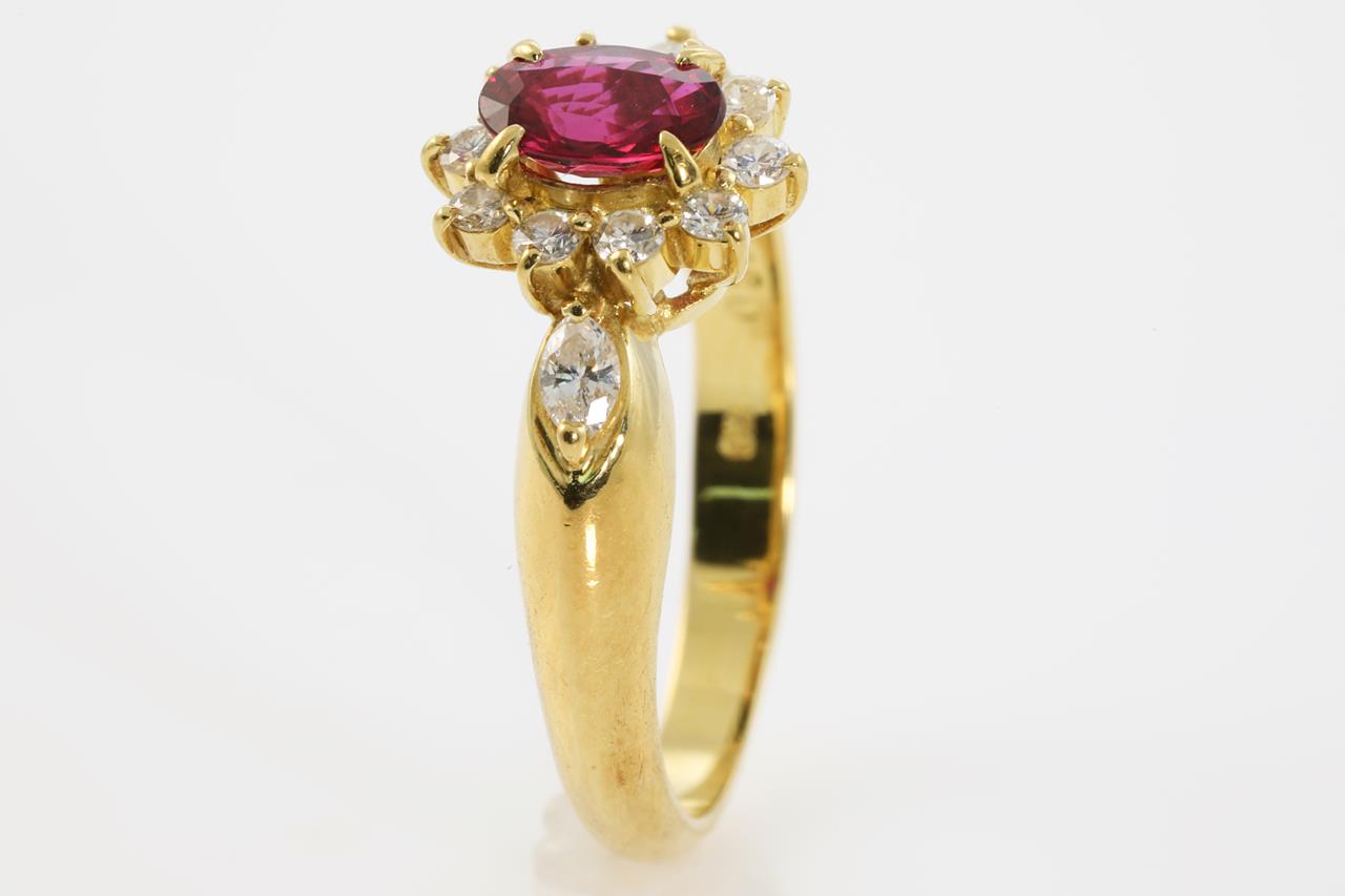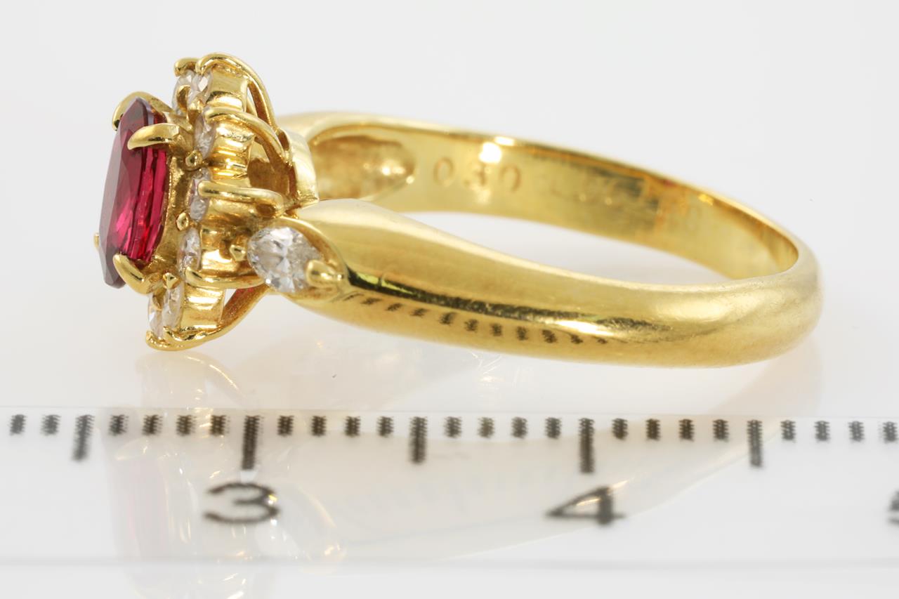 Ruby and Diamond ring with oval cut Ruby of 0.5ct and Diamonds totalling 0.30cts (estimated grading: H-I SI-P1). 18ct yellow gold. Ring size I1/2. Weight: 3.9g (Pre-owned)