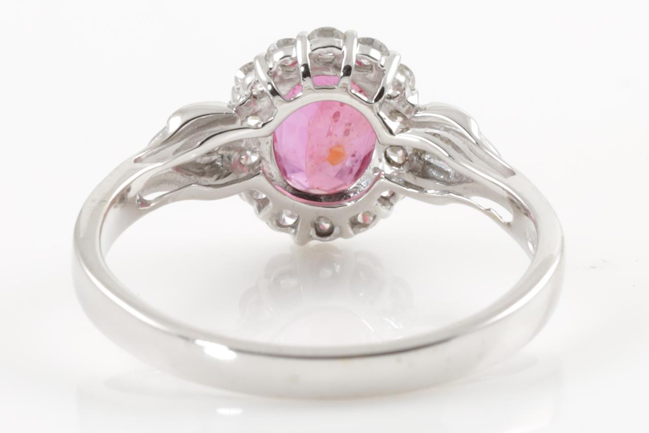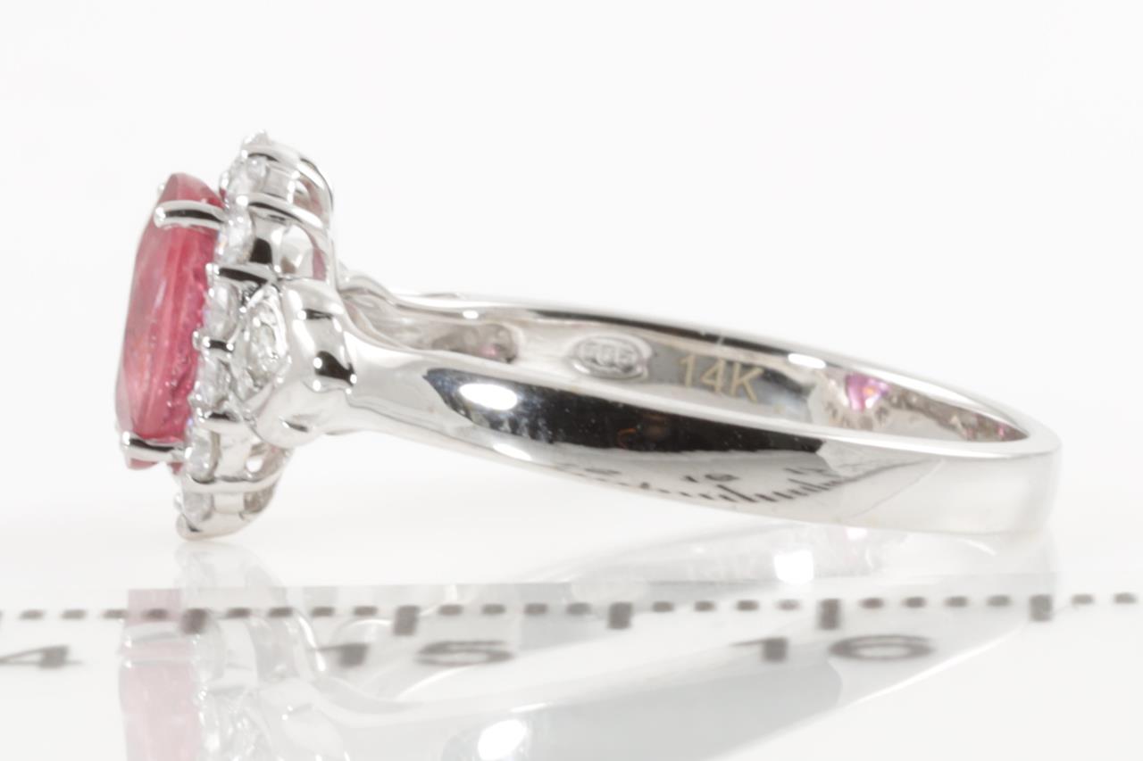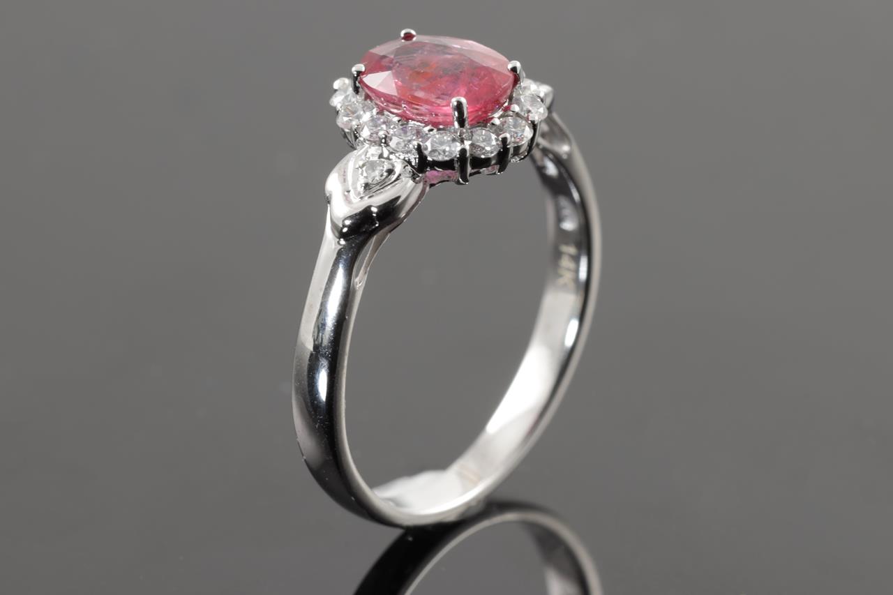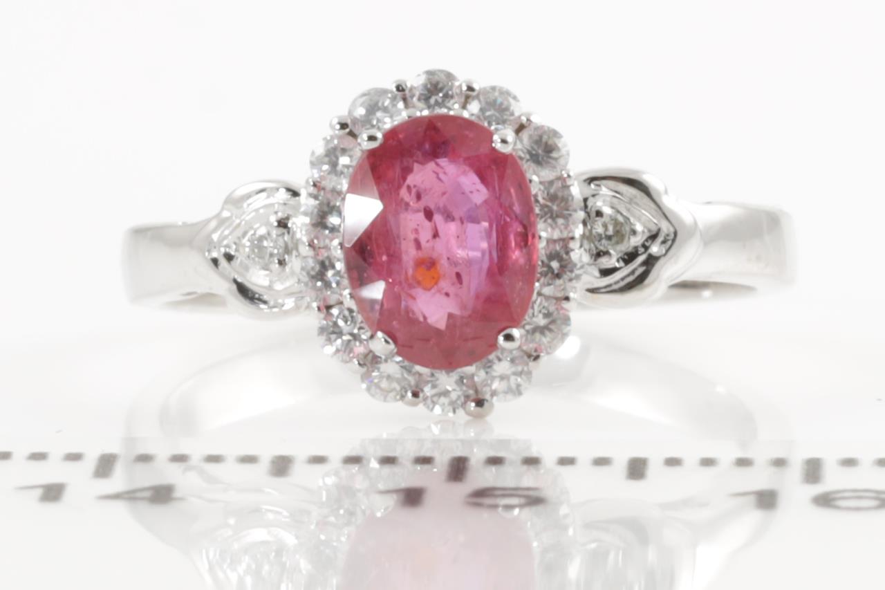 Ruby and Diamond Ring with oval shape Ruby of approximately 1.26ct (with natural fractures) and round Diamond totalling approximately 0.25cts. 14ct white gold. Ring size N - cannot be resized up, down with ring clip. Weight 2.5g. (Pre-owned)