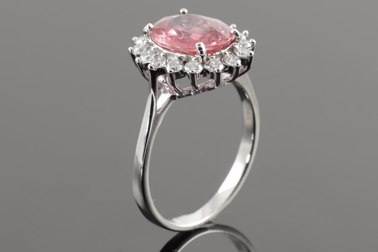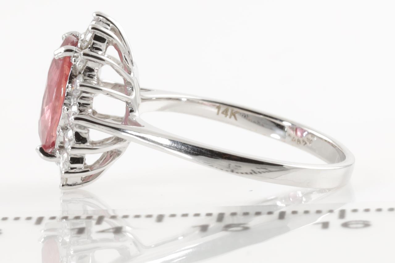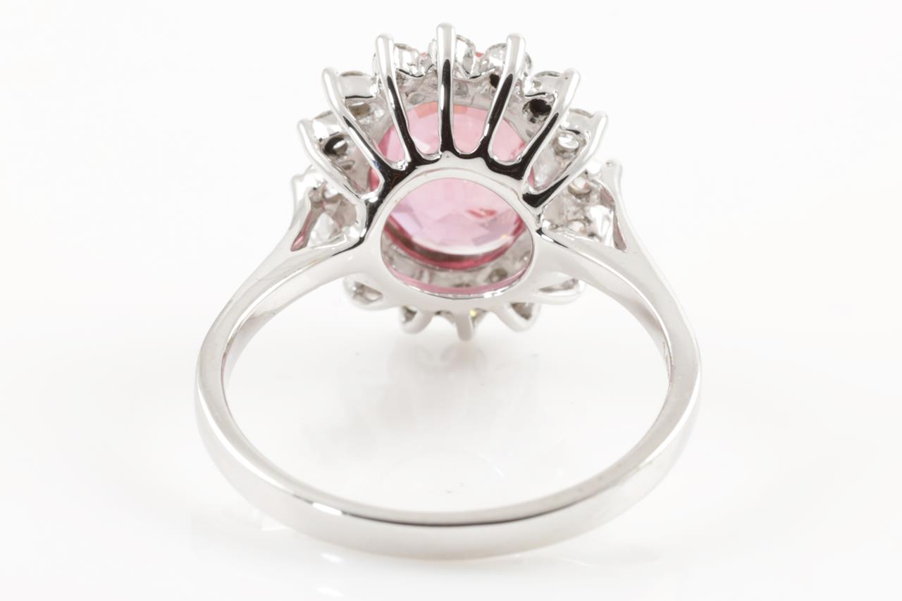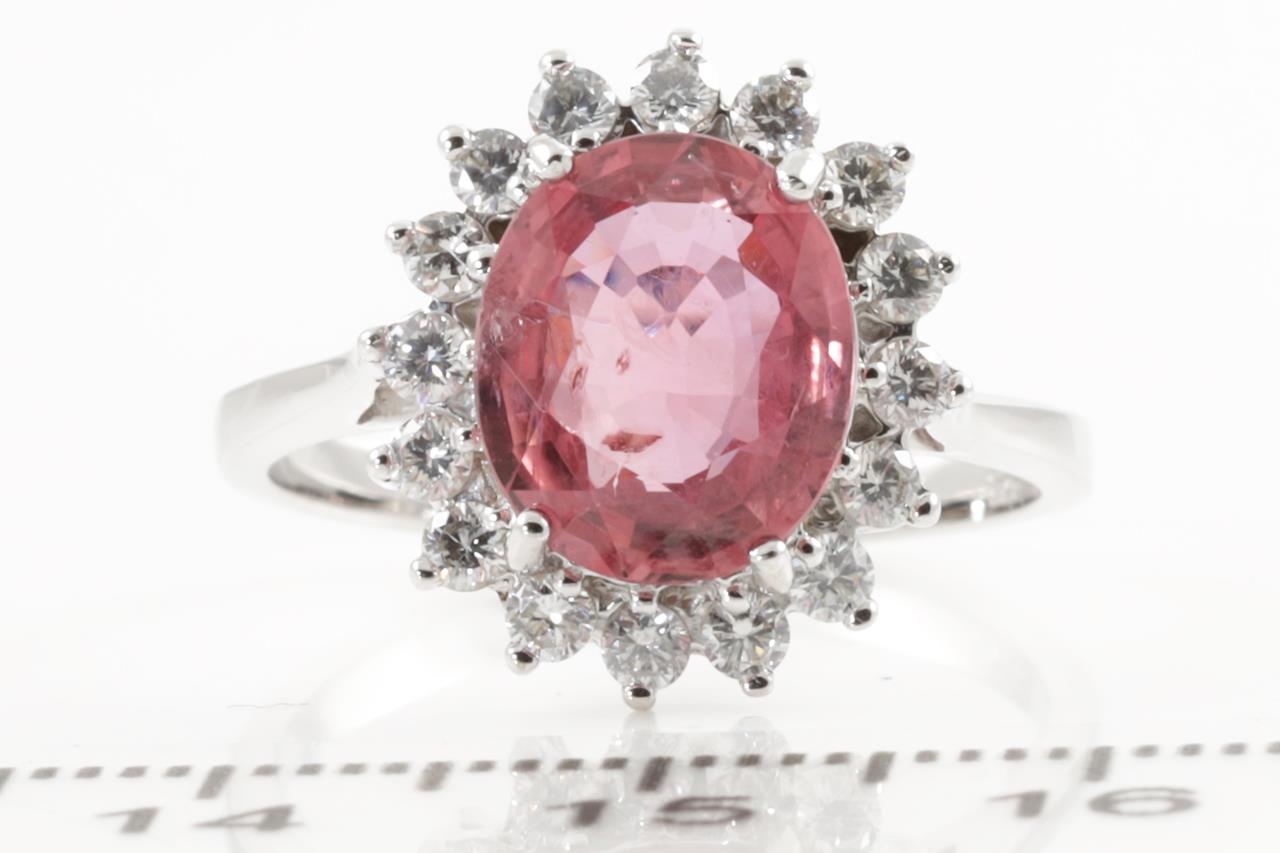 Ruby and Diamond Ring with oval cut Ruby of approximately 3.39ct and round Diamond totalling approximately 0.50cts (Estimated grading: H-I SI). 14ct white gold. Ring size P 1/2. Weight 4.3g. (Pre-owned)