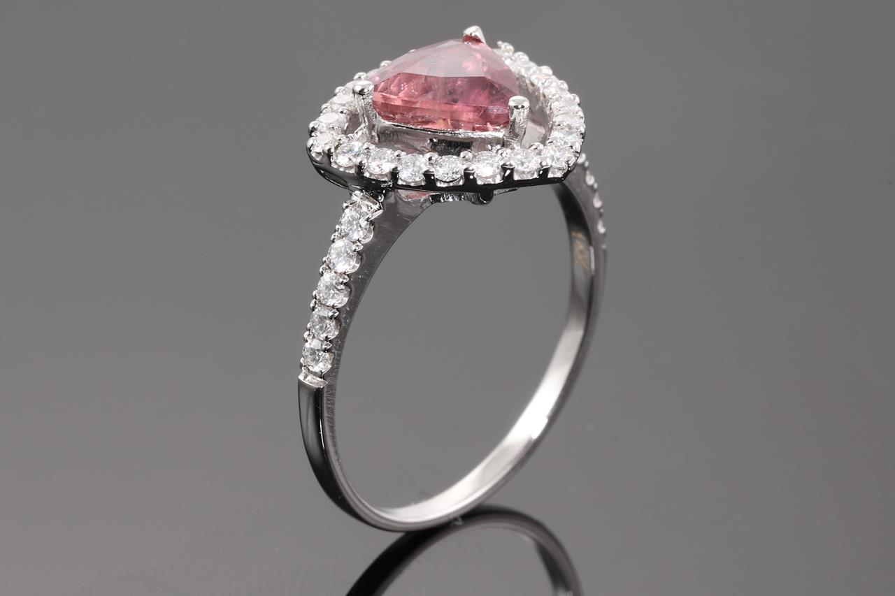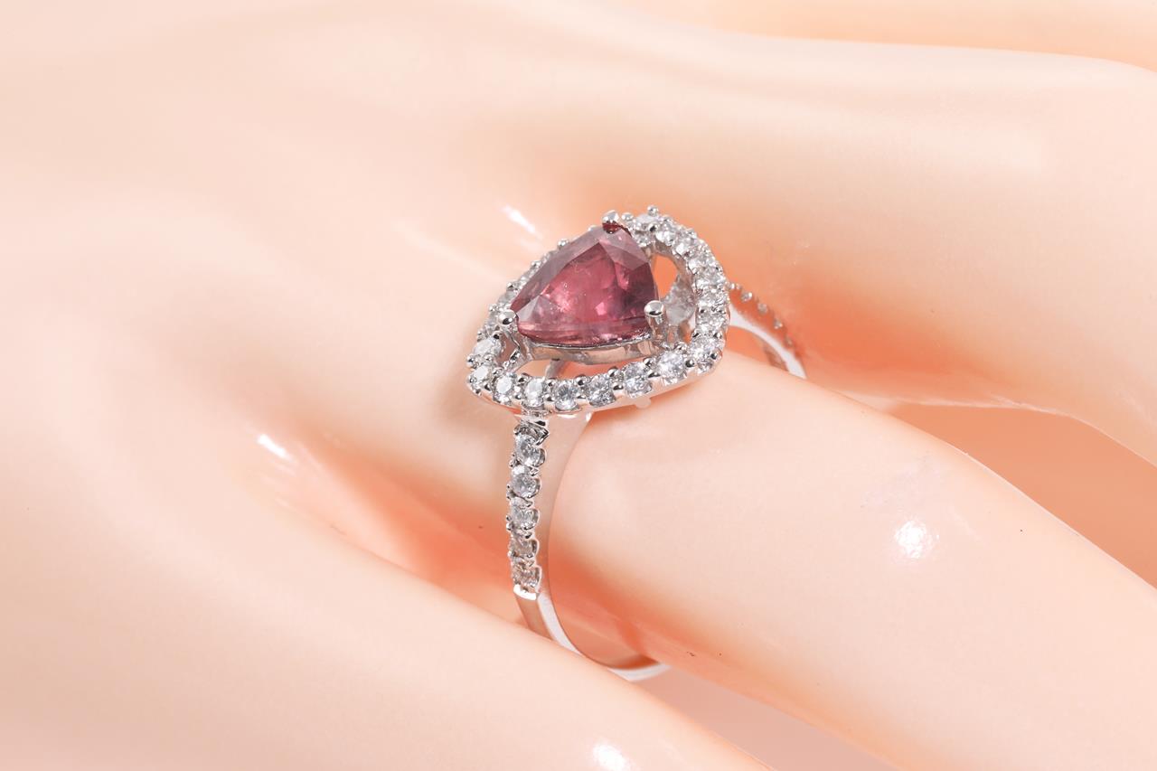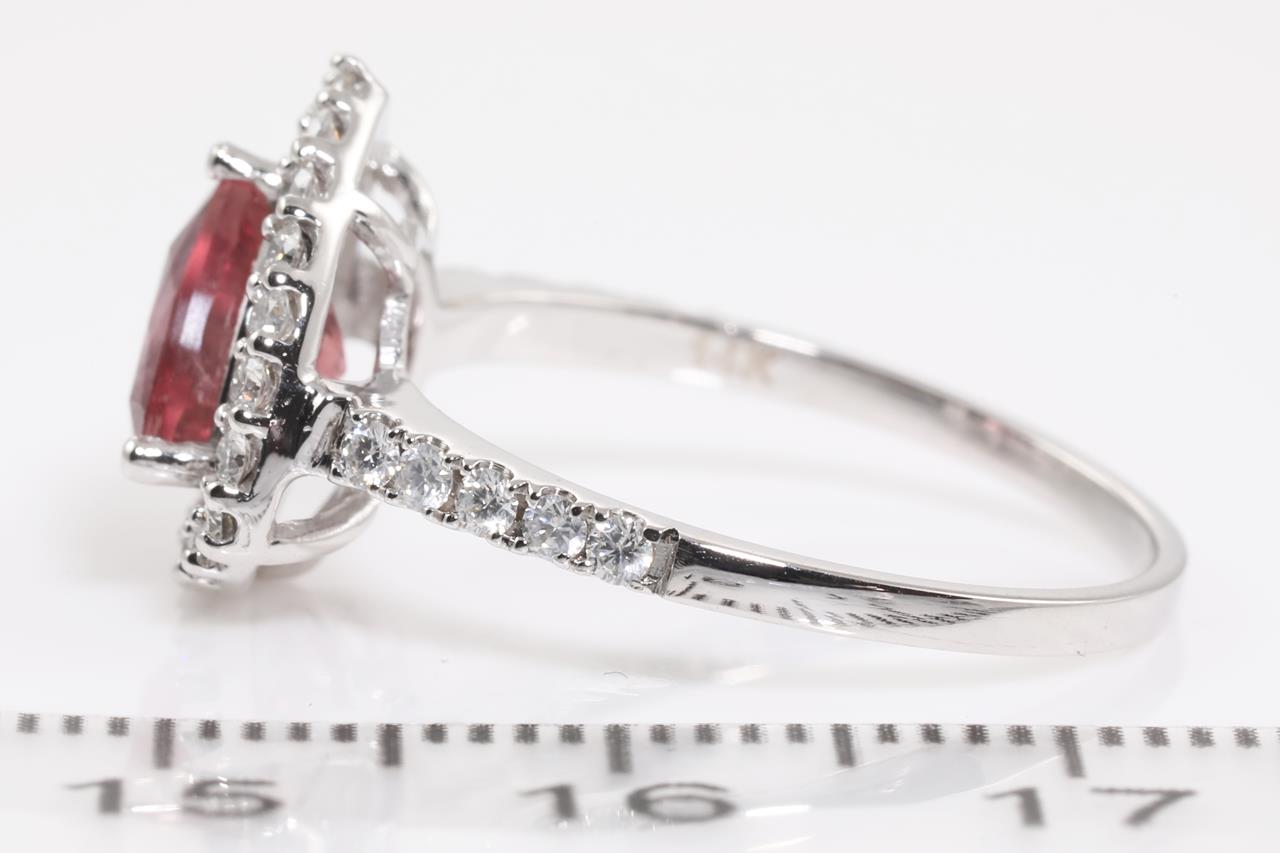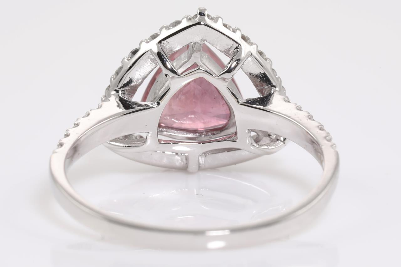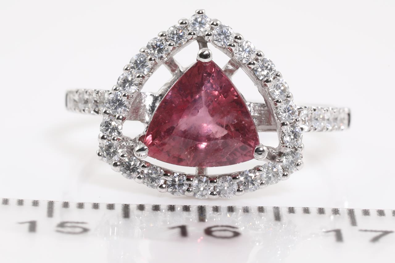 Ruby and Diamond Ring with trilliant cut Ruby of approximately 2.00ct and round Diamond totalling approximately 0.46cts (Estimated grading: H SI). 14ct white gold. Ring size O1/2. Weight 3.1g. (Pre-owned)