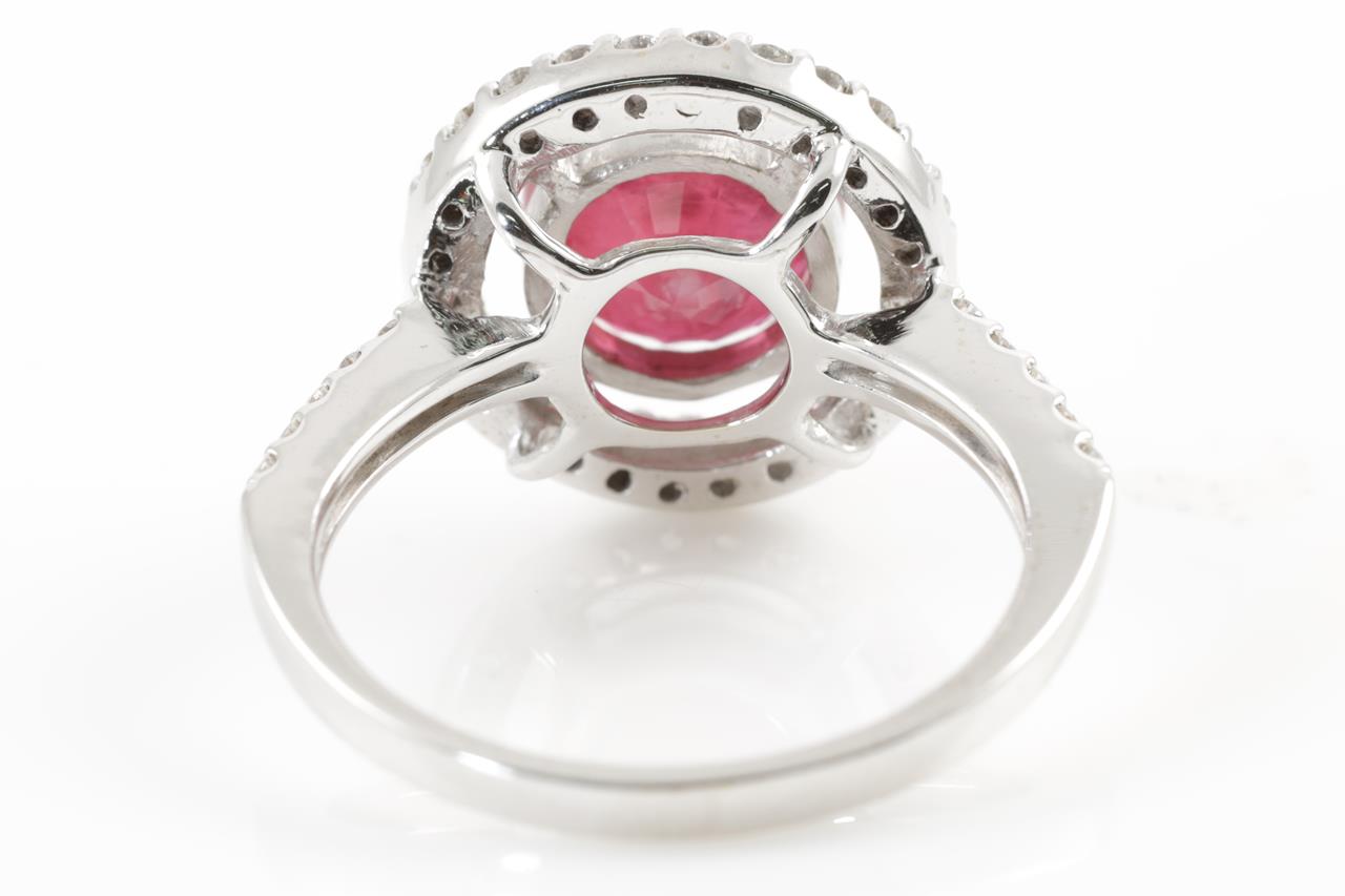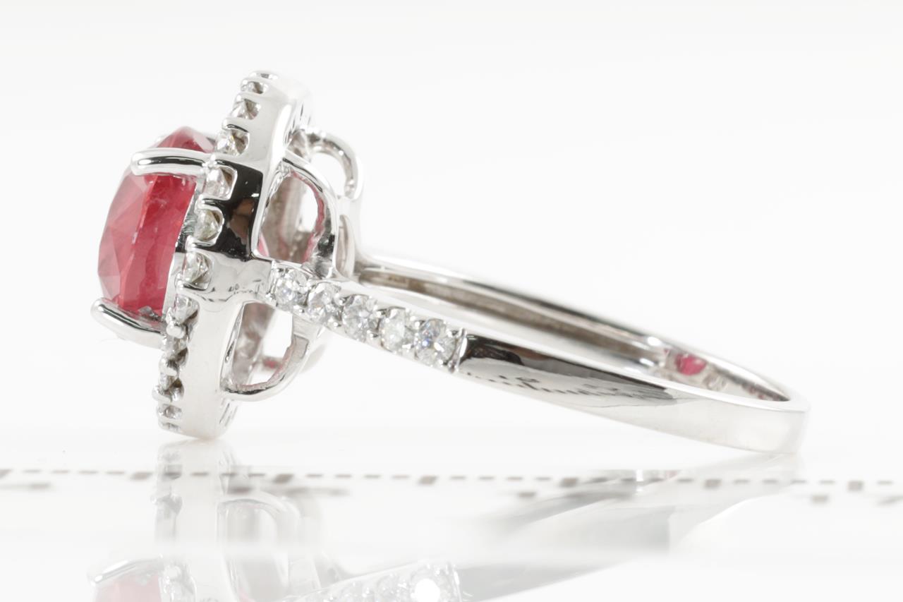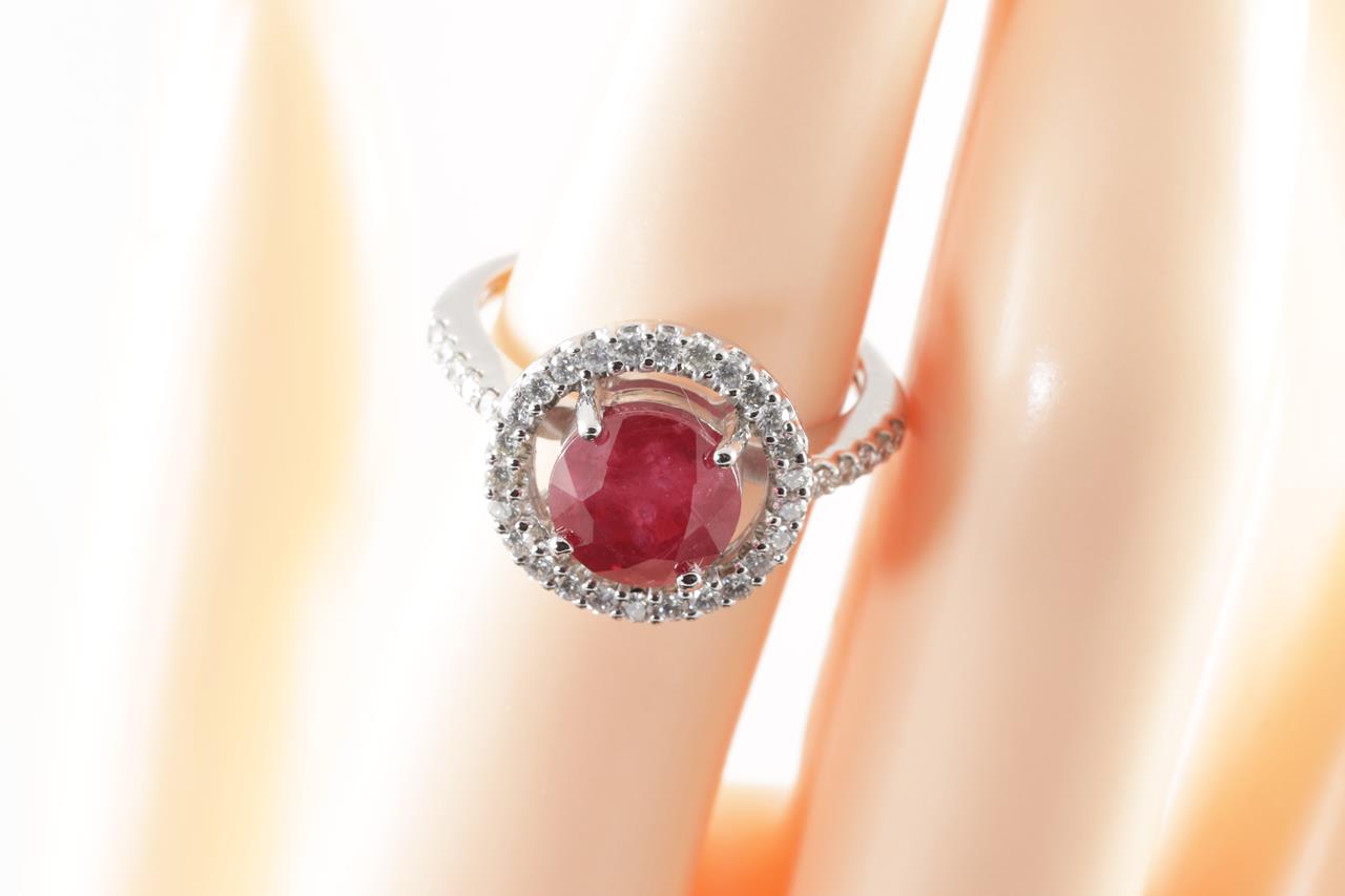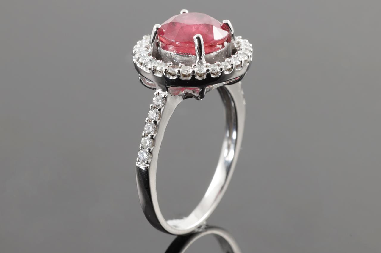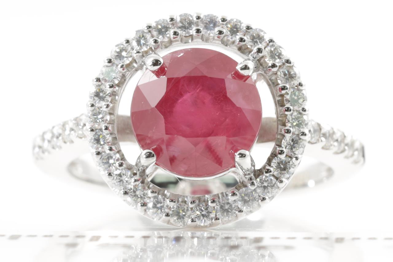 Ruby and Diamond Ring with round Ruby of approximately 3.33ct and round Diamonds totalling approximately 0.56cts (Estimated grading: H SI). 14ct white gold. Ring size N - can be resized up by a maximum of 3 sizes, down with ring clip. Weight 4.9g. (Pre-owned)