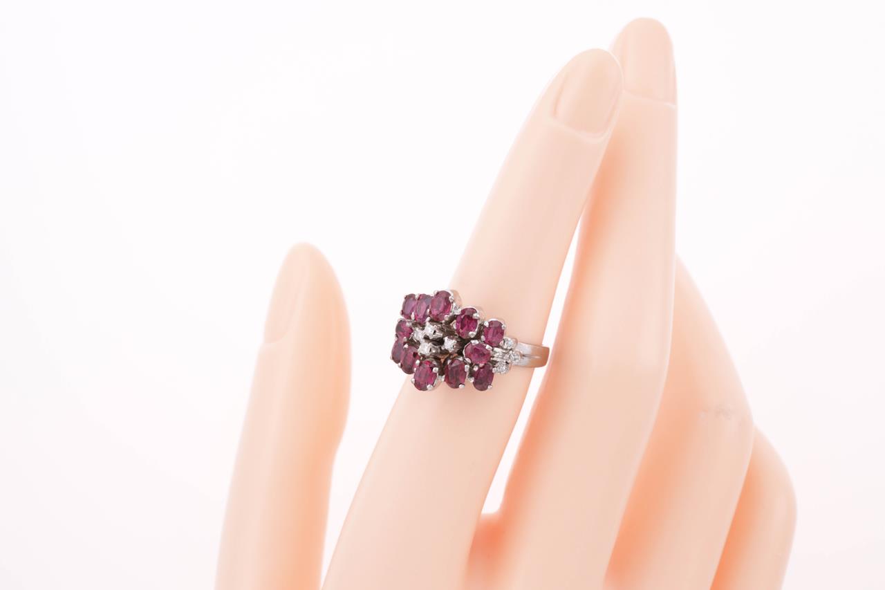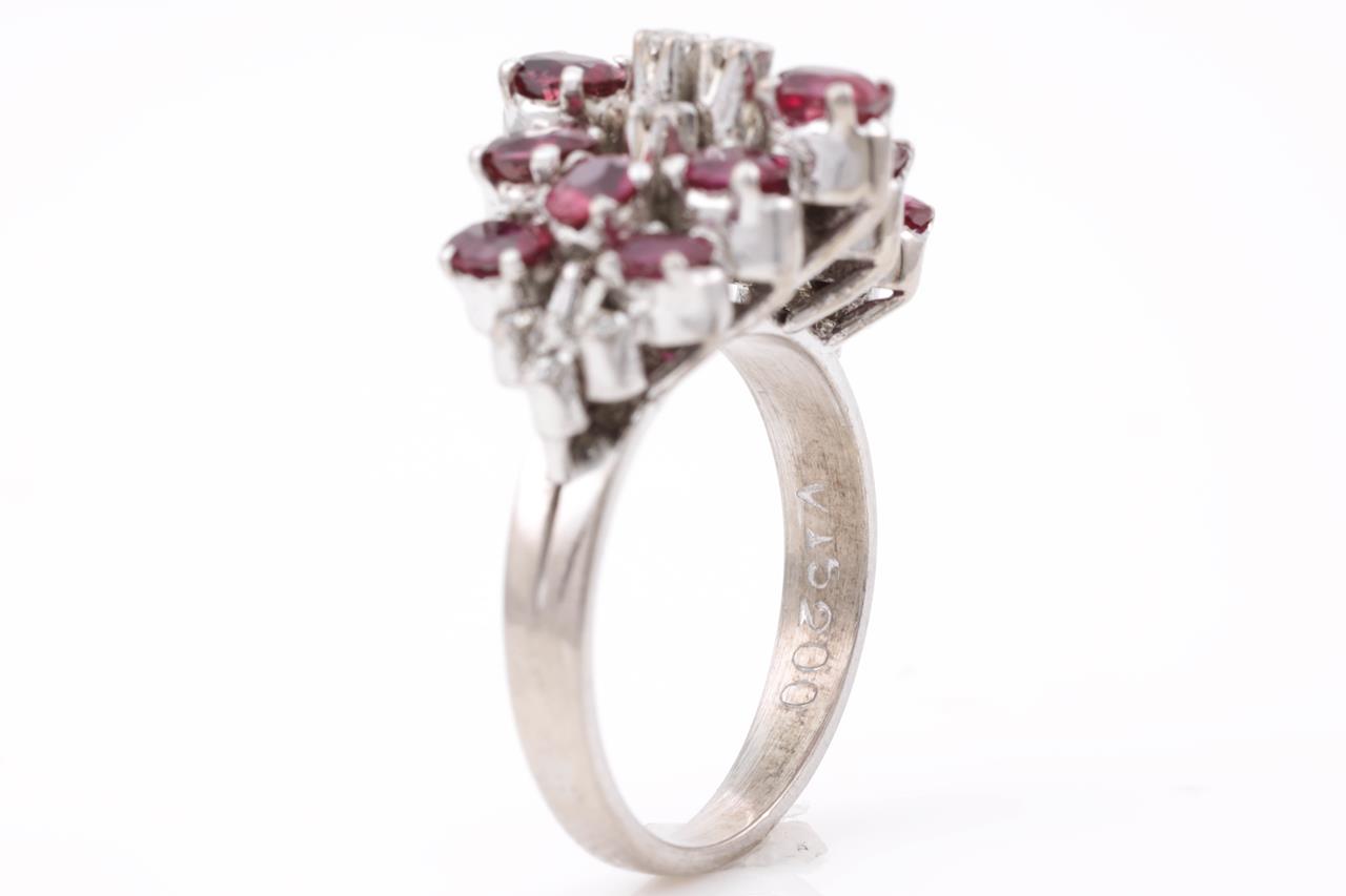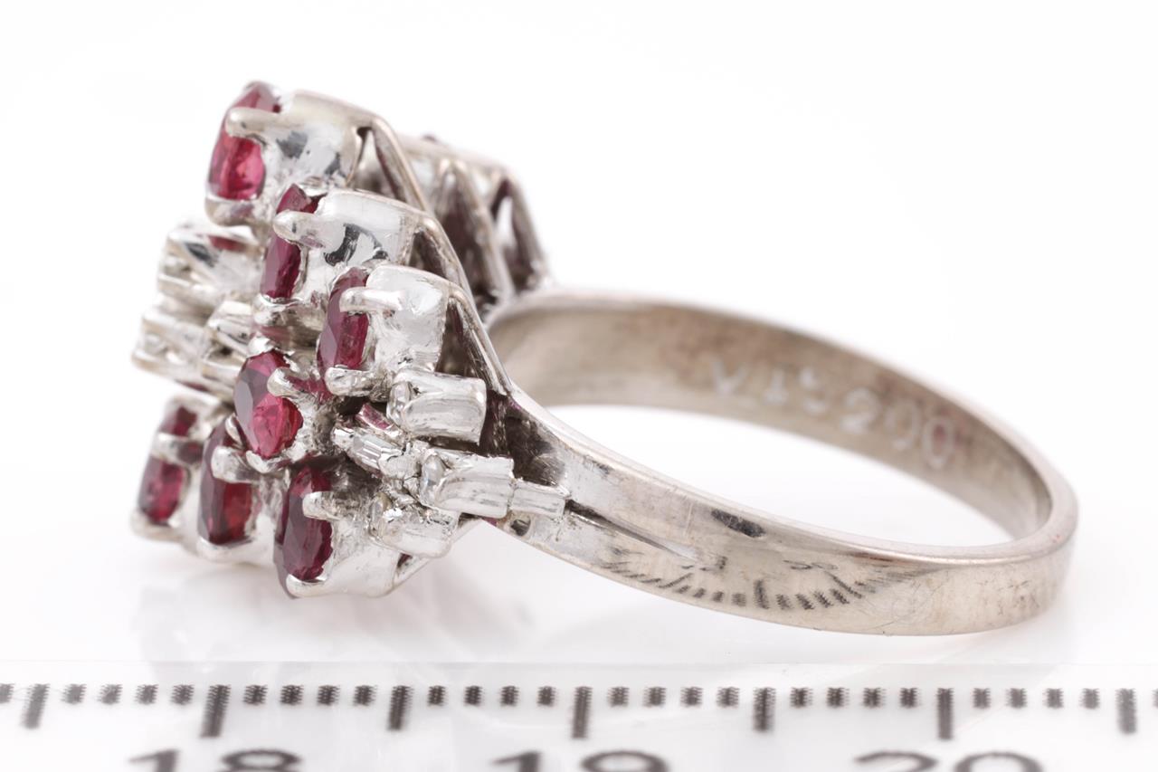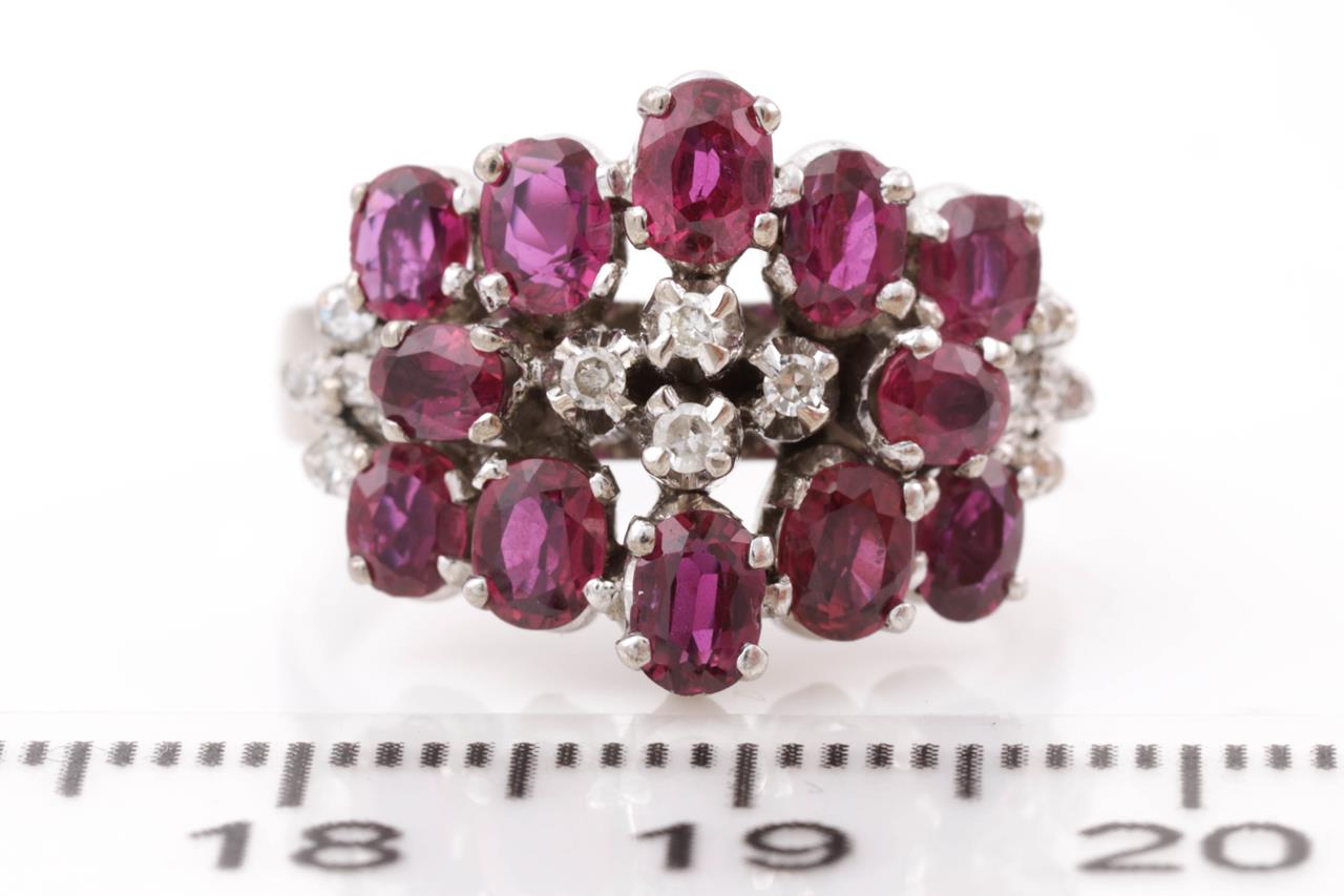 Ruby and Diamond Ring with twelve oval Rubies totalling approximately 1.80cts and ten round Diamonds totalling approximately 0.10cts. 14ct white gold. Ring size L. Weight 5.96g. (Pre-owned)