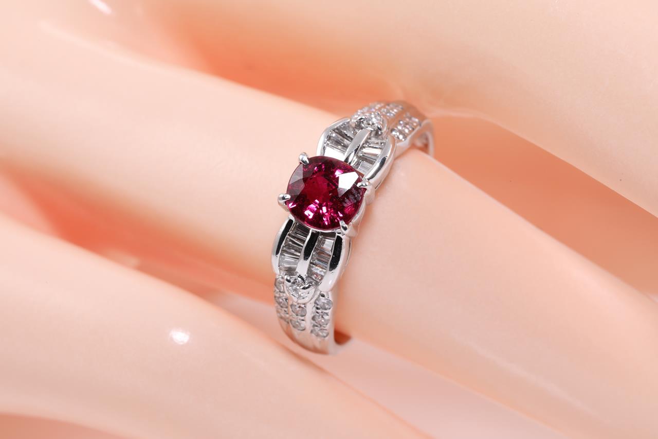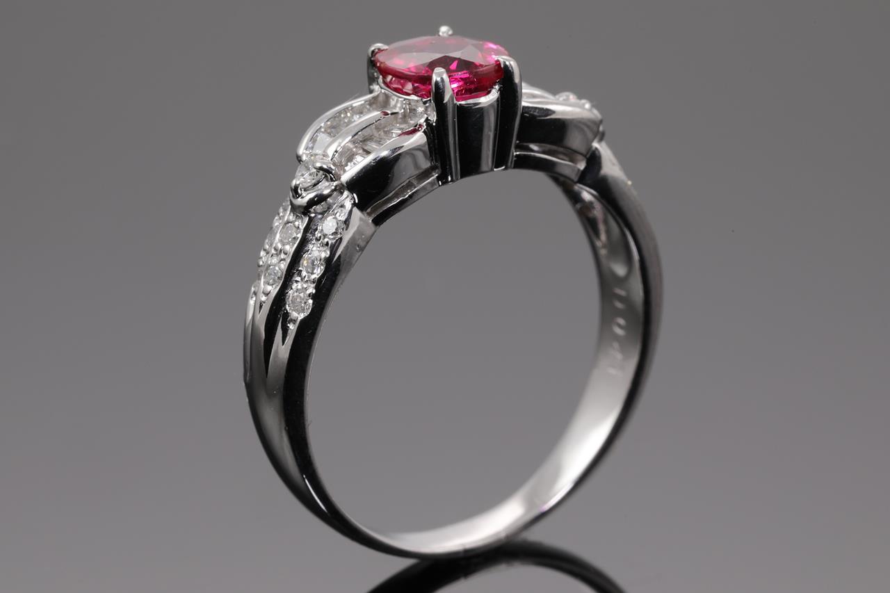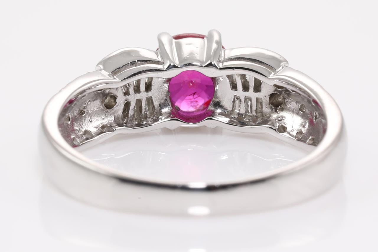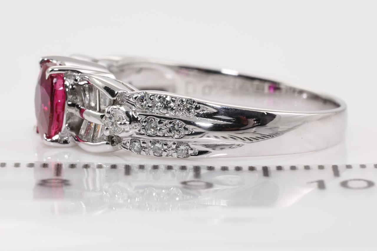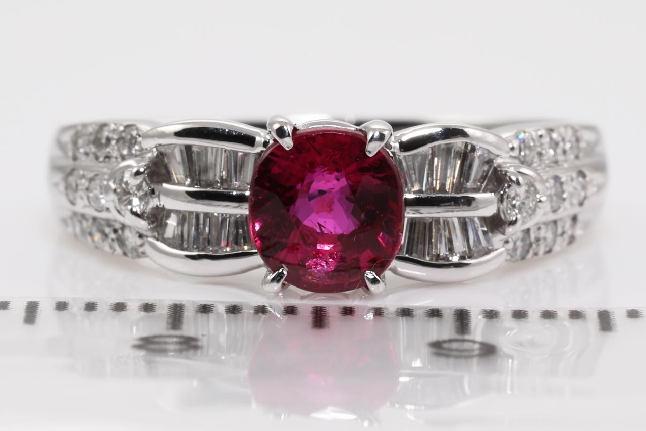 Ruby and Diamond Ring with oval cut Ruby of approximately 0.85ct and round or baguette Diamonds totalling approximately 0.41cts (Estimated grading: G-H SI). Platinum. Ring size N. Weight 5.8g. (Pre-owned)