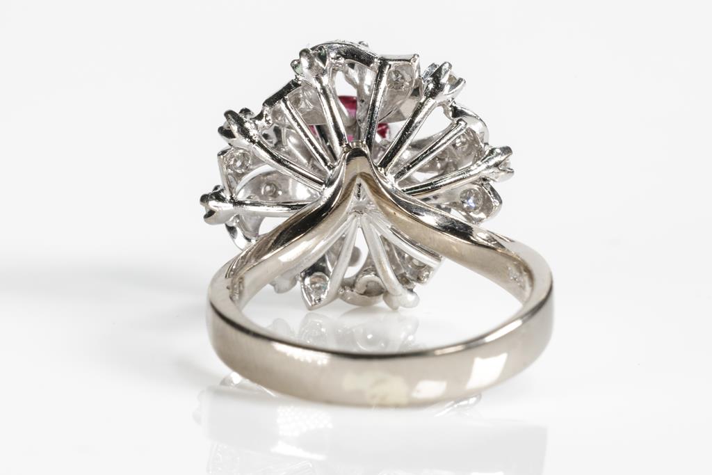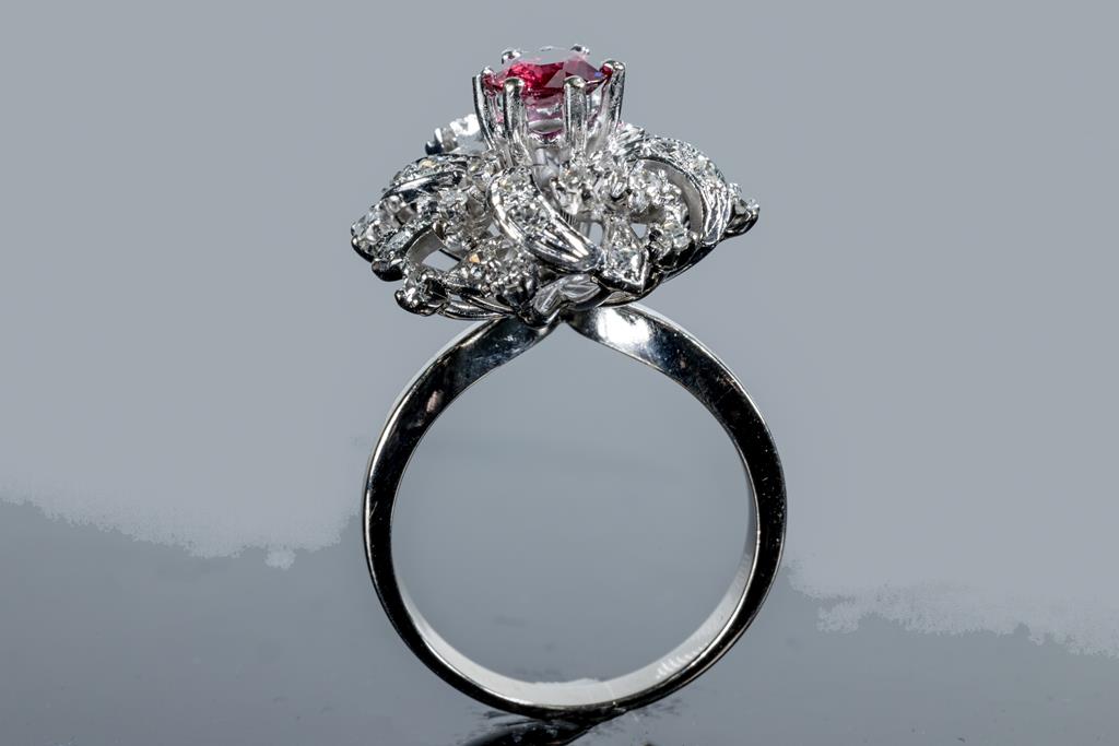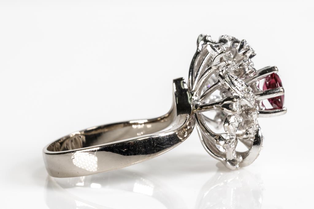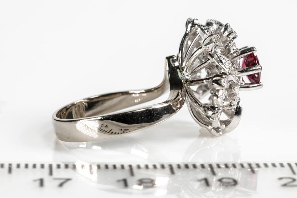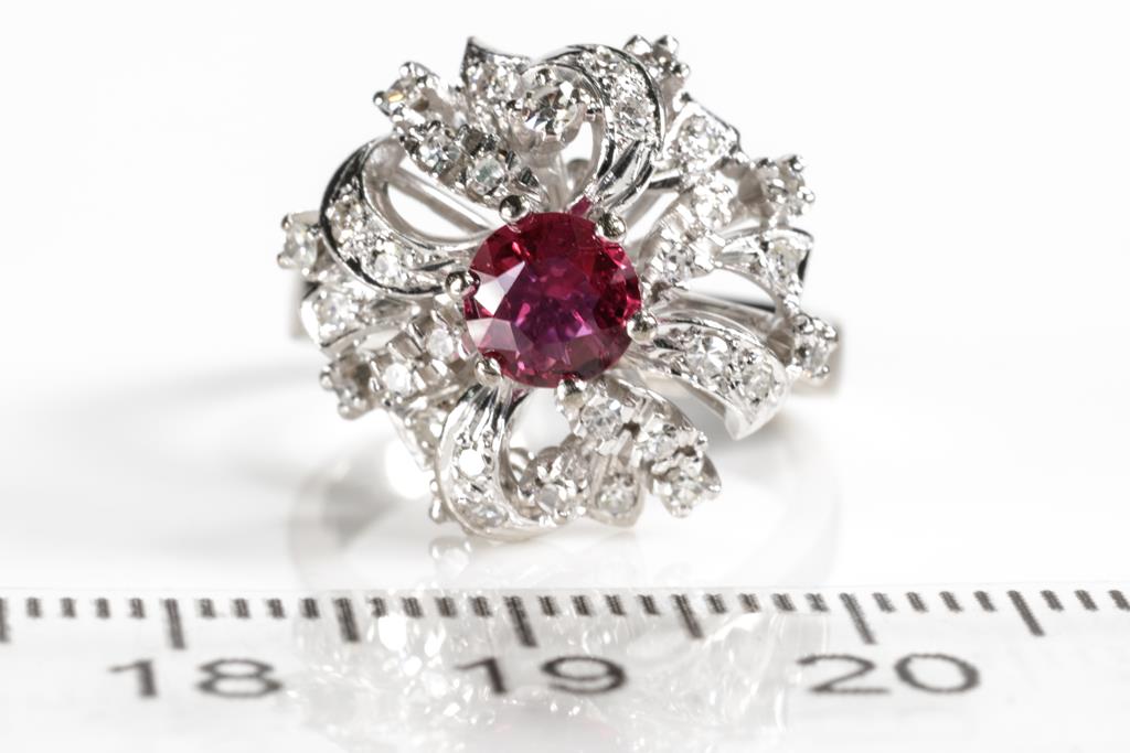 Ruby and Diamond Ring with round cut Ruby of approximately 0.30ct and round Diamonds totalling approximately 0.33cts (estimated grading F-I VS-SI). 18ct white gold. Ring size I 1/2. Weight 7.1g. With copy of Wallace Bishop Valuation. (Pre-owned)