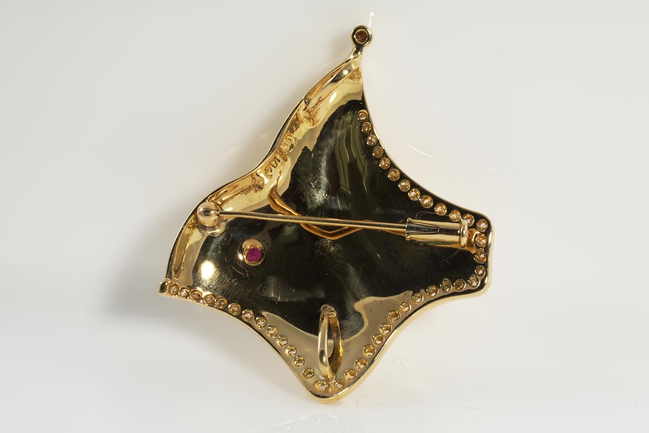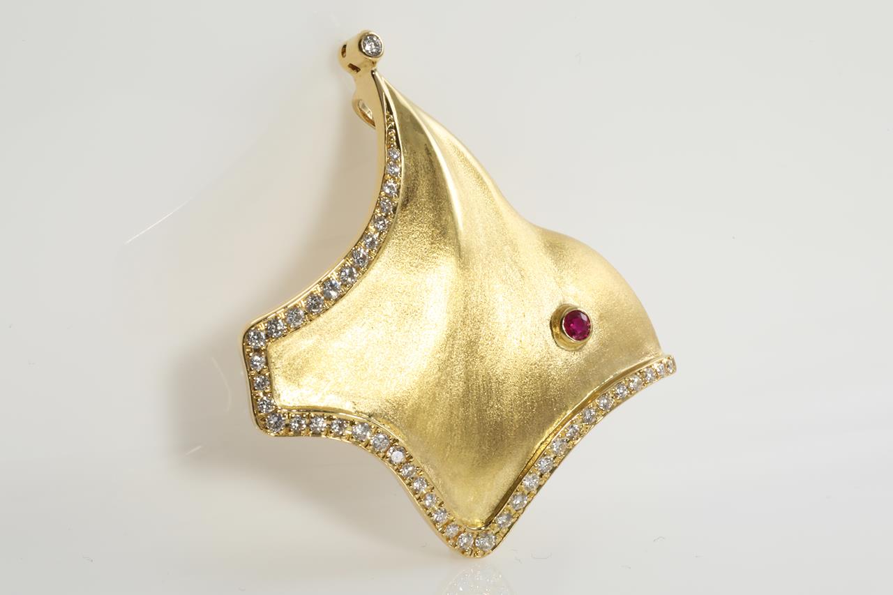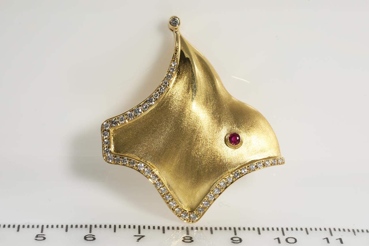 Ruby and Diamond Stingray design brooch/pendant with round Diamonds totalling 0.51cts (Estimated grading: G-H SI) and a round Ruby eye. 18ct yellow gold. Weight: 9.9g (Pre-owned)