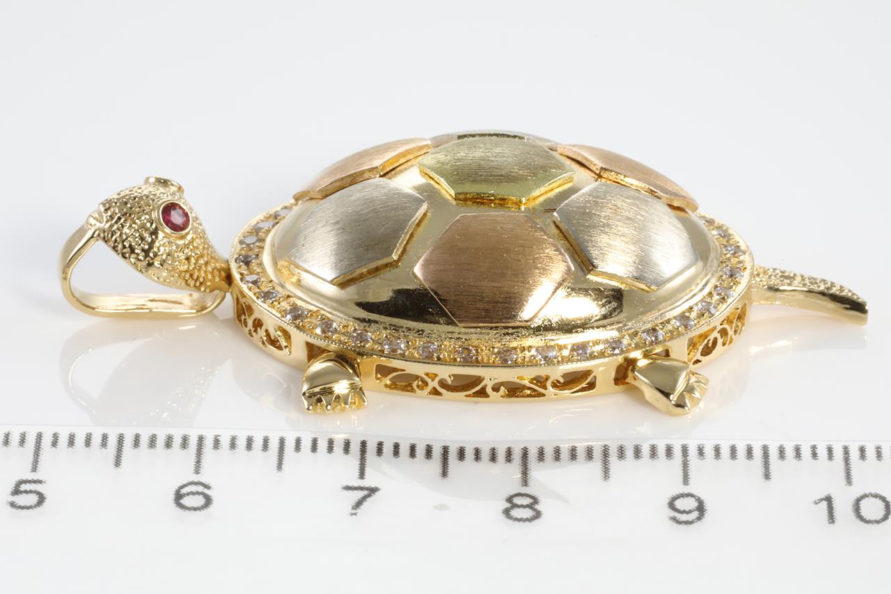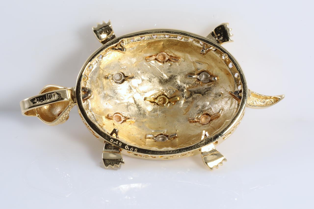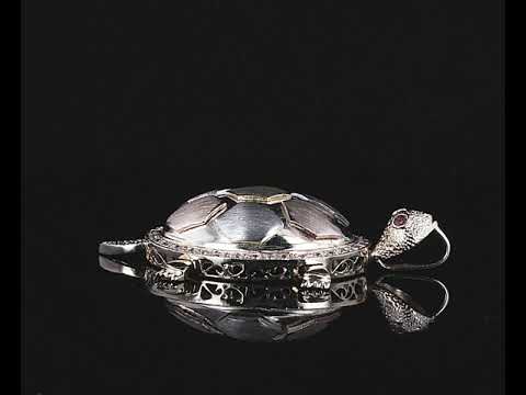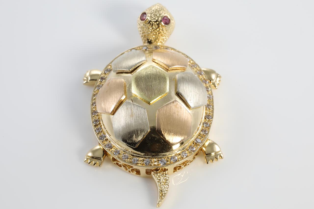 Ruby and Diamond turtle design pendant with round Ruby eyes totalling 0.05cts and round Diamonds totalling 0.49cts (Estimated grading: H VS-SI). 18ct Yellow, white and rose gold. Weight: 18.5g (Pre-owned)