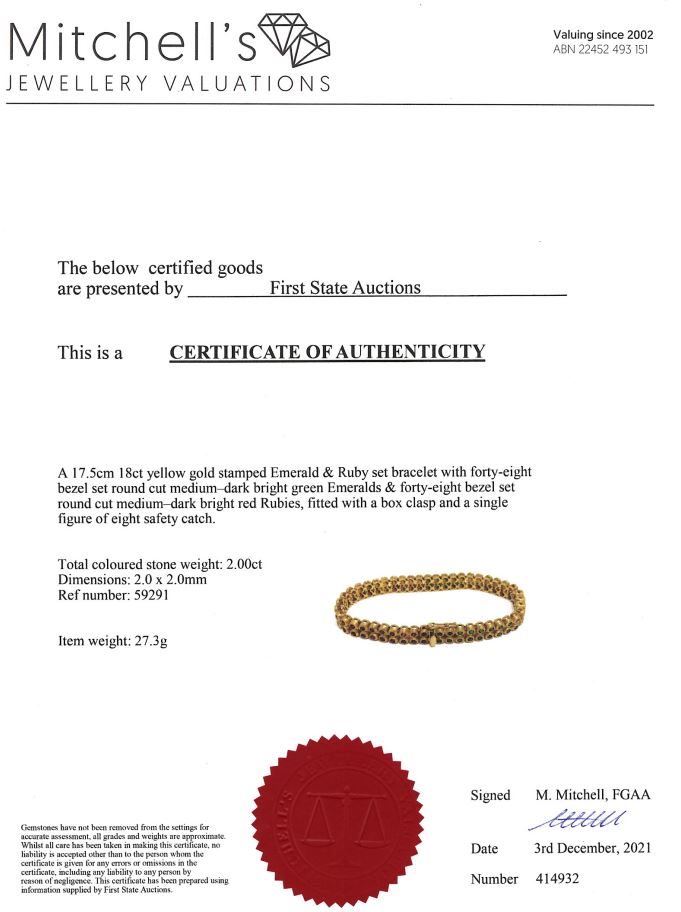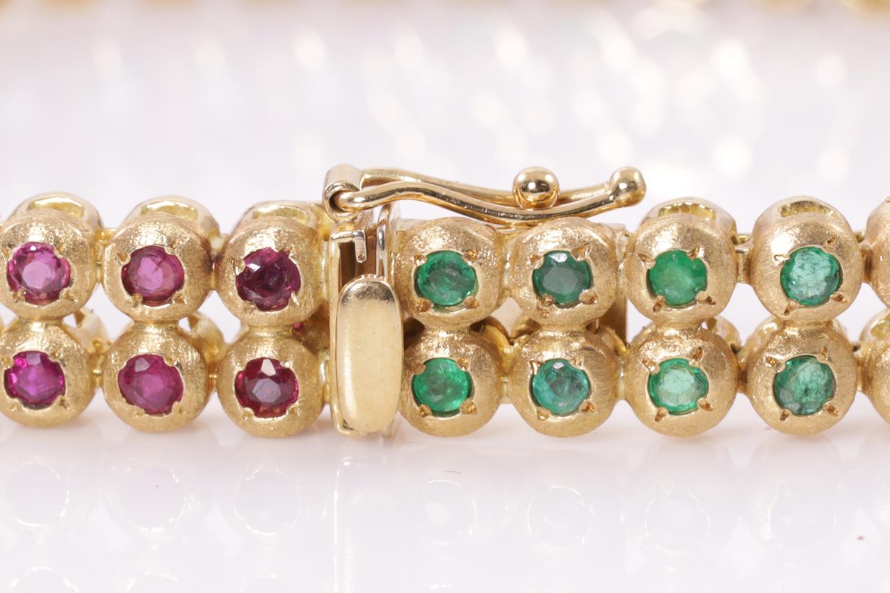 Ruby and Emerald two row bracelet with round Ruby & Emeralds totalling 2.00cts. 18ct yellow gold. Length: 17.5cm. Weight: 27.3g. With certificate #414932. (Pre-owned)