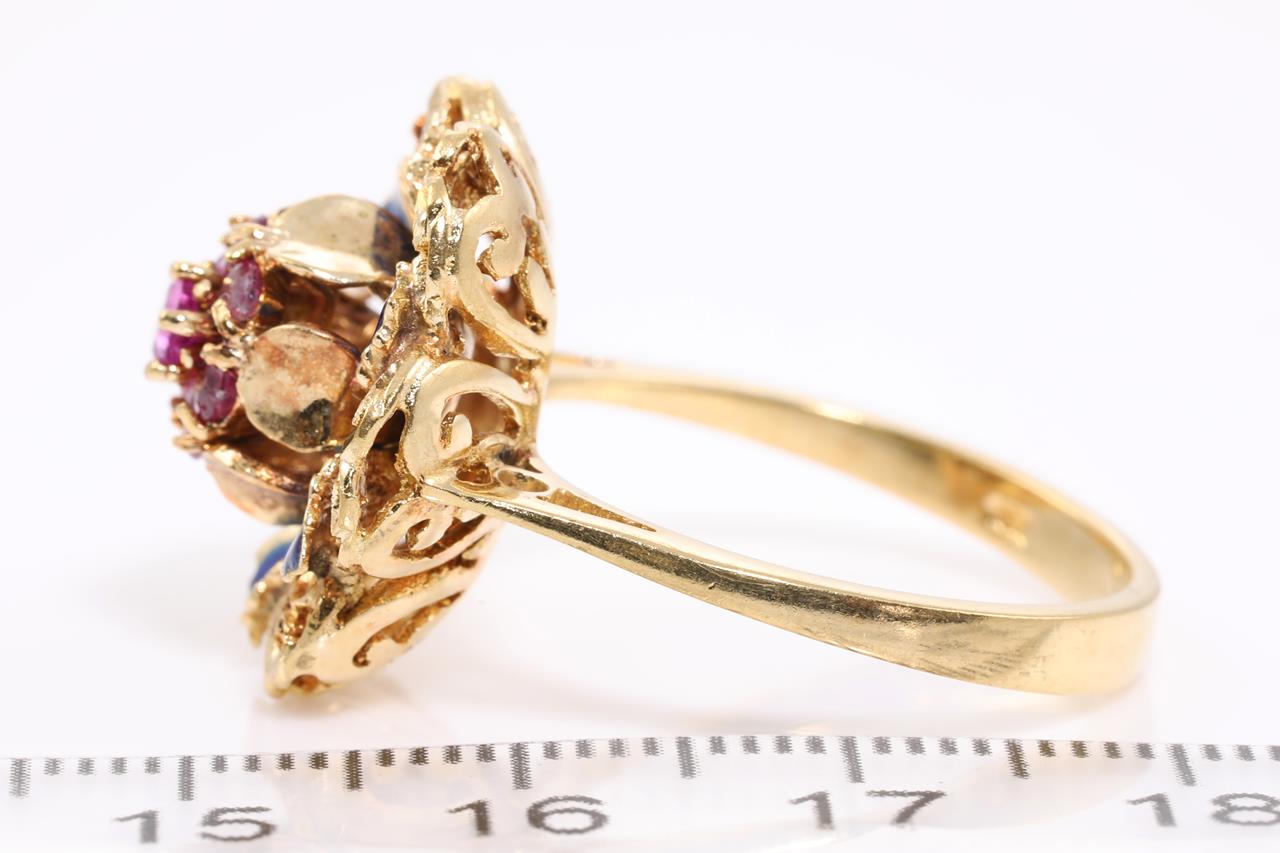 Ruby and Enamel Ring with seven round Rubies totalling approximately 0.40cts with blue enamel (2 rubies have minor chips)l. 18ct yellow gold. Ring size U. Weight 9.7g. (Pre-owned)