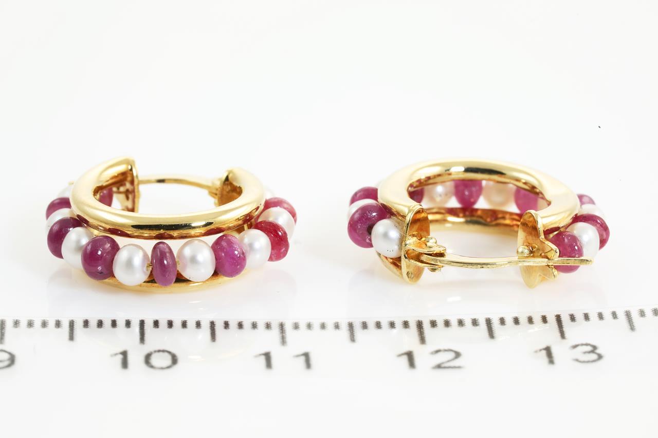 Hoop earrings with Ruby beads and seed Pearls. 18ct yellow gold. Made in Italy. Weight: 3.7g. Note minor dent on side of one earring. (Pre-owned)