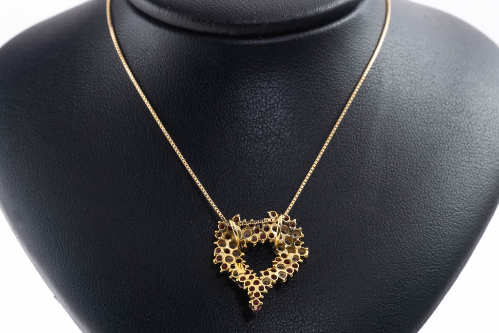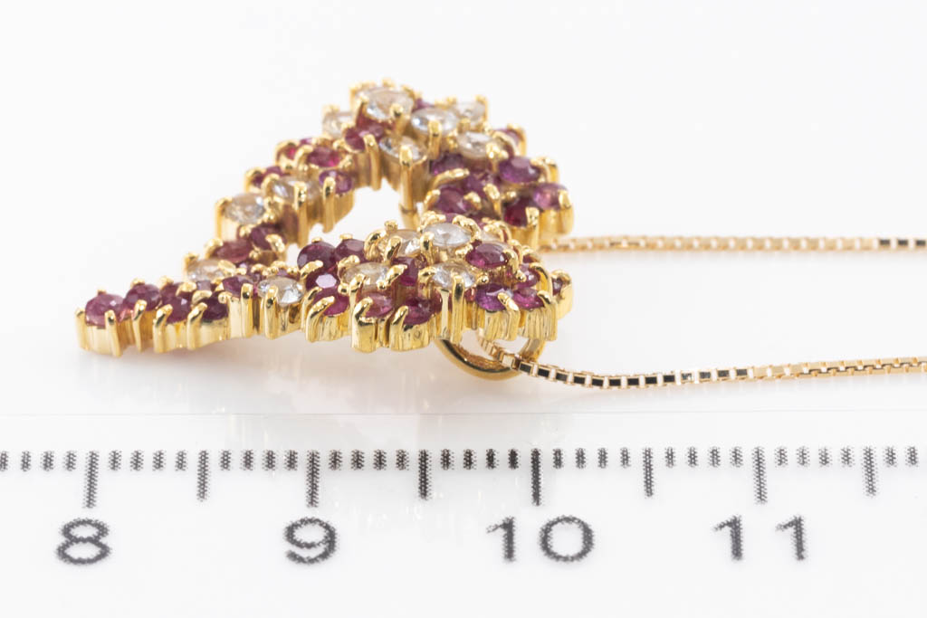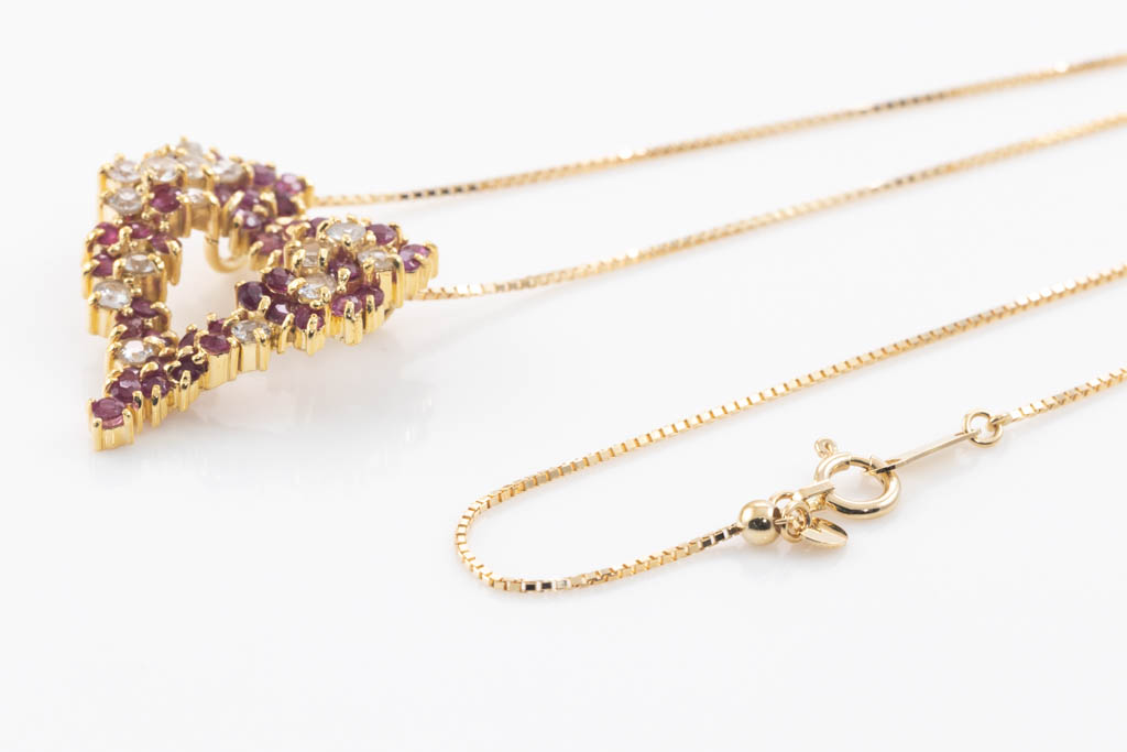 Ruby and Sapphire pendant with round Rubies totalling 1.20cts and round colourless Sapphires totalling 0.80cts. 18ct yellow gold with 44cm 18ct yellow gold adjustable chain. Weight: 5.7g. (Pre-owned)