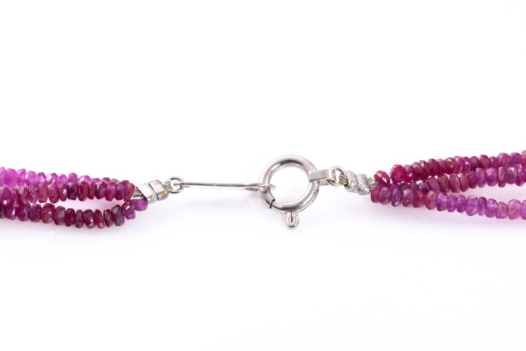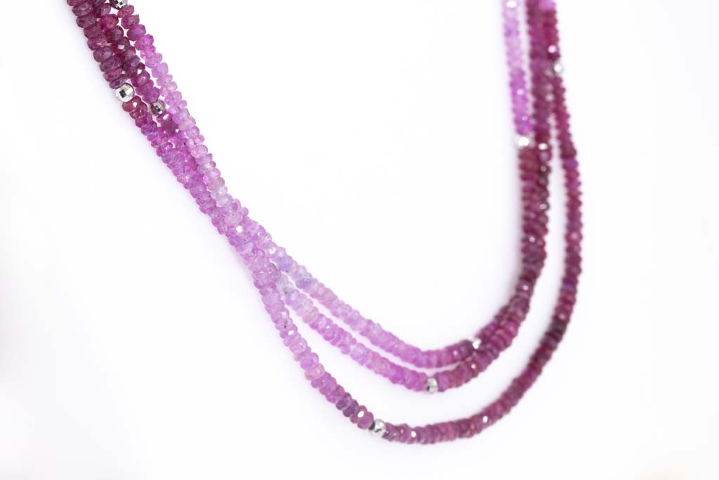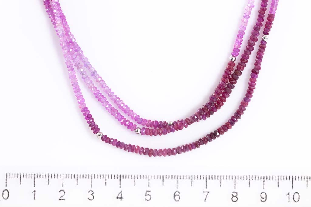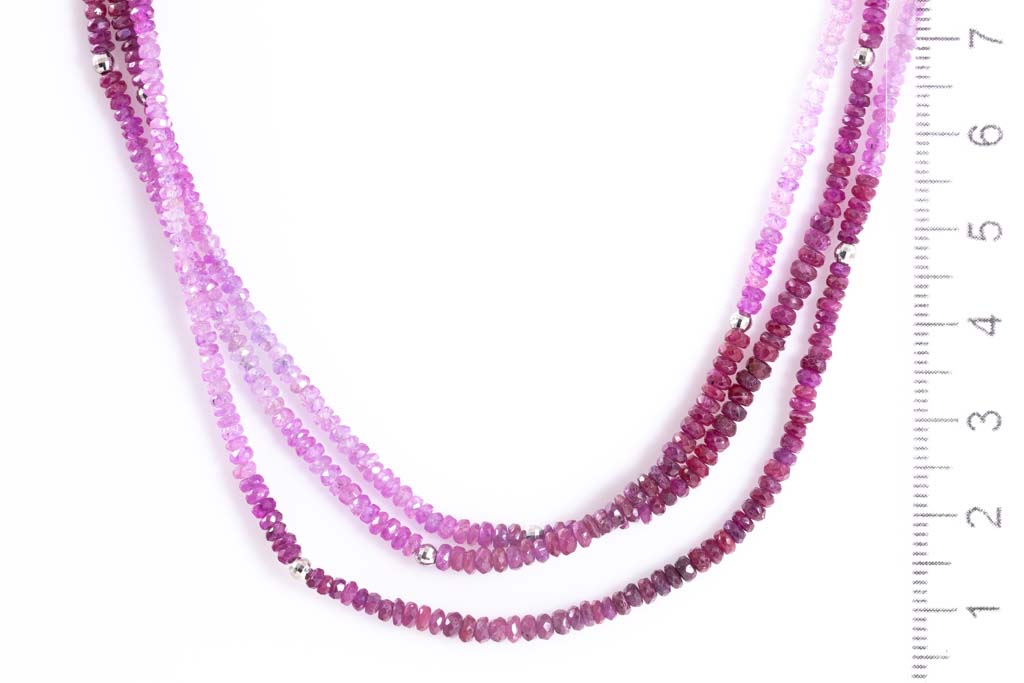 Ruby and Sapphire 3 row necklace with Rubies and pink Sapphires beads of approximately size 2.2mm - 2.8mm. 18ct white gold 2.2mm beads and clasp. Length: approximately 60cm. Weight: 24.3g. (Pre-owned)
