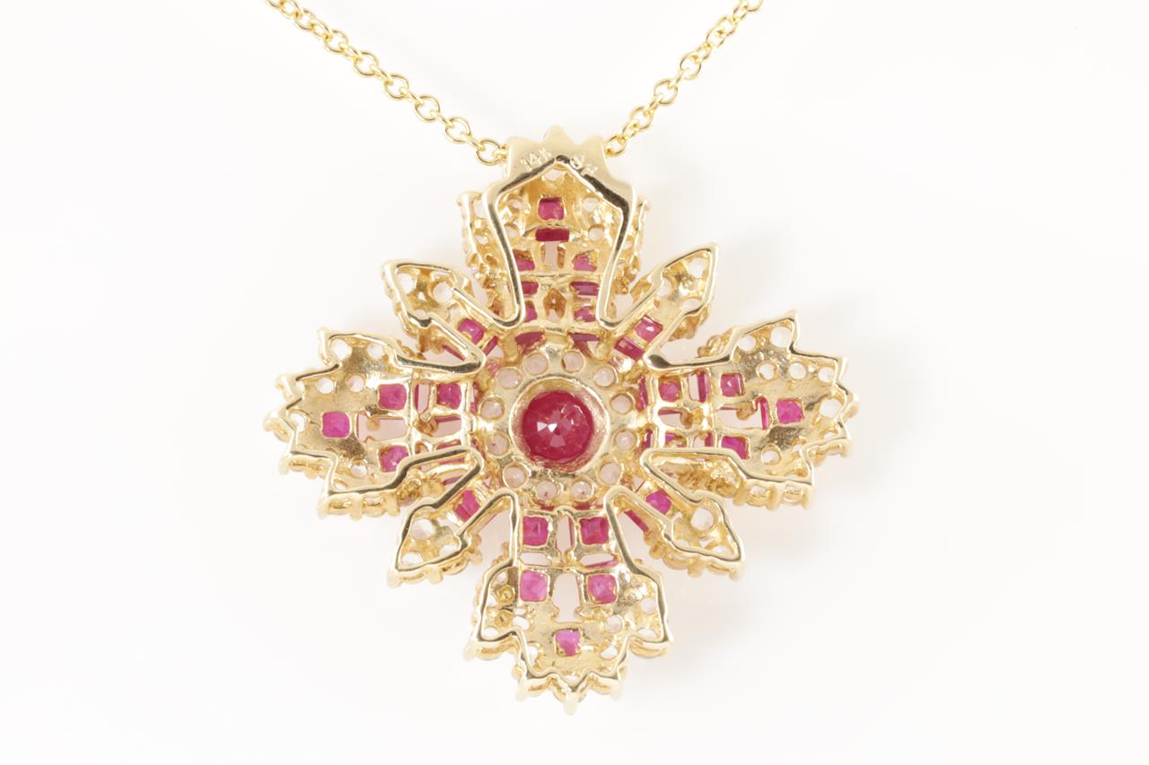 Ruby and Sapphire Pendant with round and square cut Rubies and round white Sapphires. 14ct yellow gold with 14ct gold 45cm chain. Weight 10.1g. (Pre-owned)