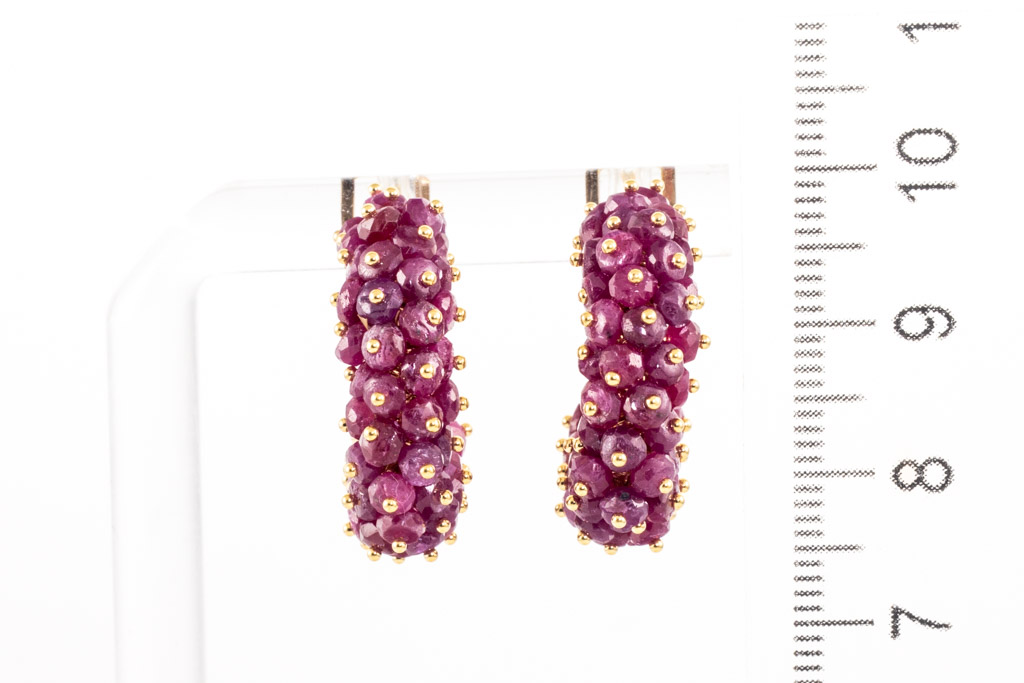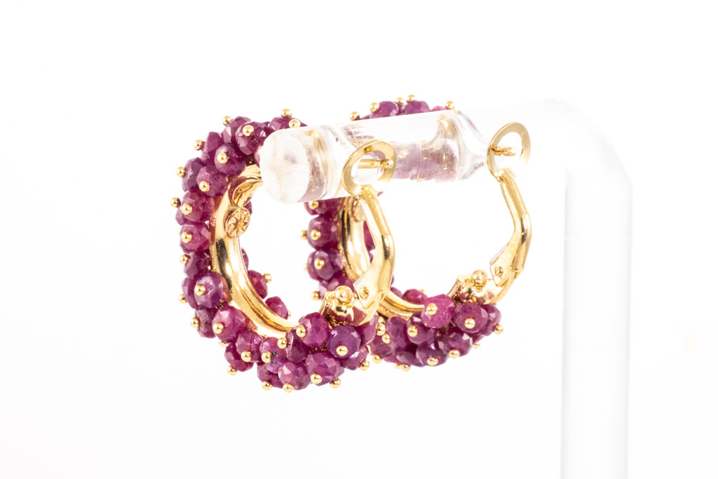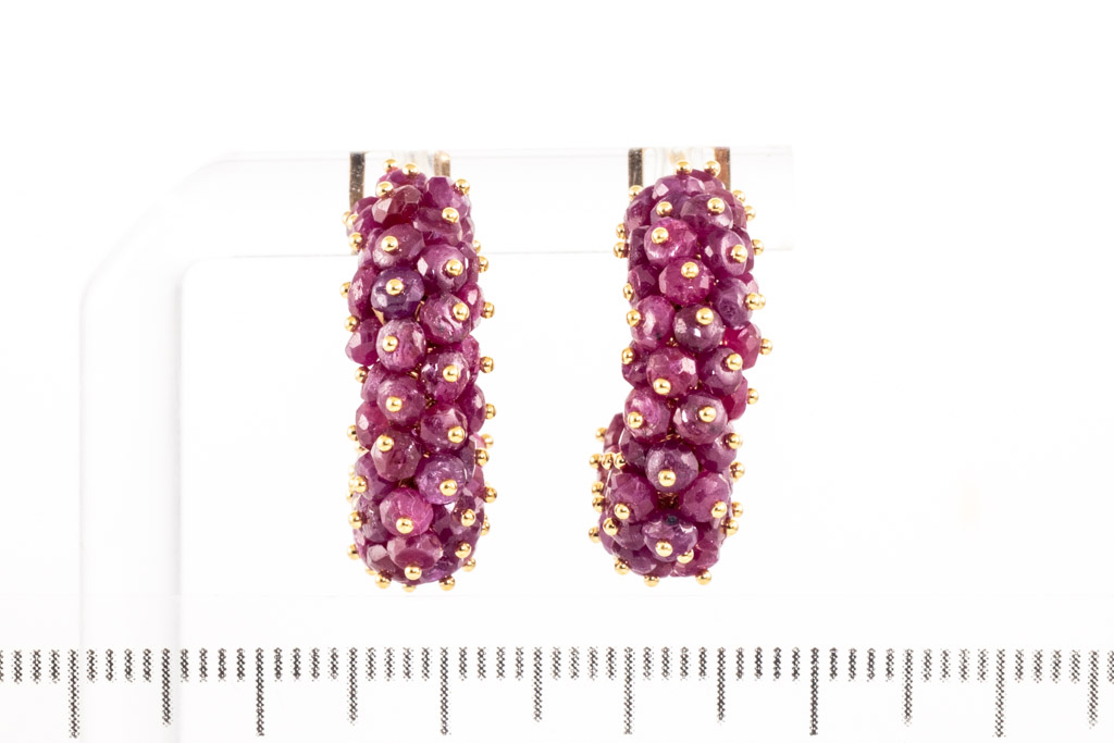 Ruby hook clip-on earrings (for pierced ears) with 96 Ruby beads (Approximately size: 2.7mm). 18ct yellow gld. Weight: 9.4g. (Pre-owned)