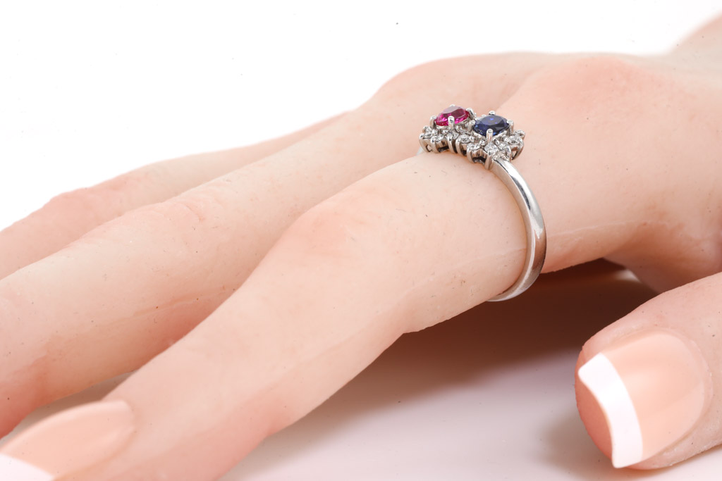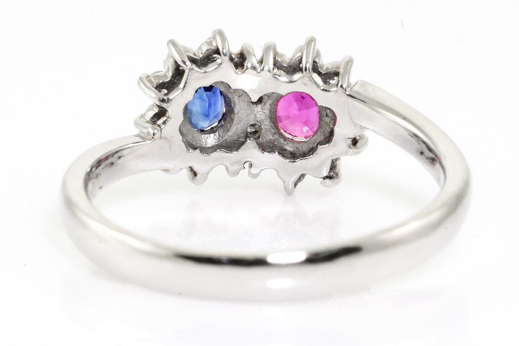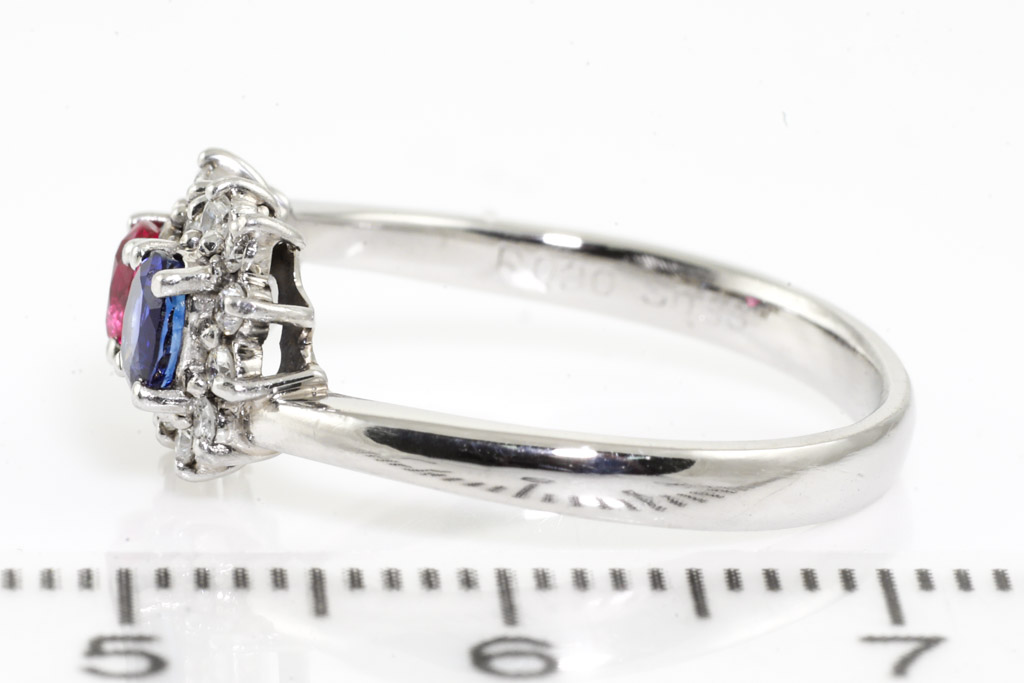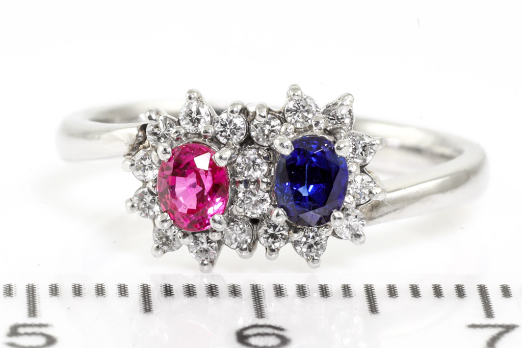 Ruby, Sapphire and Diamond ring with oval shape Ruby of 0.30ct, oval shape blue Sapphire of 0.33ct and round Diamonds totalling 0.20cts. Platinum-900. Ring size M. Weight: 4.2g. (Pre-owned)
