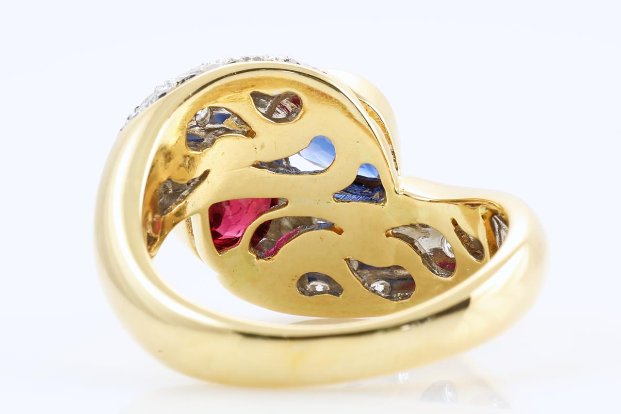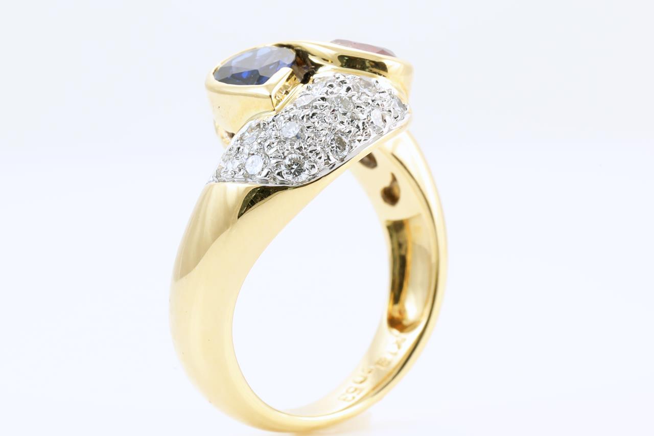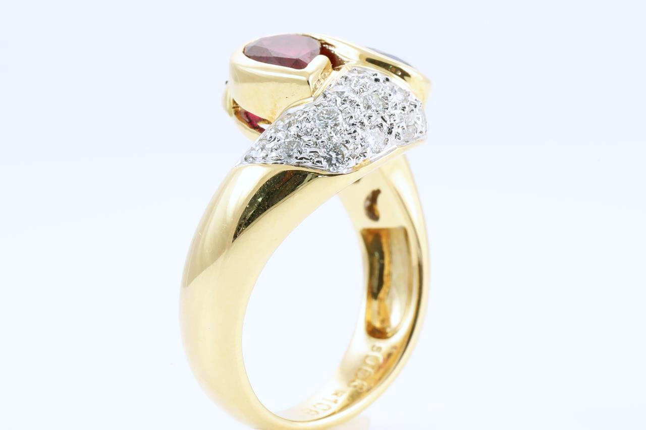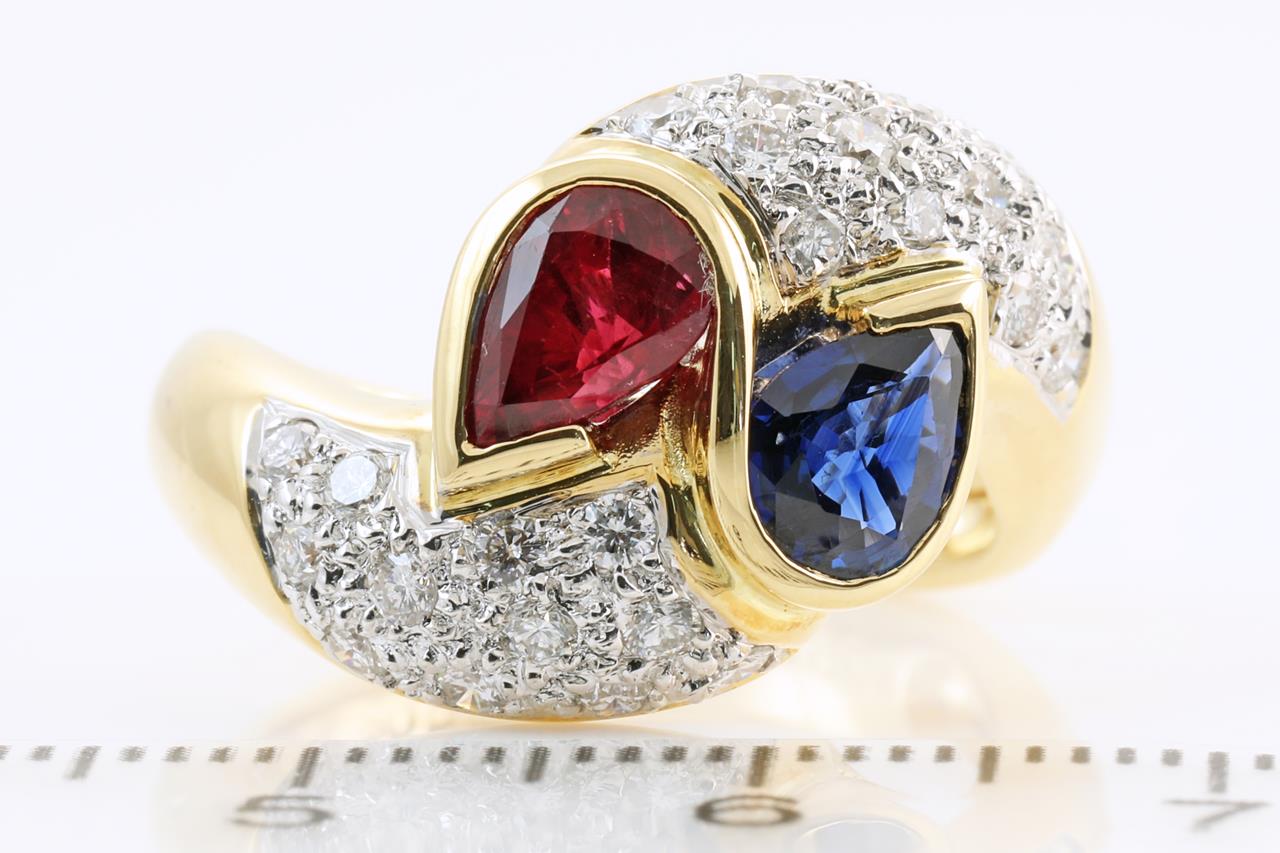 Vintage Ruby, Sapphire and Diamond ring with pear shape Ruby of 1.08ct, pear shape Sapphire of 0.66ct and Diamonds totalling 0.53cts (Estimated grading: G-H VS). 18ct yellow gold. Ring size O - Note resizing up is not recommended, can only be resized down with ring clip. Weight: 9.0g (Pre-owned)