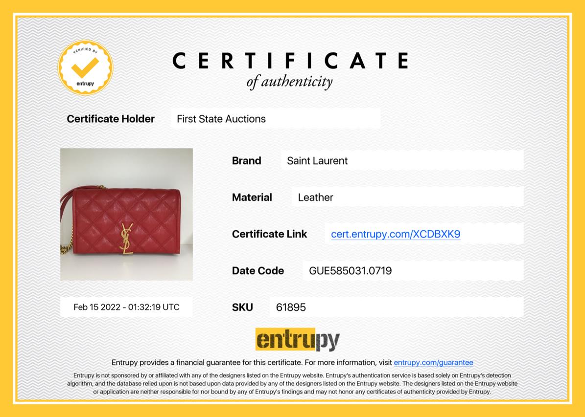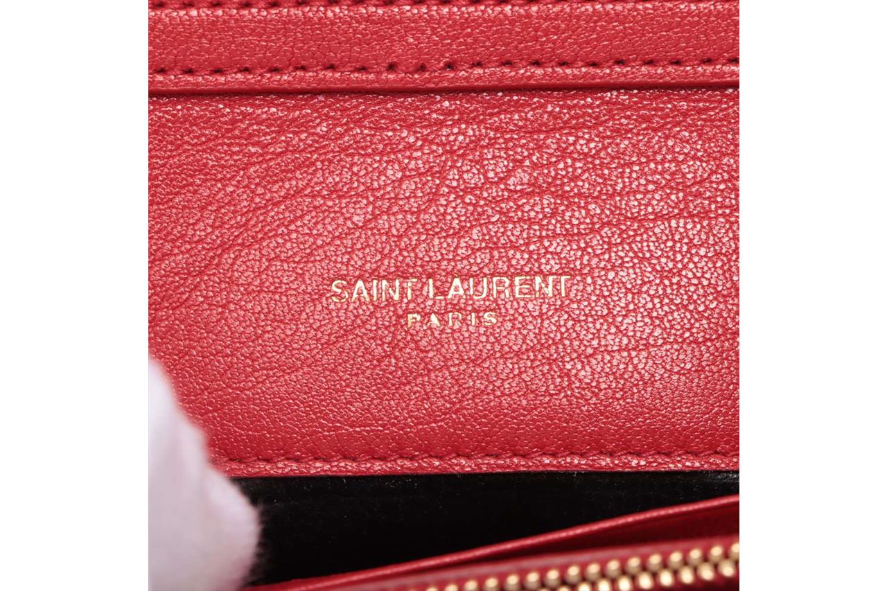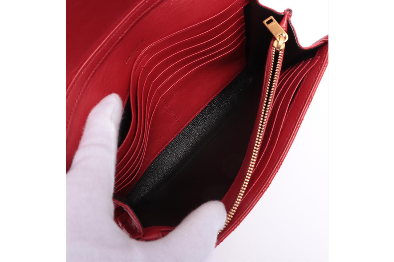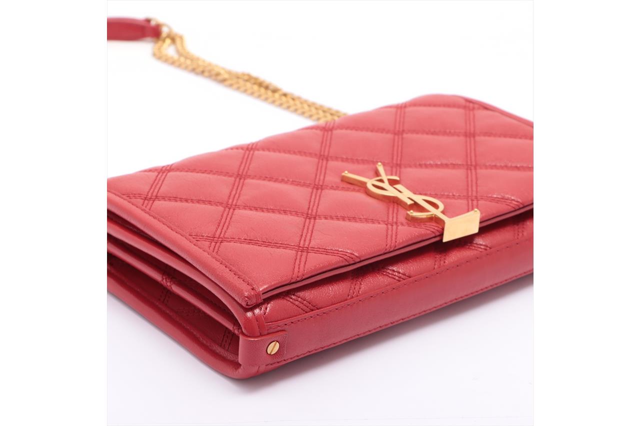 Saint Laurent Becky Quilted Wallet on Chain. Red lambskin leather. Gold-tone hardware. Featuring logo plaque, diamond quilting, chain-link shoulder strap and internal zip-fastening pocket. Approximate dimensions: 23cm (L) x 14cm (H) x 4cm (D) and 34cm strap drop. Accompanied by YSL box and dust bag. With Entrupy Certificate of Authenticity. (Pre-owned)