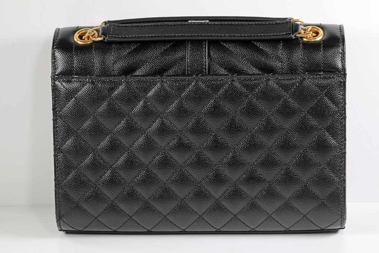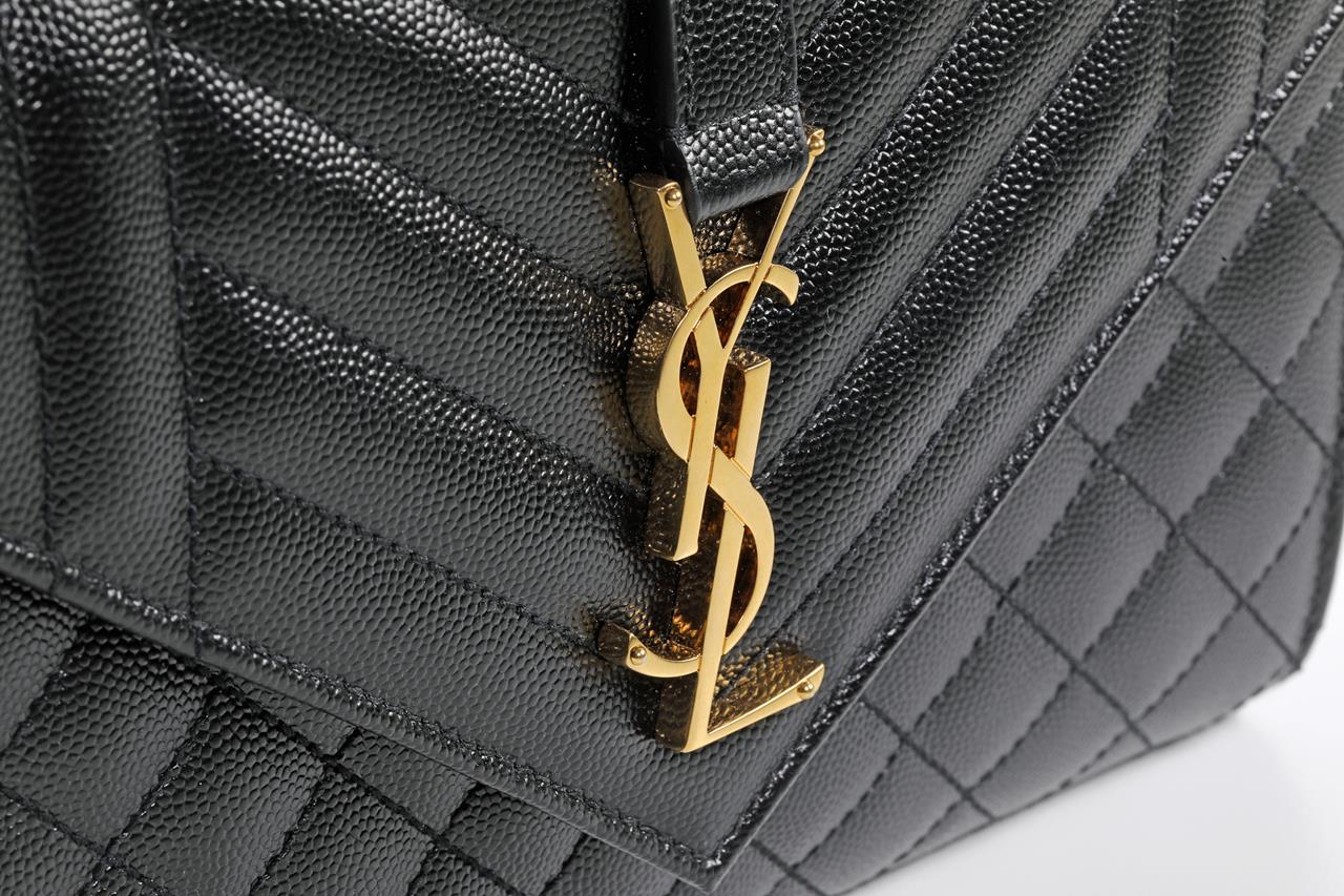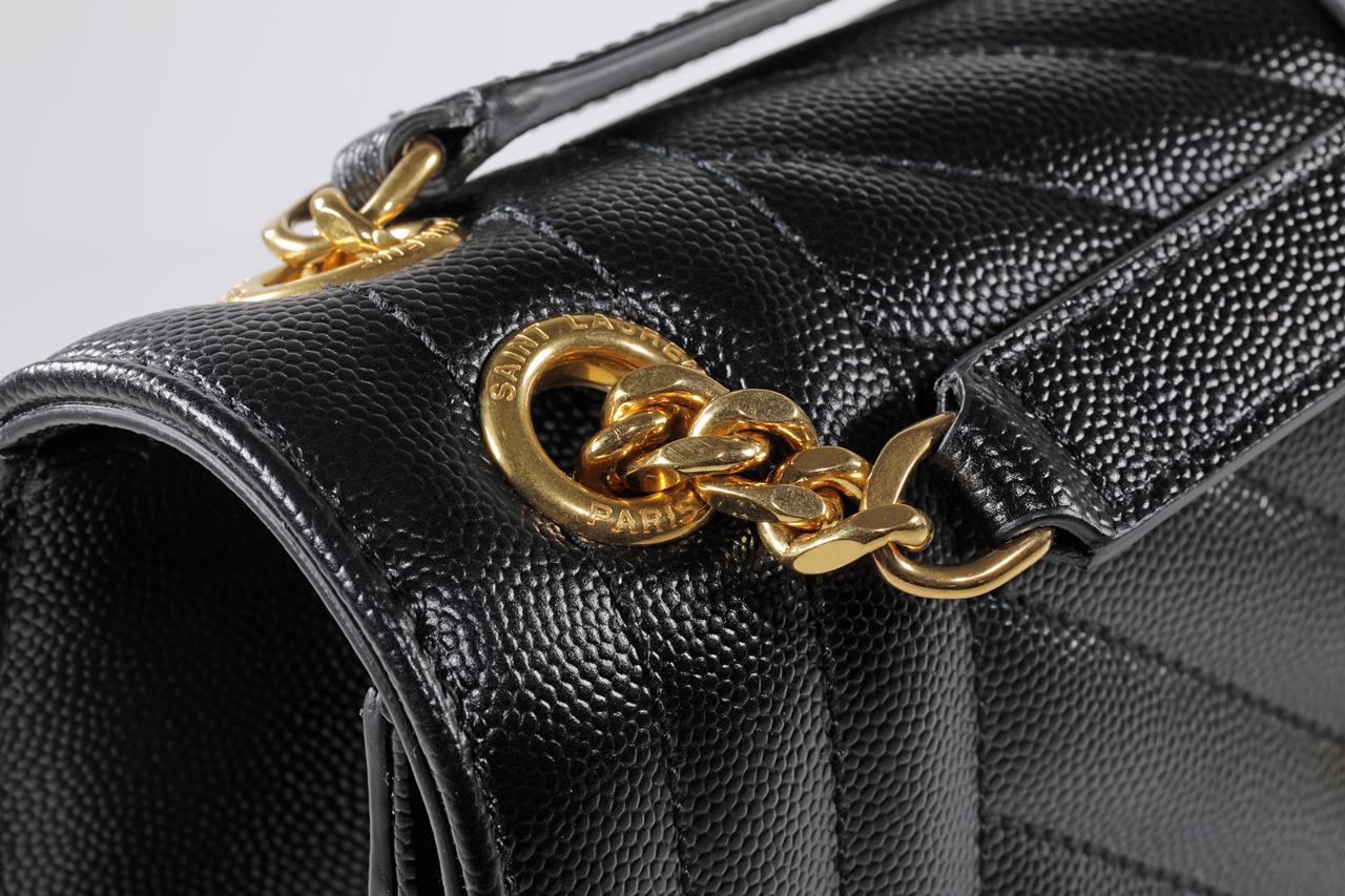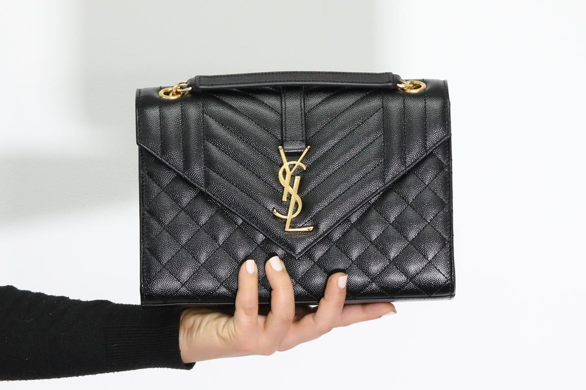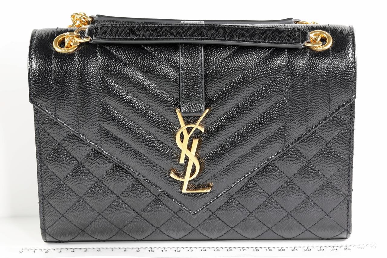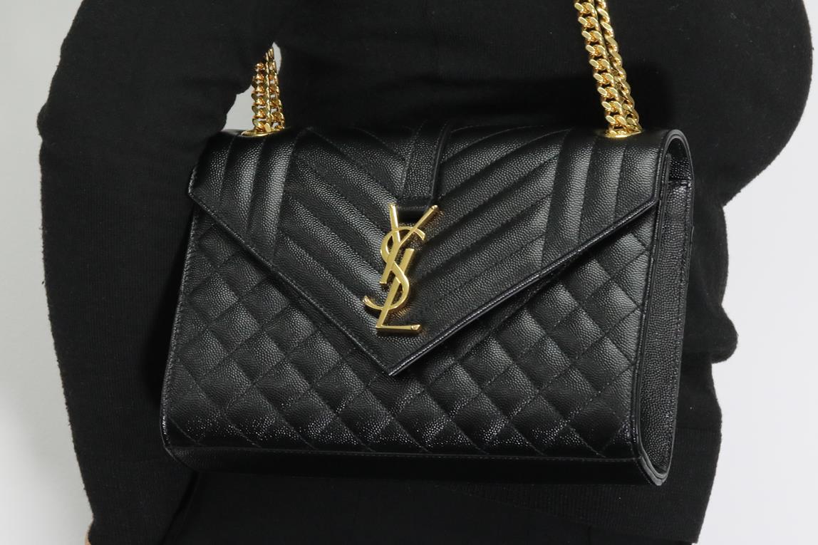 Saint Laurent medium monogram envelope bag with a front flap and snap button fastening, interlaced YSL initials and quilted seams. Leather with bronze-toned hardware. Dimensions: 24 x 17.5 x 6cm. With Entrupy certificate of authenticity, copy of Saint Laurent receipt, dustbag and Saint Laurent box. (As New)