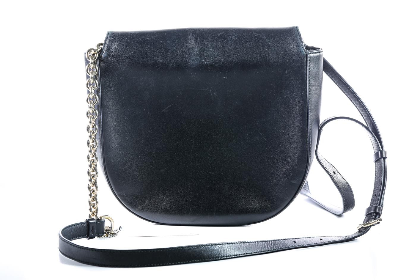 Salvatore Ferragamo Gancini Saddle Flap Bag in black leather. Featuring black lining, gold-tone hardware, flat front pocket, and buckled closure. Approximate dimensions: 24cm (L) x 22cm (H) x 7cm (W), and 49-60cm shoulder strap drop. With Entrupy certificate of authenticity. (Pre-owned)