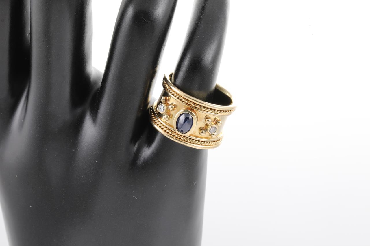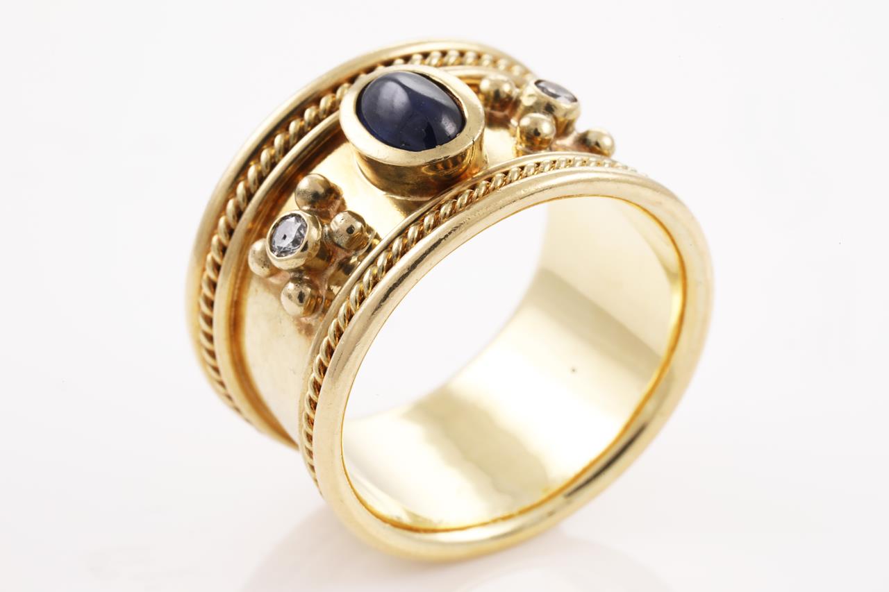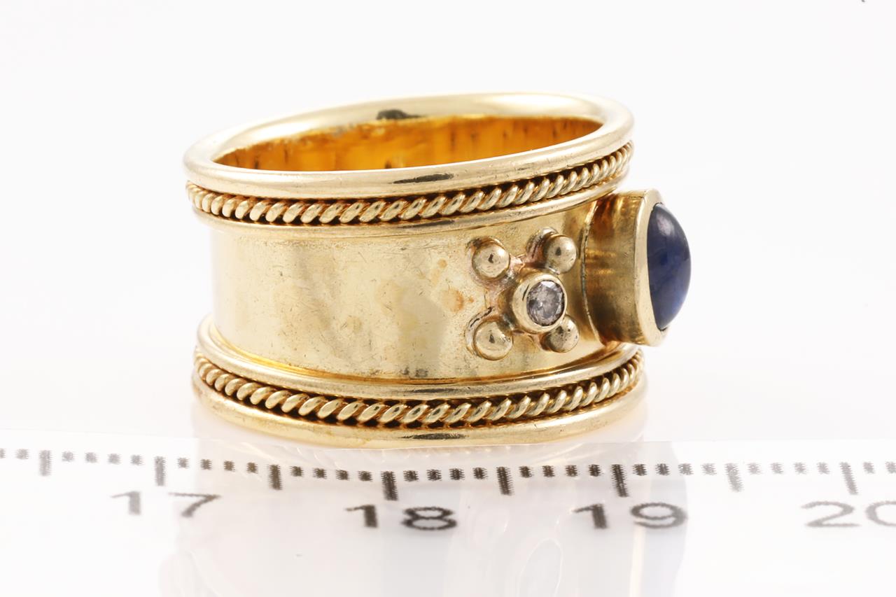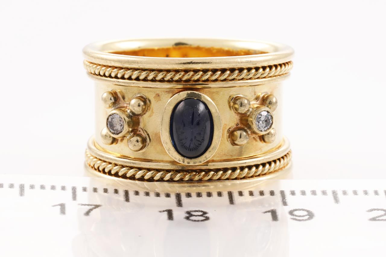 Sapphire and Diamond Ring with cabochon cut blue Sapphire of approximately 0.50ct with Diamonds totalling approximately 0.08ct. 18ct yellow gold. Ring size M 1/2. Weight 10.0g. (Pre-owned)