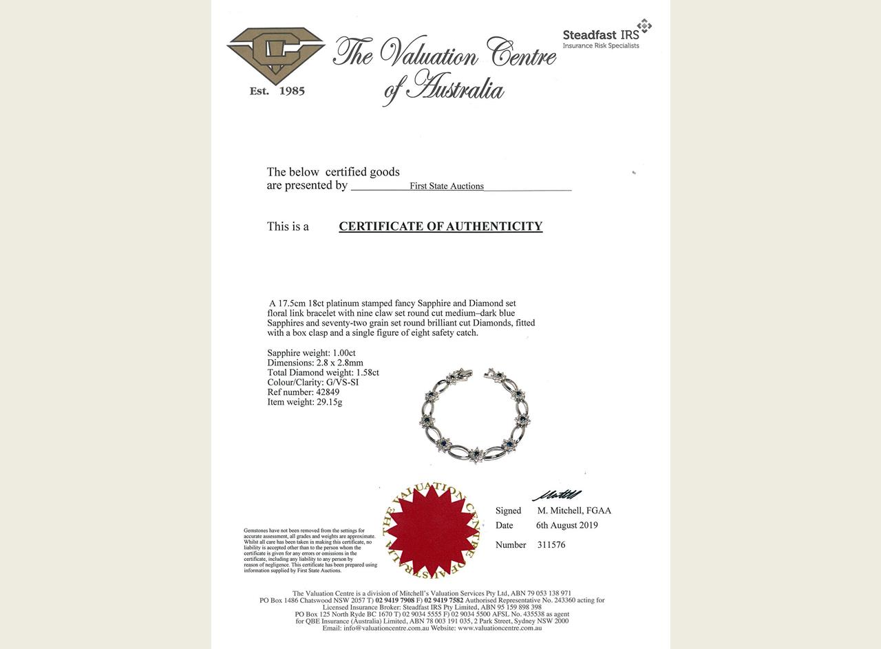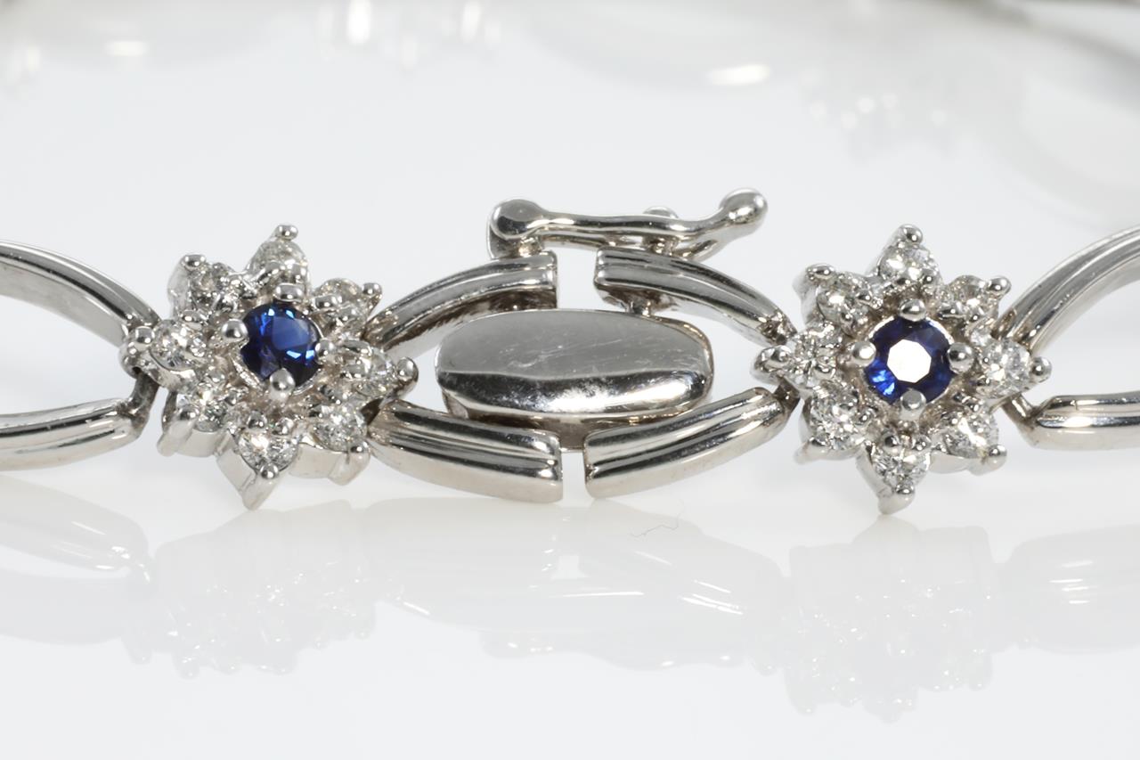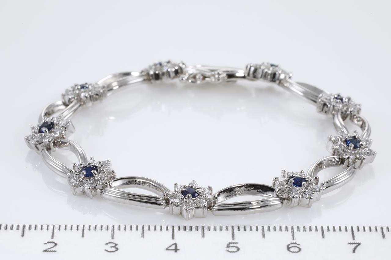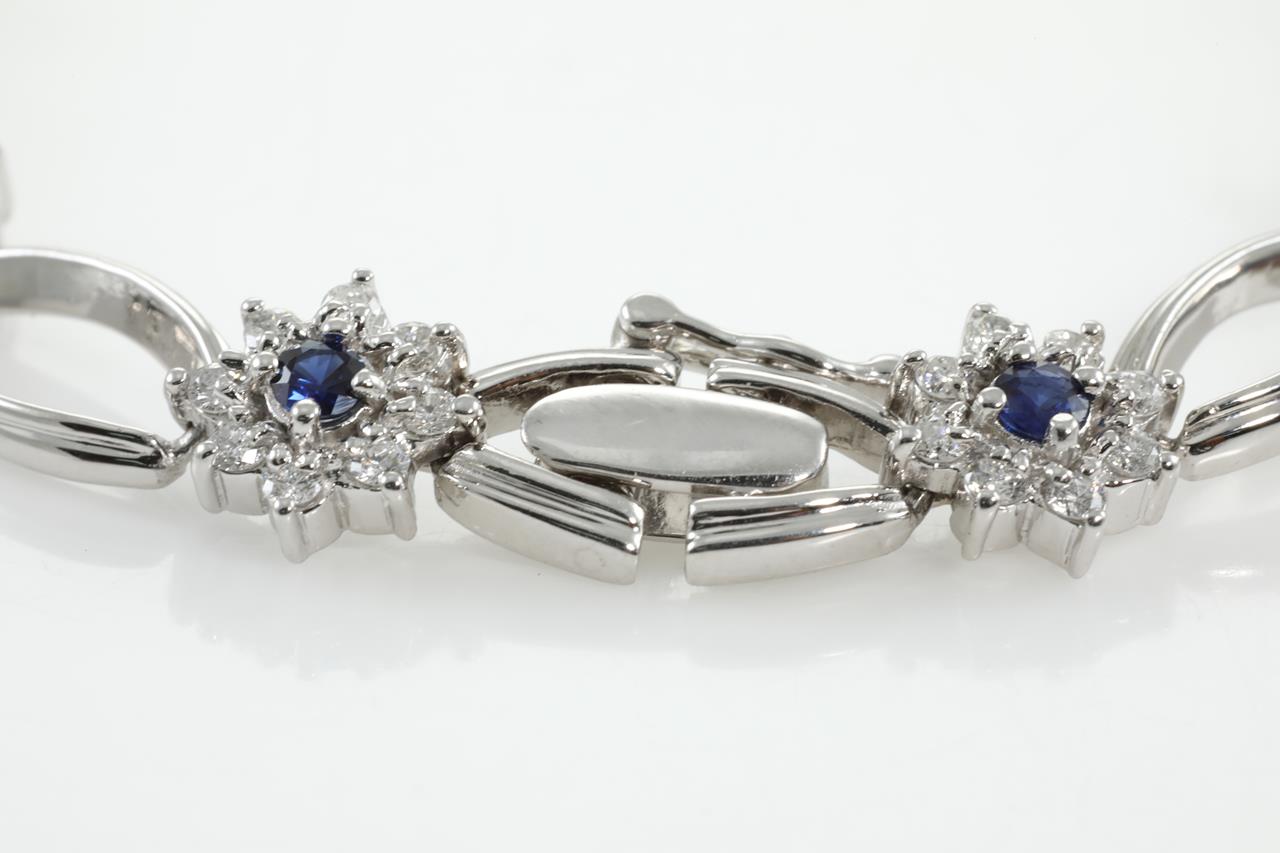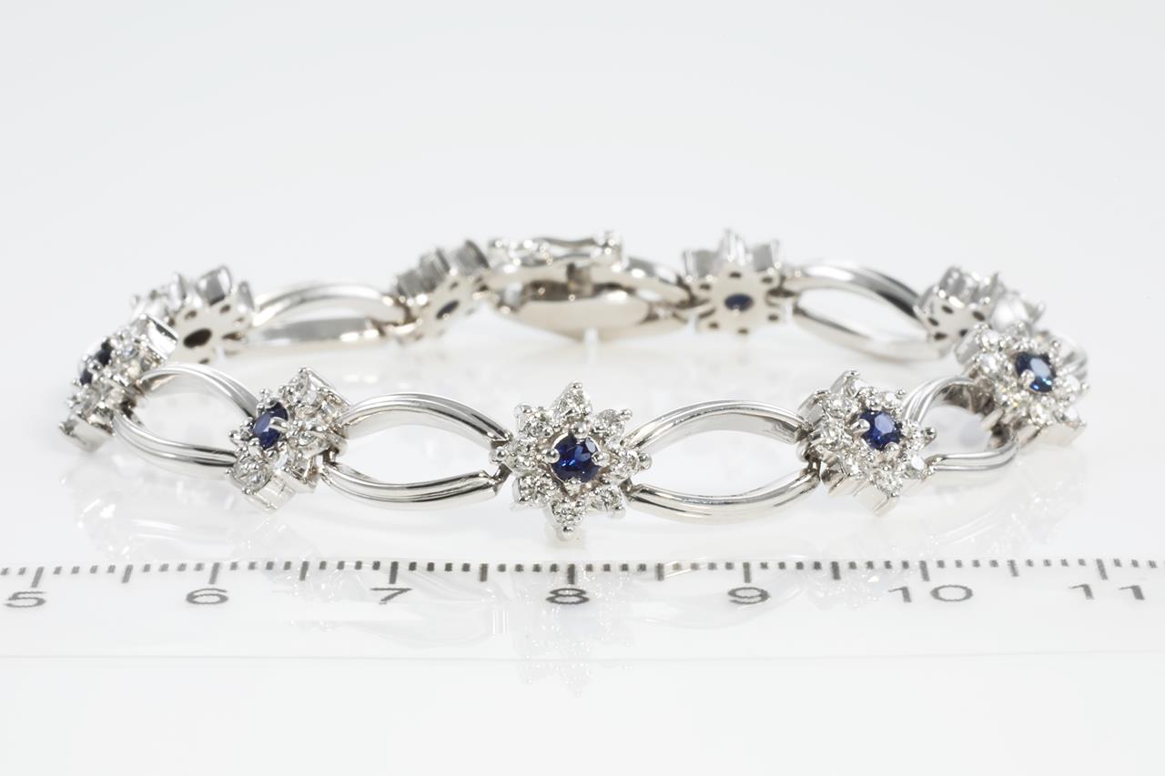 Sapphire and Diamond bracelet with round blue Sapphire totalling 1.00cts and Diamonds totalling 1.58cts (Estimated grading: G VS-SI). Platinum. Length: 17.5cm. With certificate #311576. (As new)