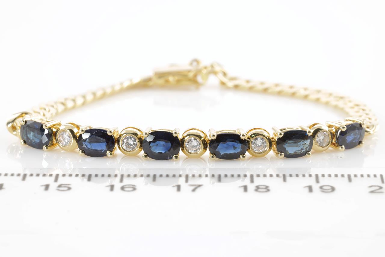 Sapphire and Diamond bracelet with oval shape Sapphires totalling approximately 2.90cts and 5 round Diamonds totalling approximately 0.60cts (Estimated grading: H P1). 18ct yellow gold with figure 8 safety catch. Length: 17cm. Weight: 12.2g (Pre-owned)