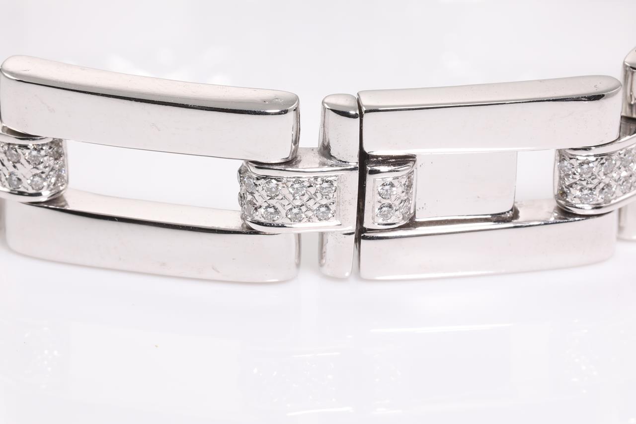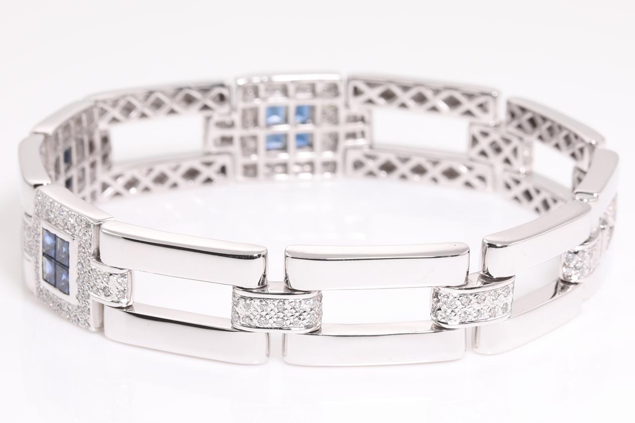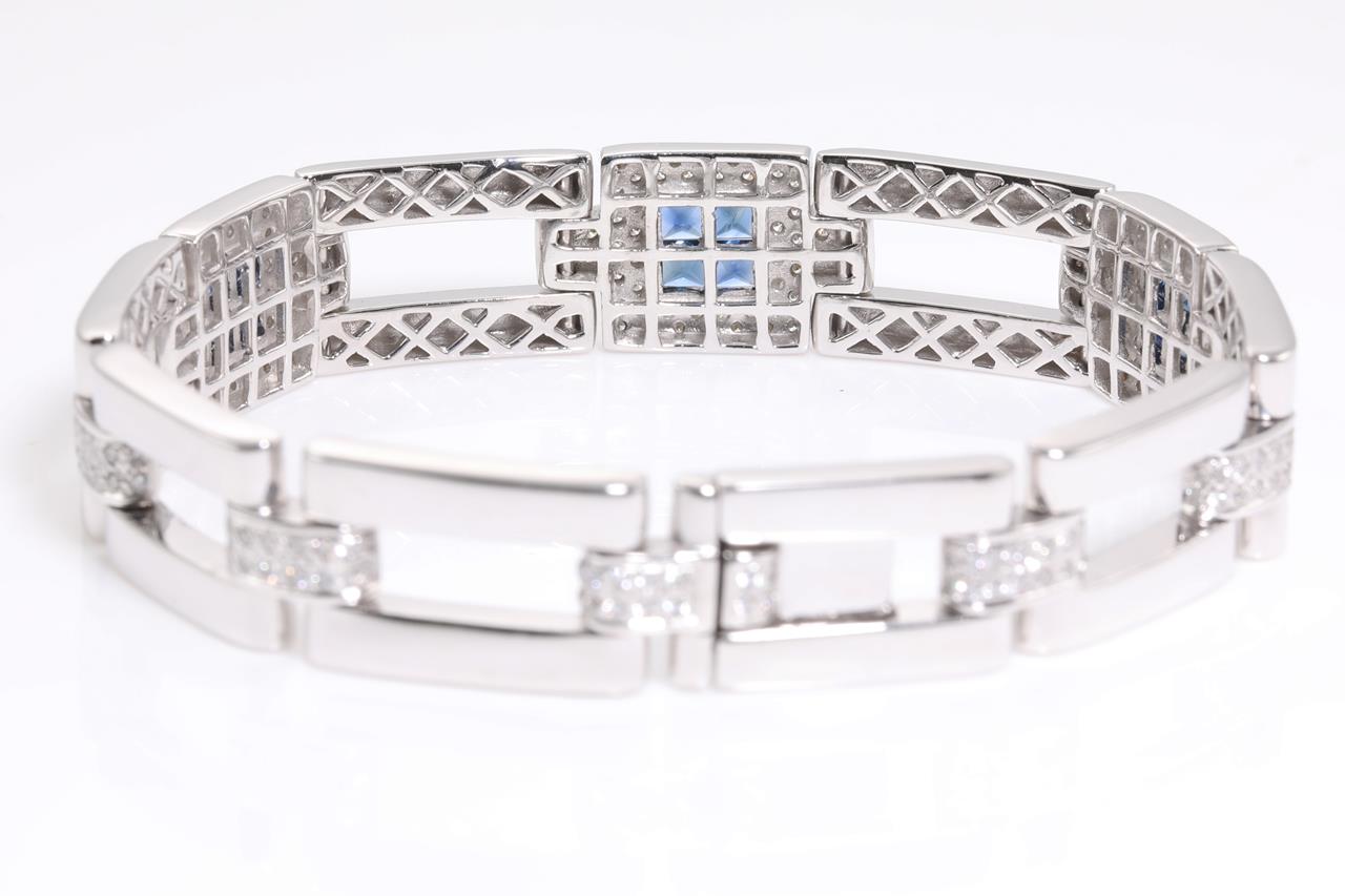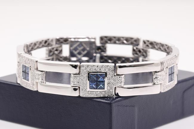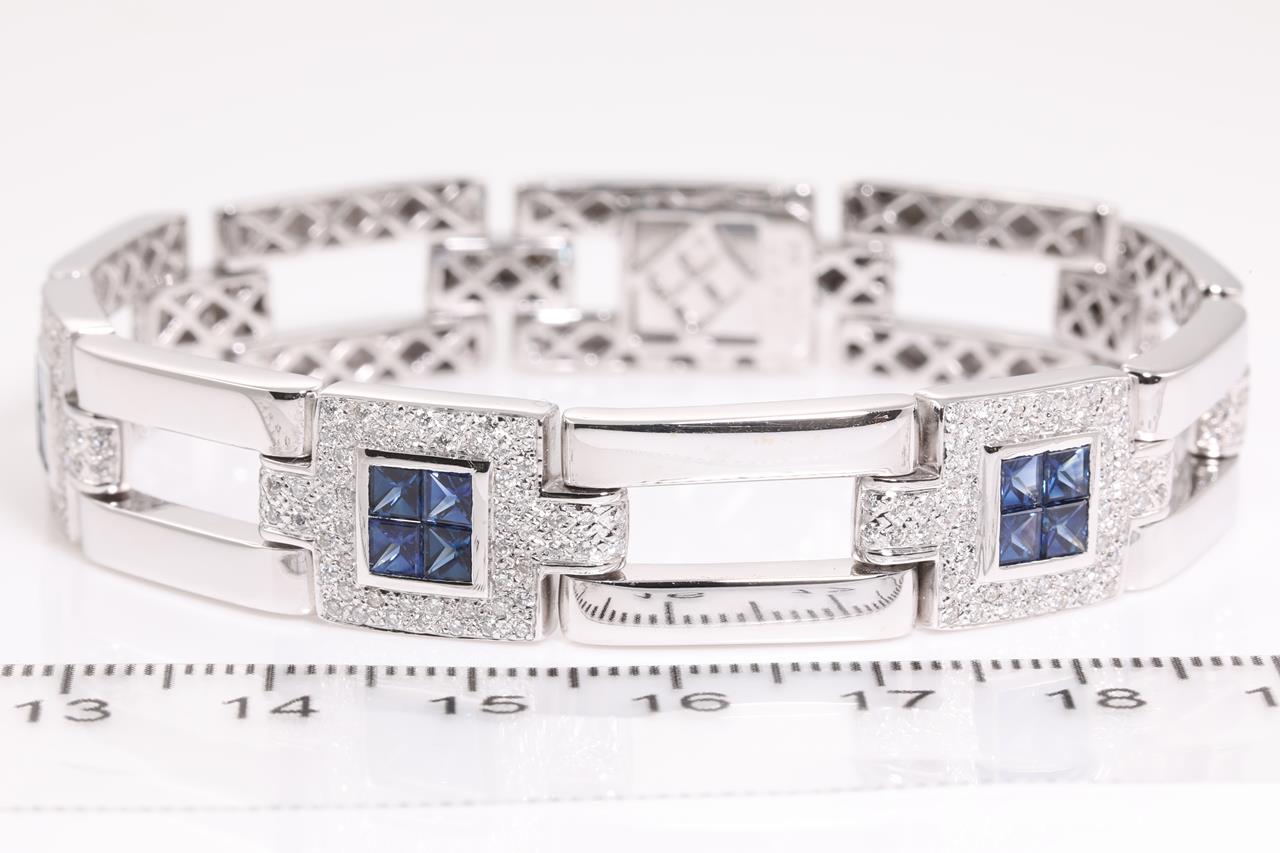 Sapphire and Diamond bracelet with princess cut blue Sapphire totalling 3.03cts and Diamonds totalling 1.41cts (Estimated grading: H VS). 18ct white gold. Length: 19cm. Weight: 42.4g. With certificate #414642. (Pre-owned)