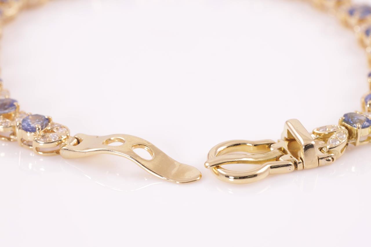 Sapphire and Diamond Bracelet with 21 oval cut Sapphires totalling 8.00cts and Diamonds totalling 1.25cts (Estimated grading: G-H P1-2). 18ct yellow gold. Length: 18cm Weight: 16.8g (Pre-owned)