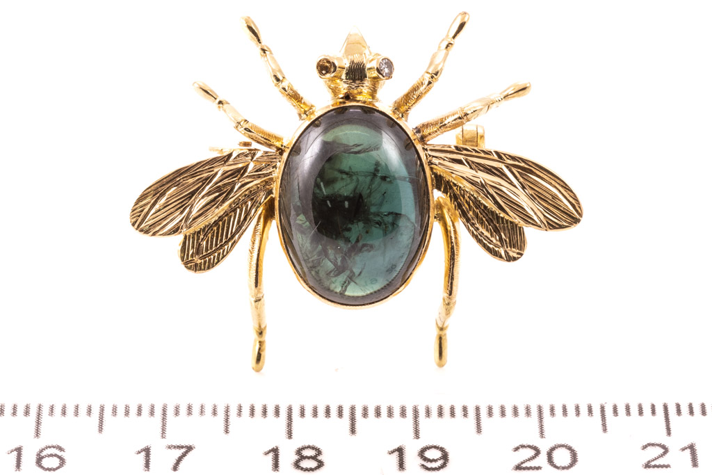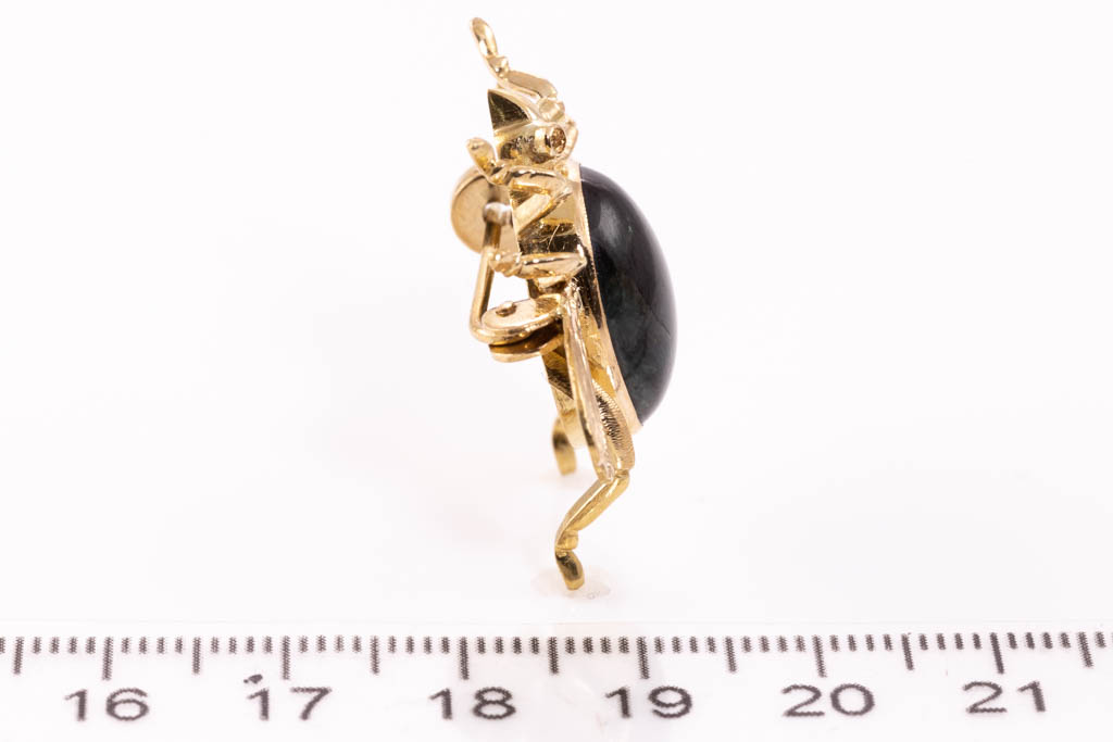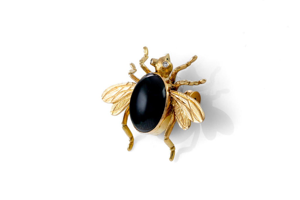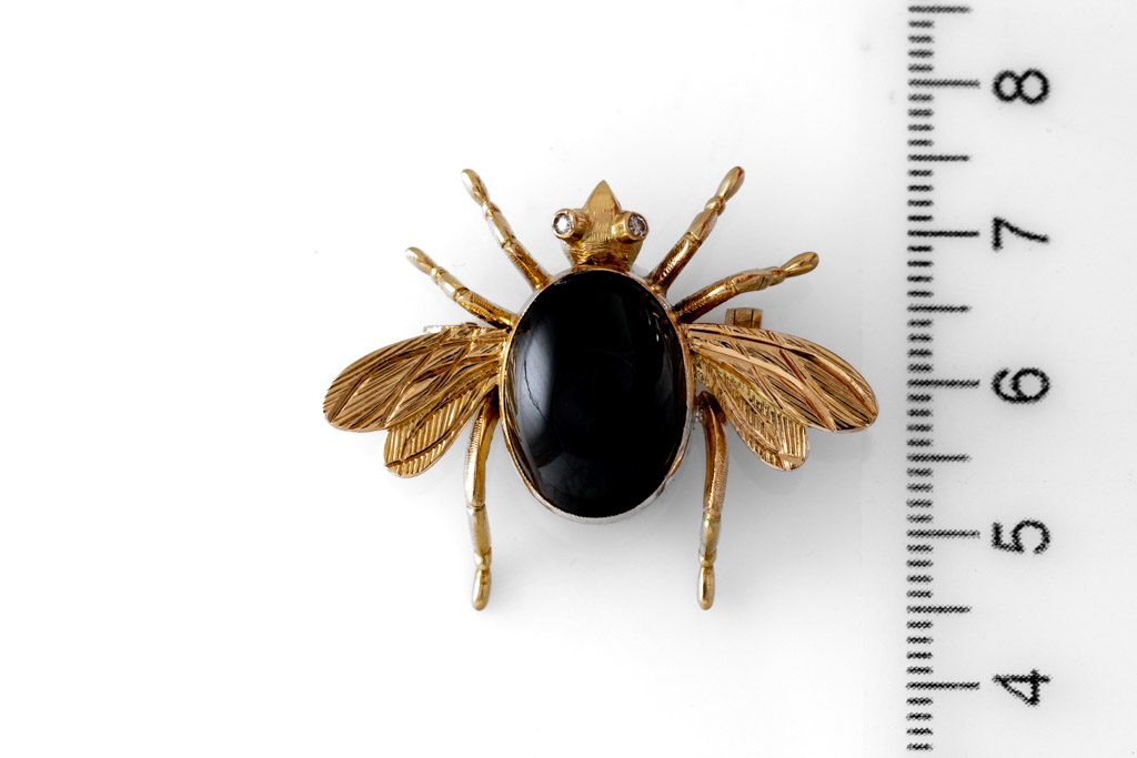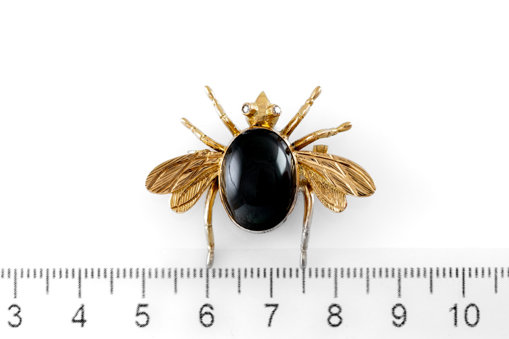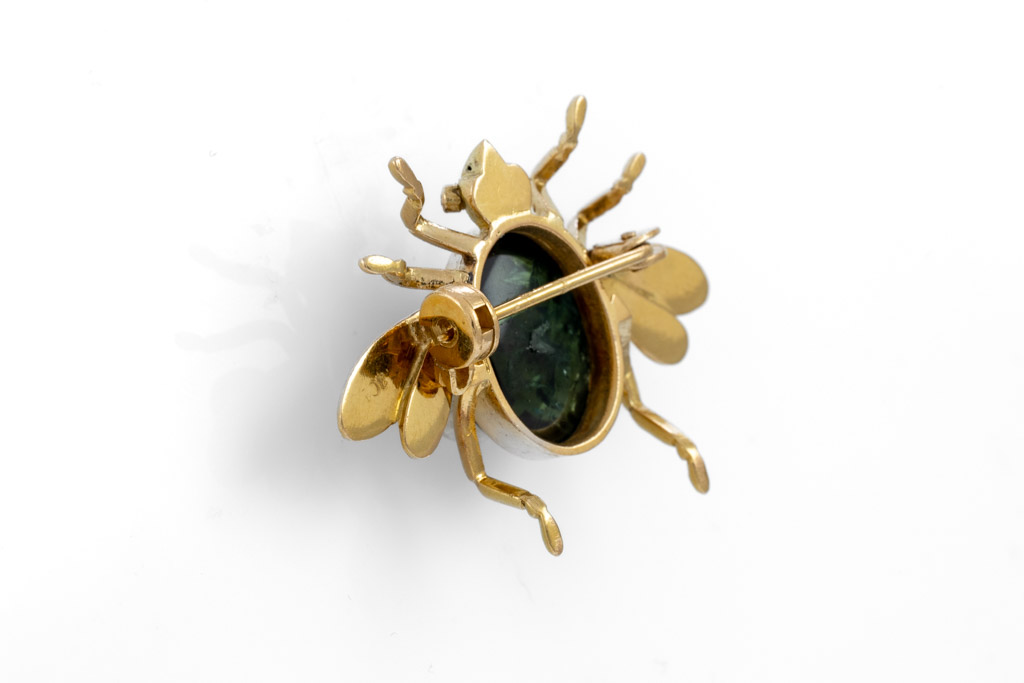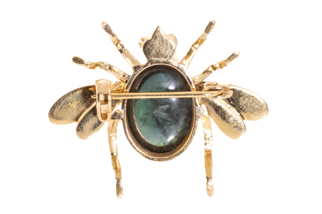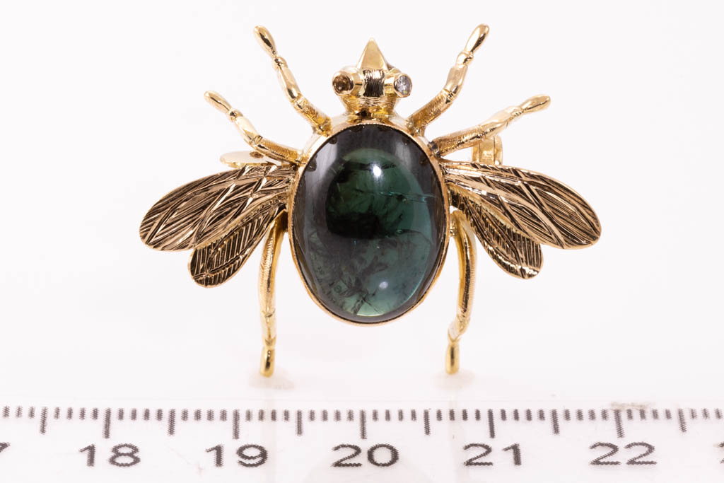 Sapphire and Diamond Fly design brooch with an oval cabochon greenish blue Sapphire of approximately 10.00ct (Sapphire with surface reaching inclusions) and 2 Diamonds totalling 0.02cts. 18ct yellow gold. Weight: 9.2g. (Pre-owned)