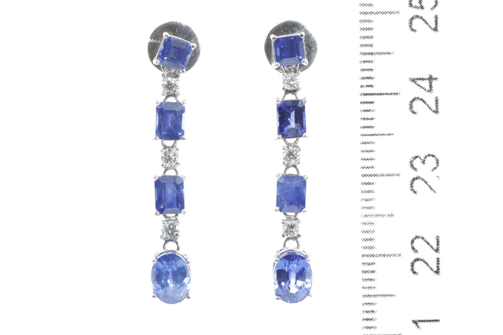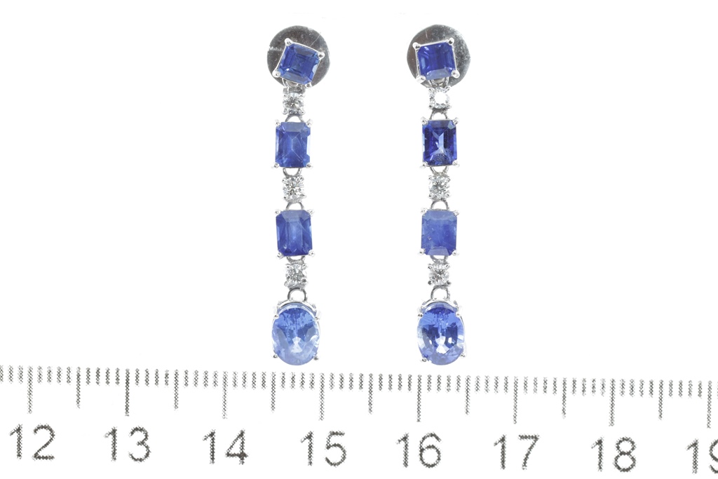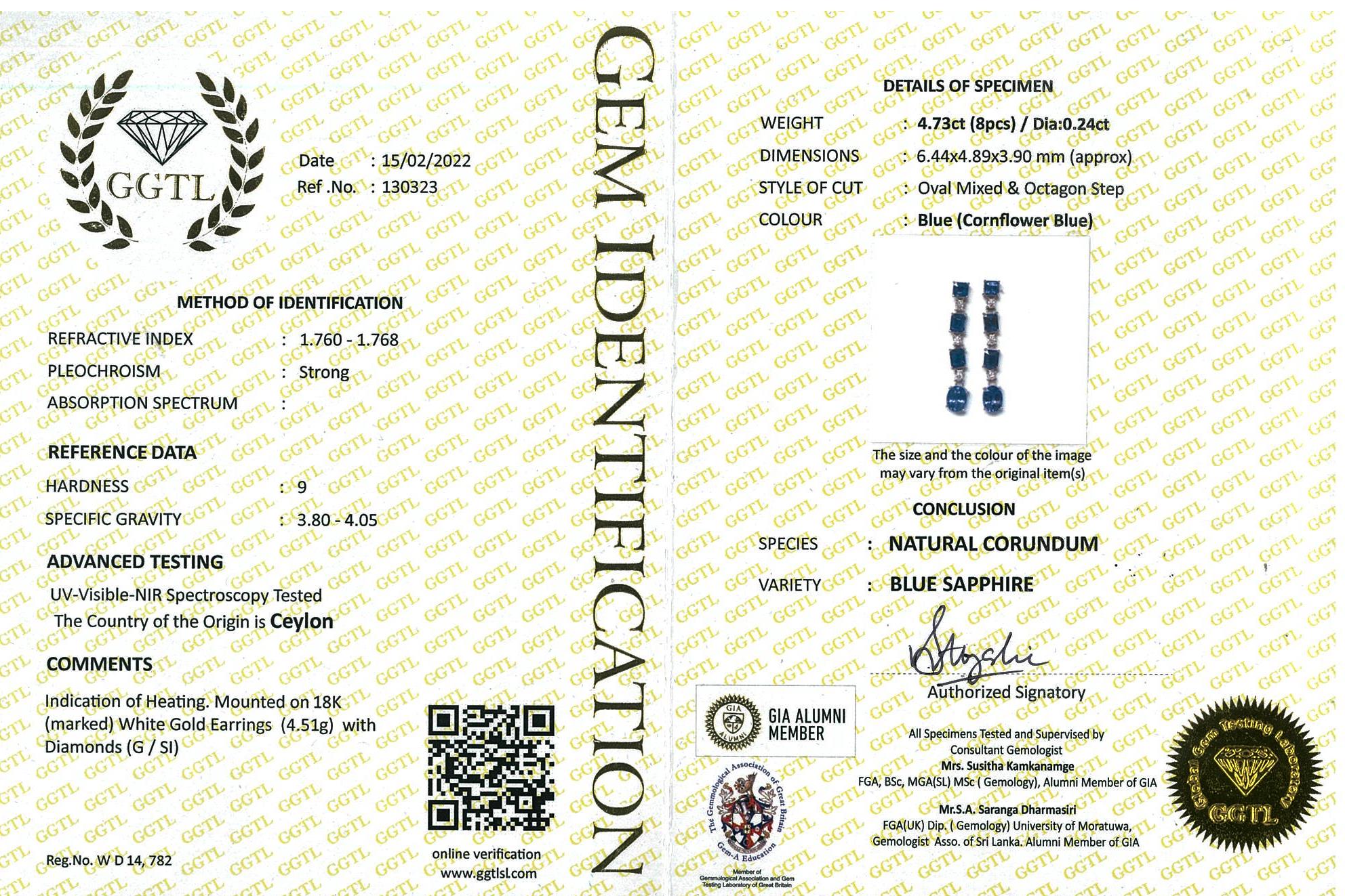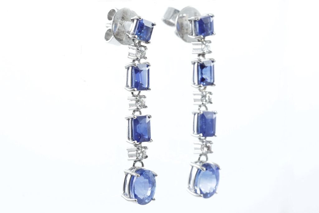 Sapphire and Diamond drop earrings with Cornflower Blue oval & emerald cut Ceylon Sapphires totalling 4.73cts and round Diamonds totalling 0.24cts. 18ct white gold. Weight 4.5g. With GGTL report #130323. (As New)