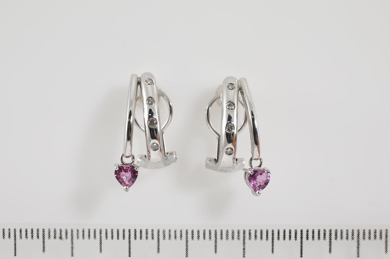Sapphire and Diamond clip-on (pierced and non pierced) earrings with heart shape pink Sapphires totalling 0.61cts and Diamonds totalling 0.10cts. 18ct white gold. Weight 5.6g. (Pre-owned)
