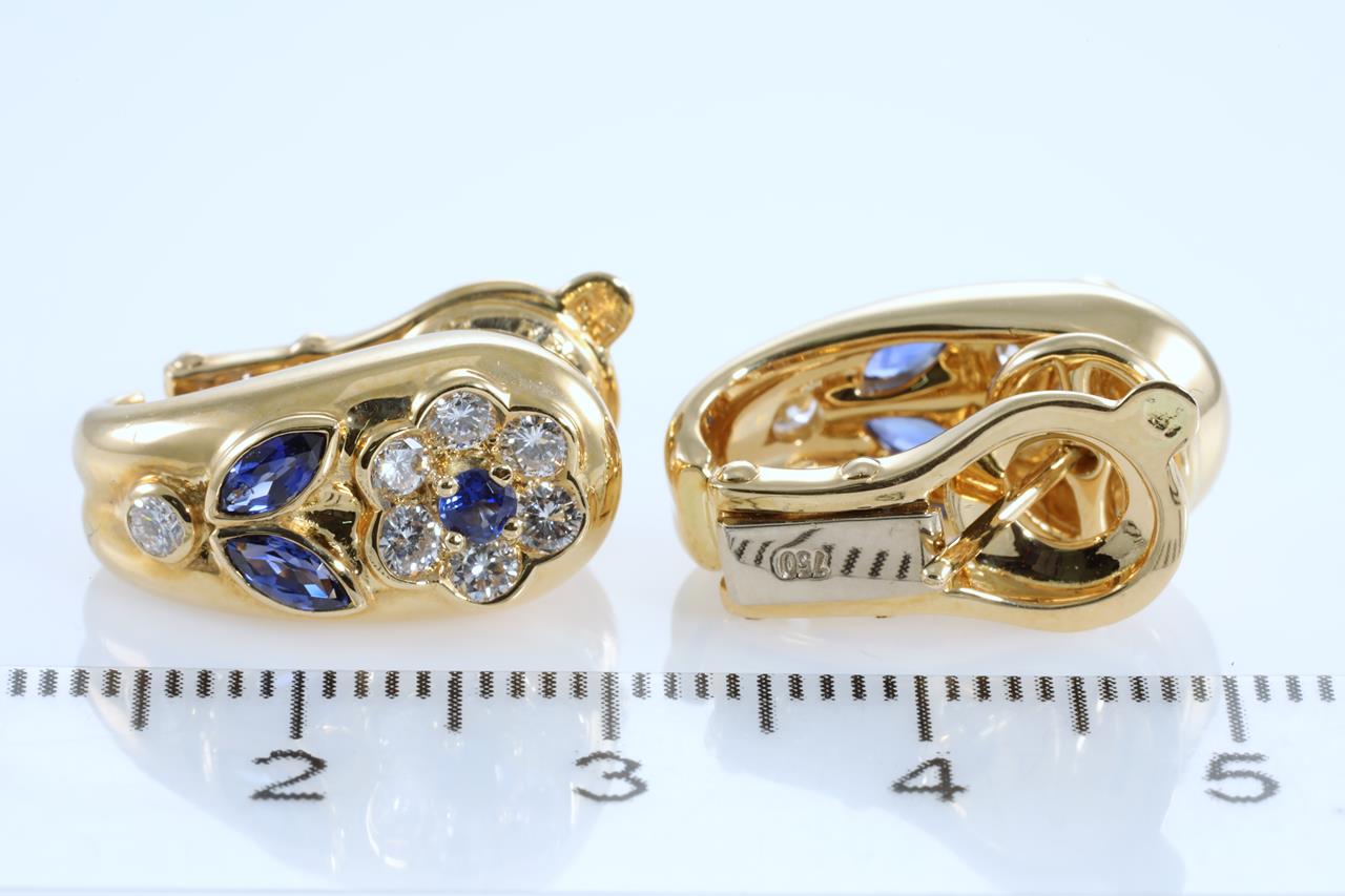 Sapphire and Diamond earrings with round and marquise cut blue Sapphires totalling 0.65cts and Diamonds totalling 0.86cts (Estimated grading: H VS-SI). 18ct yellow gold. (Pre-owned)