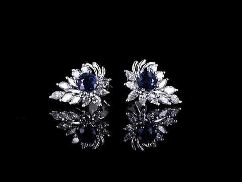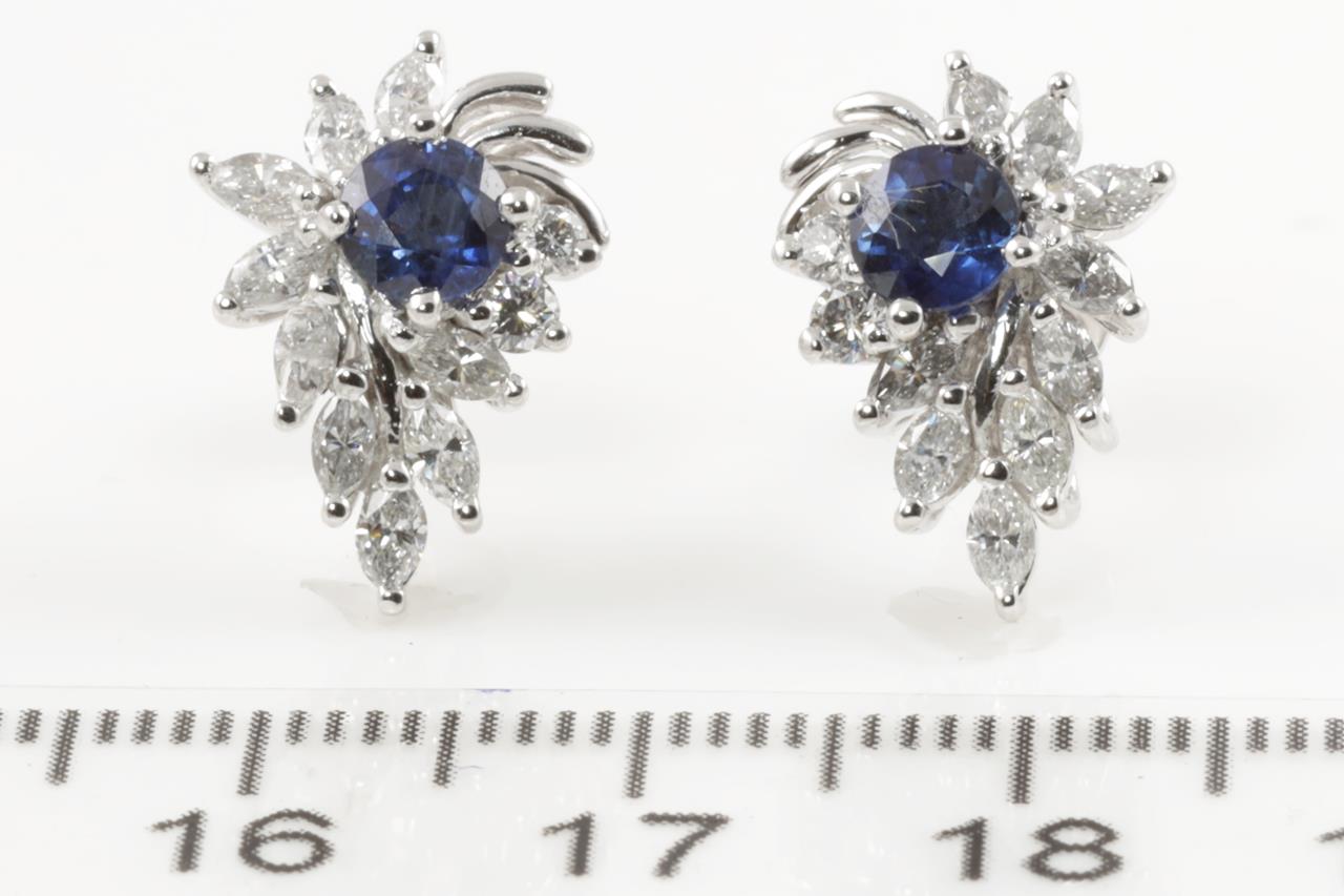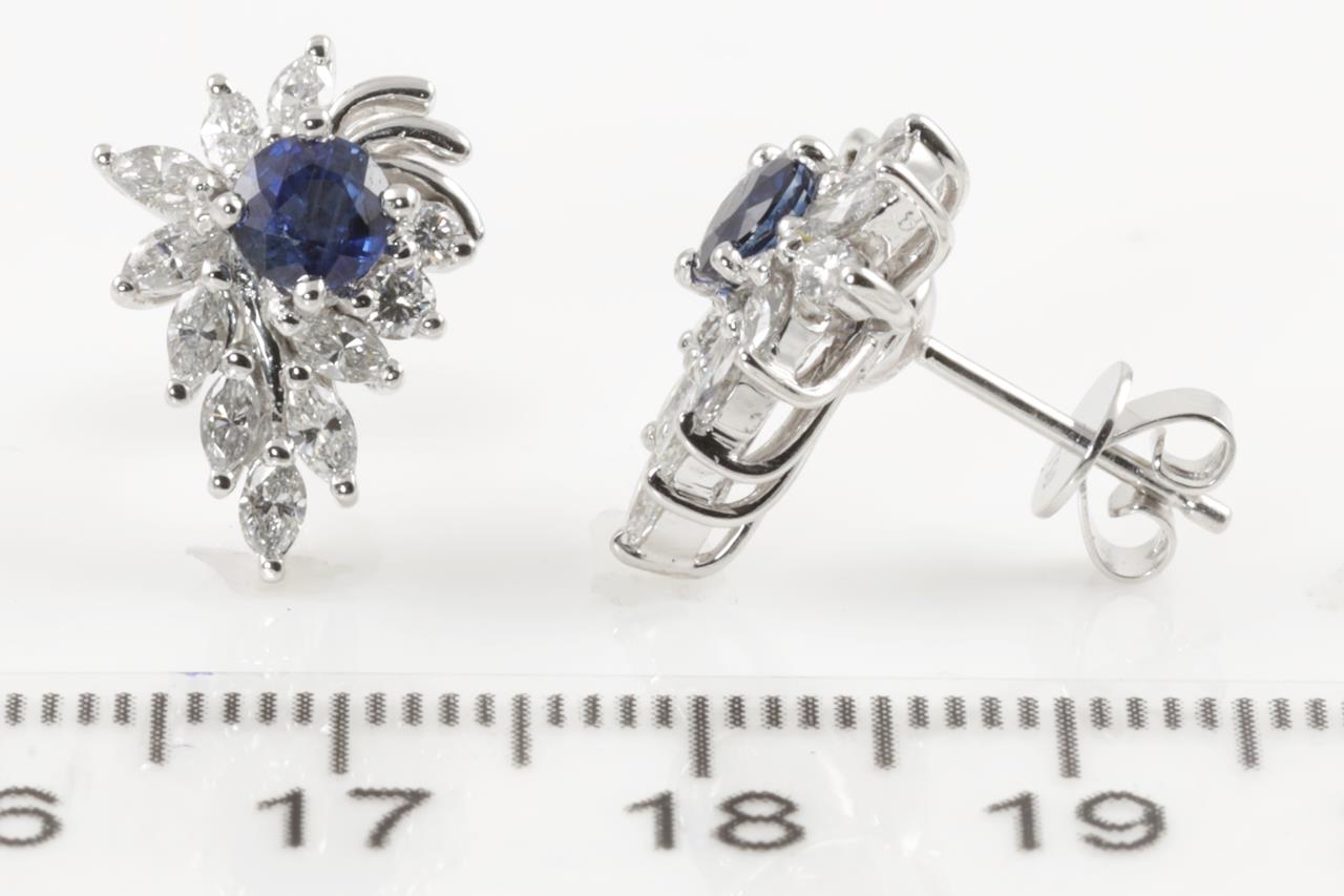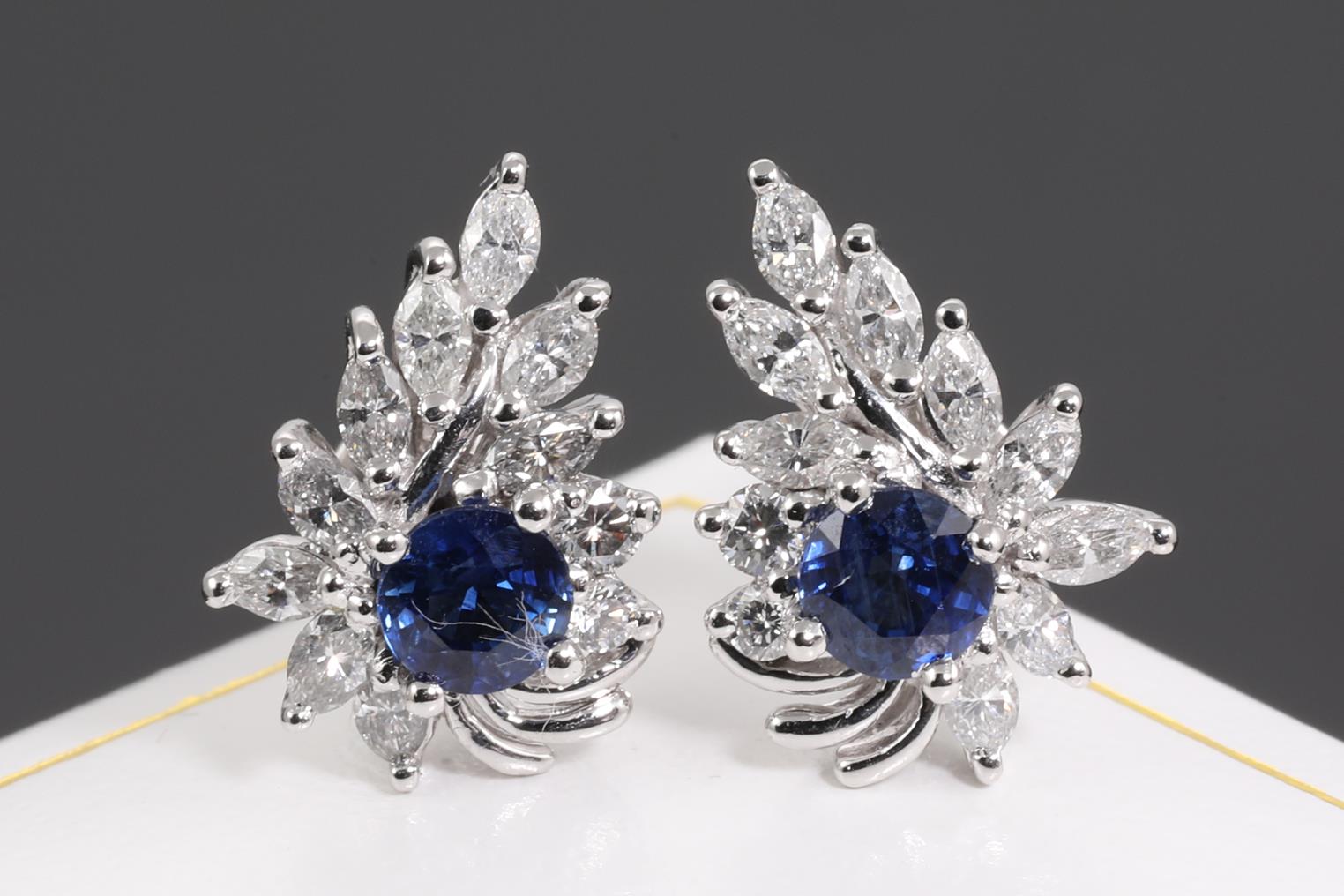 Sapphire and Diamond stud earrings with round blue Sapphires totalling 0.78cts with round and marquise cut Diamonds totalling 1.25cts (Estimated grading: FGH SI). Platinum. Weight: 5.8g (Pre-owned)