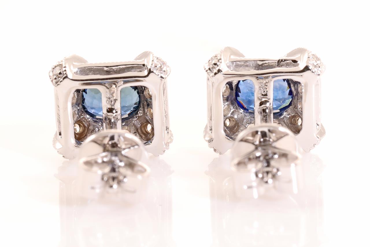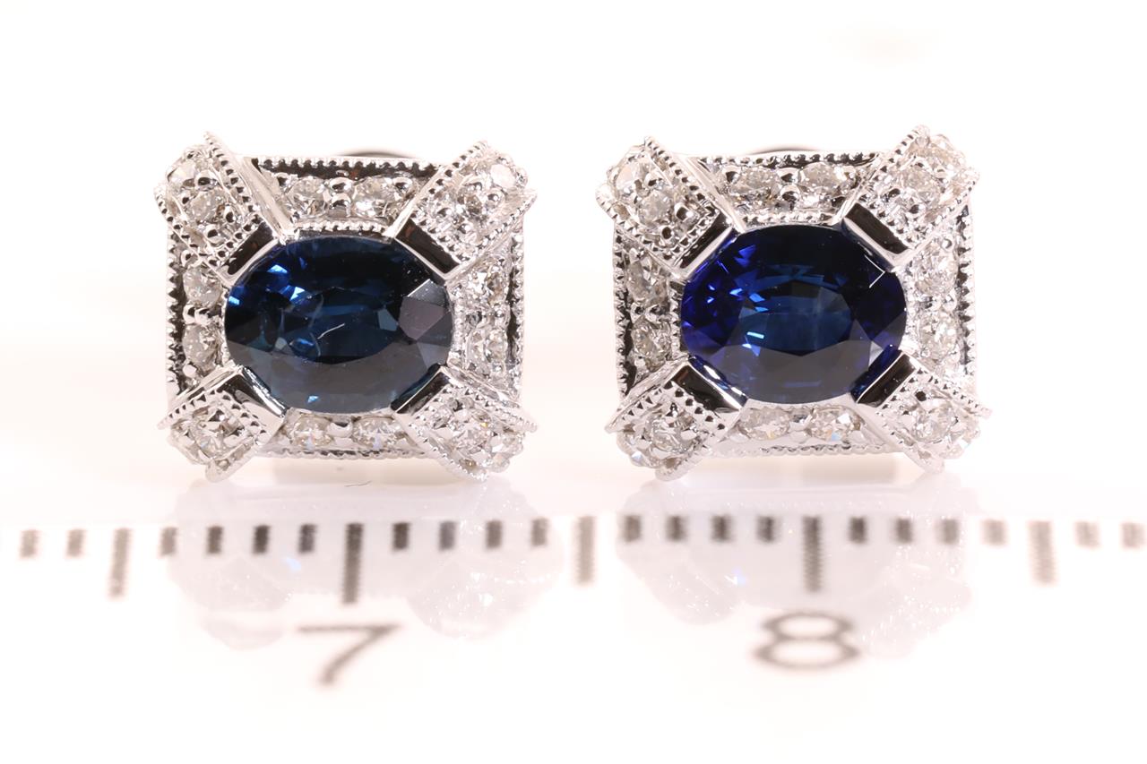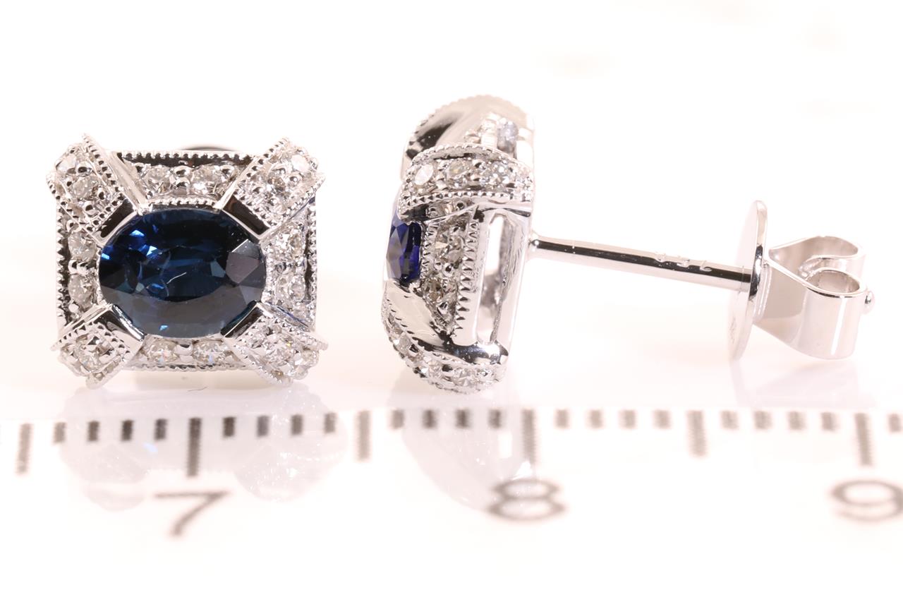 Sapphire and Diamond earrings with oval blue Sapphire totalling 0.82cts and Diamonds totalling 0.26cts. 18ct white gold. Weight: 2.6g. (New)