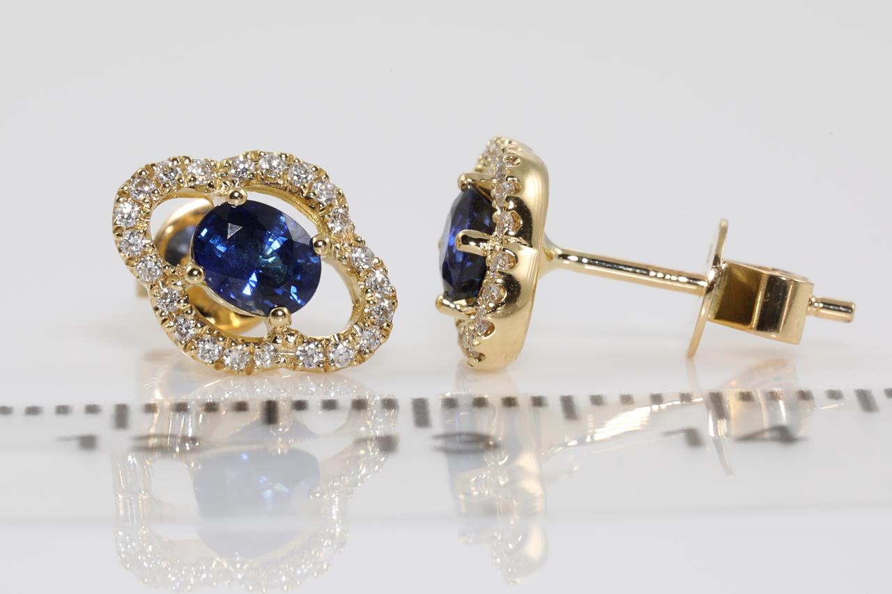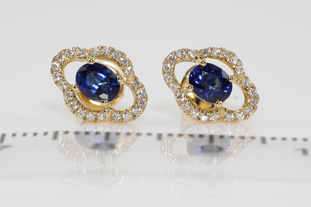 Sapphire and Diamond earrings with oval blue Sapphire totalling 0.70cts and Diamonds totalling 0.16cts. 18ct yellow gold. Weight: 2.3g. (New)