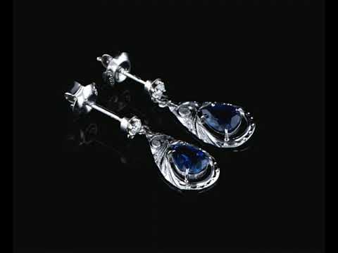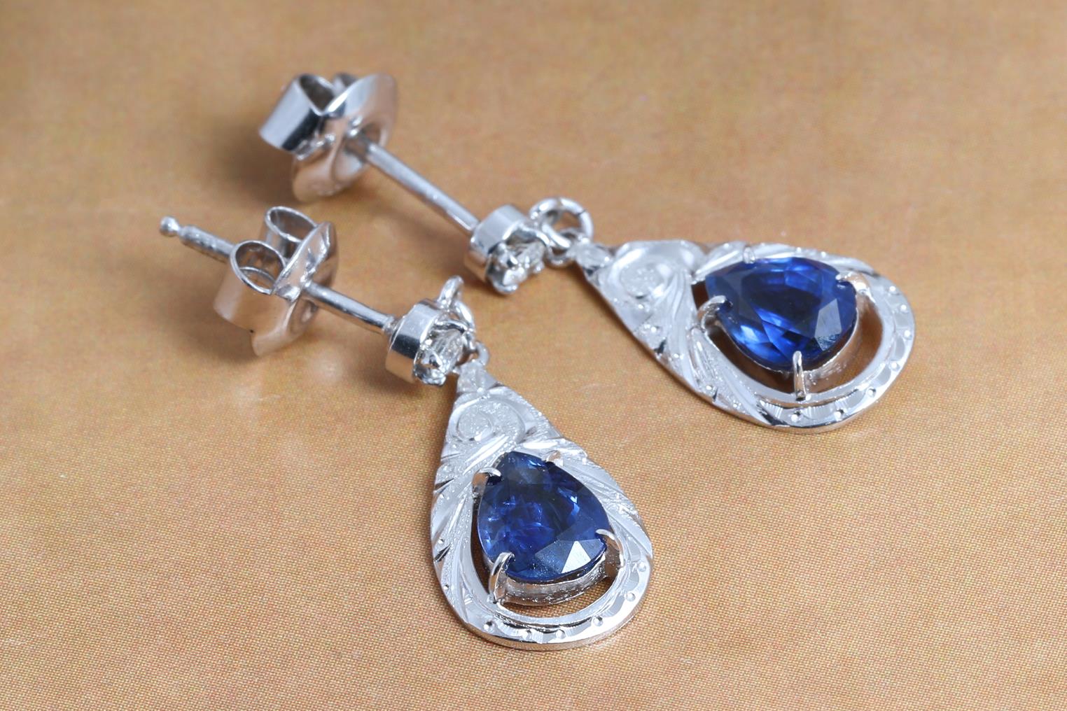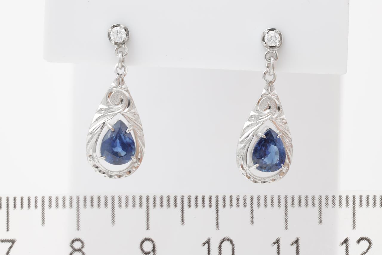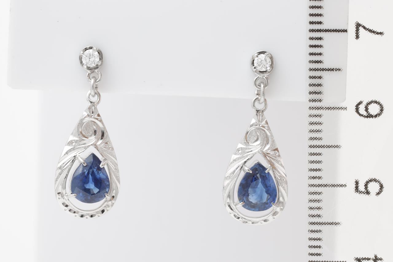 Sapphire and Diamond earrings with pear shape blue Sapphires totalling approximately 1.50cts and Diamonds totalling approximately 0.08cts. Platinum. Weight: 3.2g. (Pe-owned)