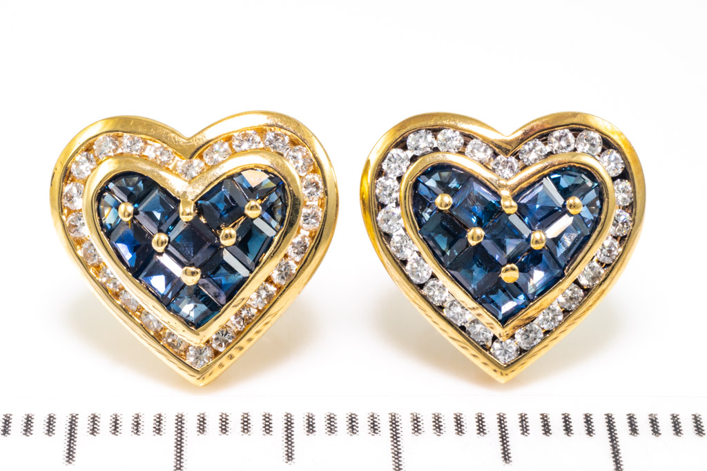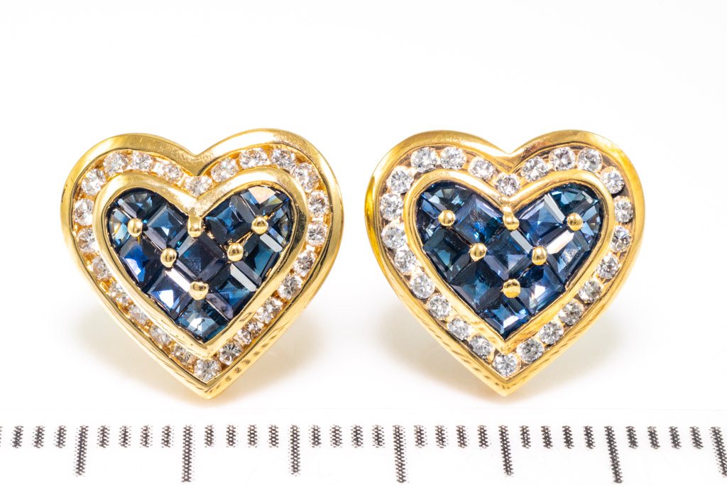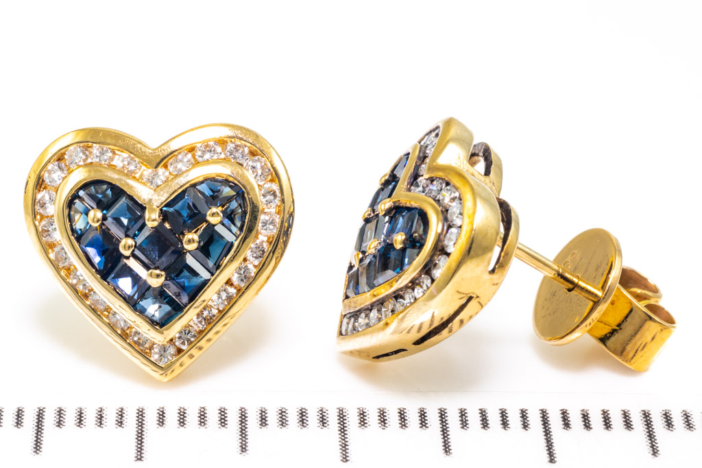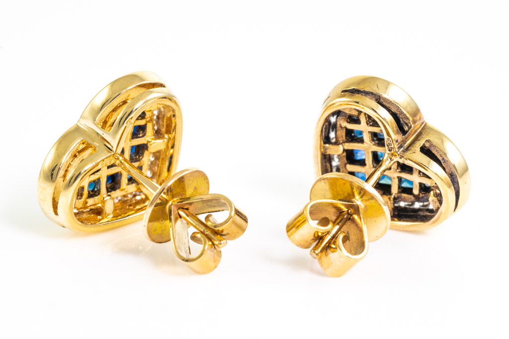 Sapphire and Diamond earrings with carre cut blue Sapphires totalling 0.40cts and round Diamonds totalling 0.48cts (Estimated grading: H-J SI). 14ct yellow gold with 14ct yellow gold backs. Weight: 5.5g. (Pre-owned)
