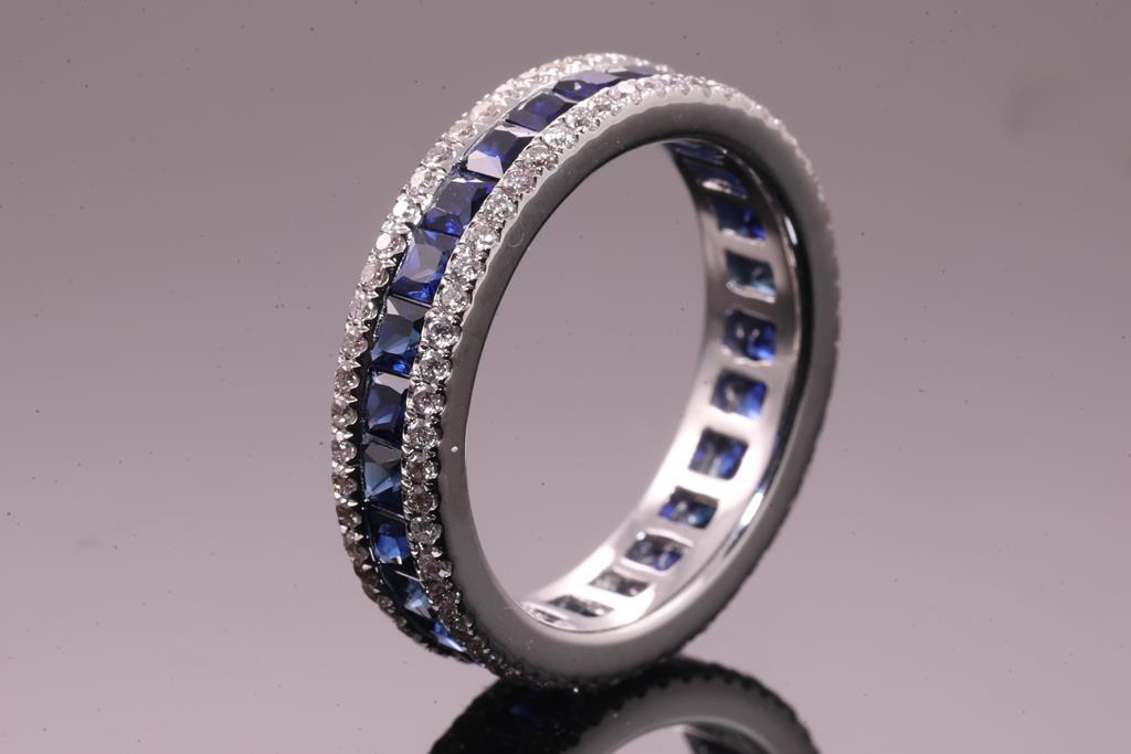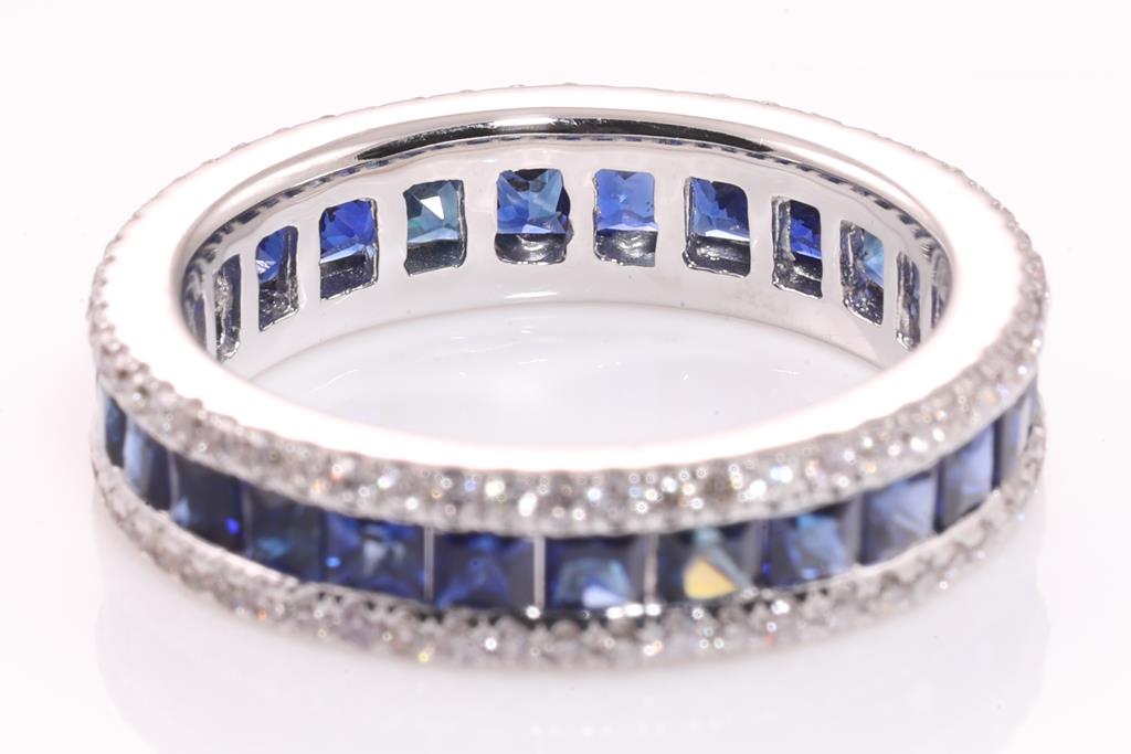 Sapphire and Diamond full hoop ring with princess cut blue Sapphires totalling 2.60cts and Diamonds totalling 0.60cts (Estimated grading: H SI). 18ct white gold. Ring size: L1/2 - ring resizing is not recommended. Weight: 5.2g. (Pre-owned)