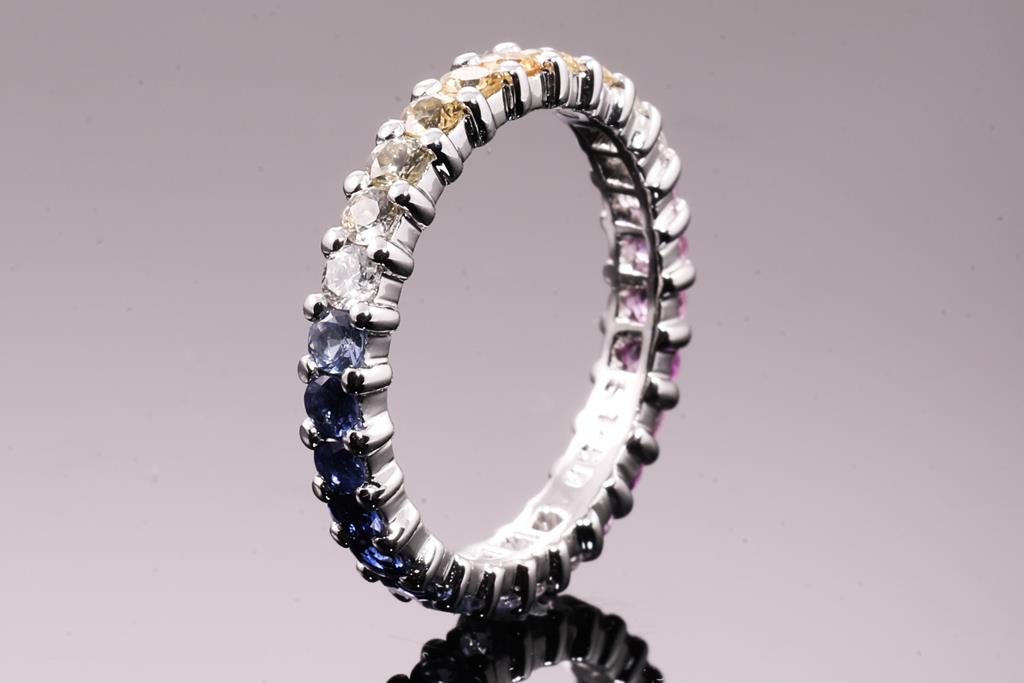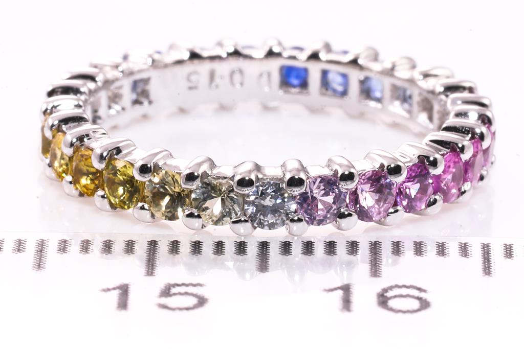 Sapphire and Diamond full hoop ring with round multi-colour Sapphires totalling 1.59cts and round Diamonds totalling 0.15cts. 18ct white gold. Ring size M - ring resizing is not recommended. Weight: 3.4g. (Pre-owned)